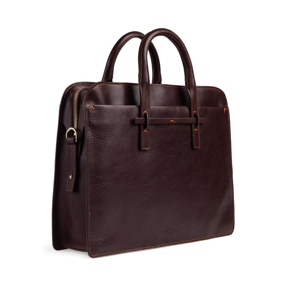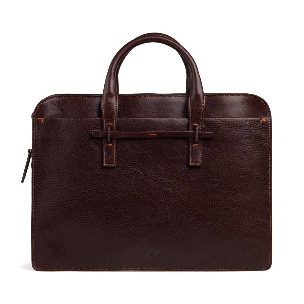 Вместительная сумка Boldrini Selleria на молнии. Выполнена из тёмно-коричневой натуральной кожи с зернистой фактурой. Строчка выполнена контрастной нитью. Внутри одно отделение с карманами для ценных вещей, портмоне, телефона и визиток, а также секция для ноутбука с диагональю 15 дюймов; снаружи имеется два кармана для необходимых бумаг. Подкладка выполнена из высококачественного хлопкового текстиля бежевого цвета. Модель украшена небольшим тиснением в виде логотипа бренда. К сумке прилагается плечевой ремень. Подойдёт как для мужчин, так и для женщин.