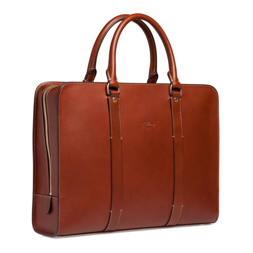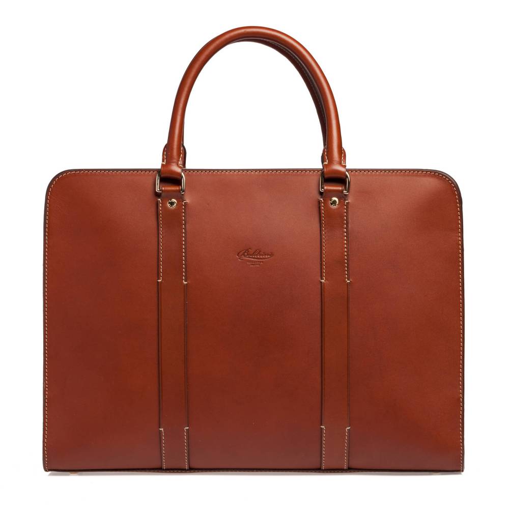 Деловая сумка (Briefcase) на молнии от итальянской мануфактуры Boldrini Selleria. Модель выполнена из аутентичной тосканской кожи растительного дубления Pelle Conciata al Vegetale в коричневом цвете. Дизайн подчеркнут контрастной строчкой и лаконичным тиснением логотипа. Подкладка из бархатистой бежевой алькантары. Внутри отделение с секцией для 15-дюймового ноутбука и карманы для документов, телефона, портмоне и визиток. Благодаря универсальному дизайну и съемному плечевому ремню в комплекте, сумка подходит как мужчинам, так и женщинам.