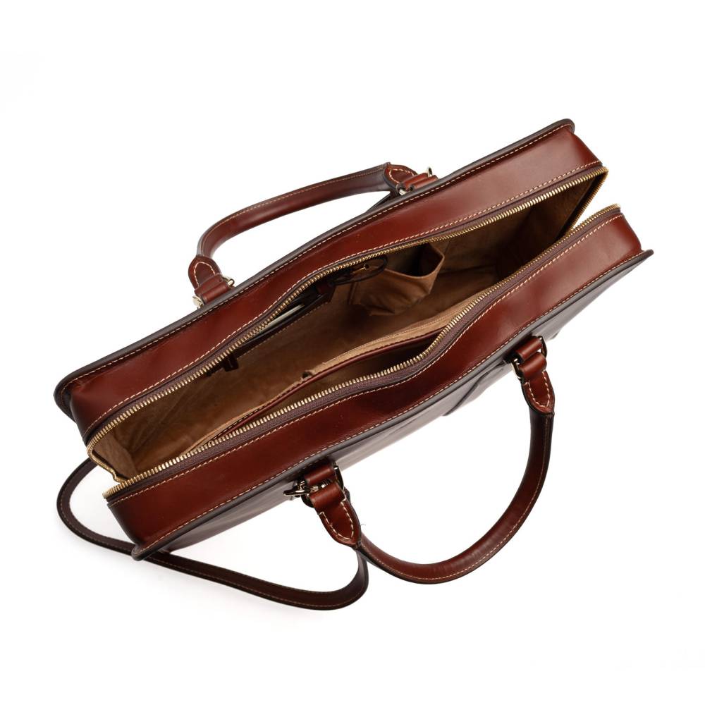 Вместительная сумка Boldrini Selleria на молнии. Выполнена из гладкой натуральной кожи коричневого цвета с контрастной строчкой. Внутри одно отделение с карманами для ценных вещей, портмоне, телефона и визиток, а также секция для ноутбука с диагональю 15 дюймов. Подкладка выполнена из высококачественной бархатистой алькантары бежевого цвета. Модель украшена небольшим тиснением в виде логотипа бренда. К сумке прилагается плечевой ремень. Подойдёт как для мужчин, так и для женщин.