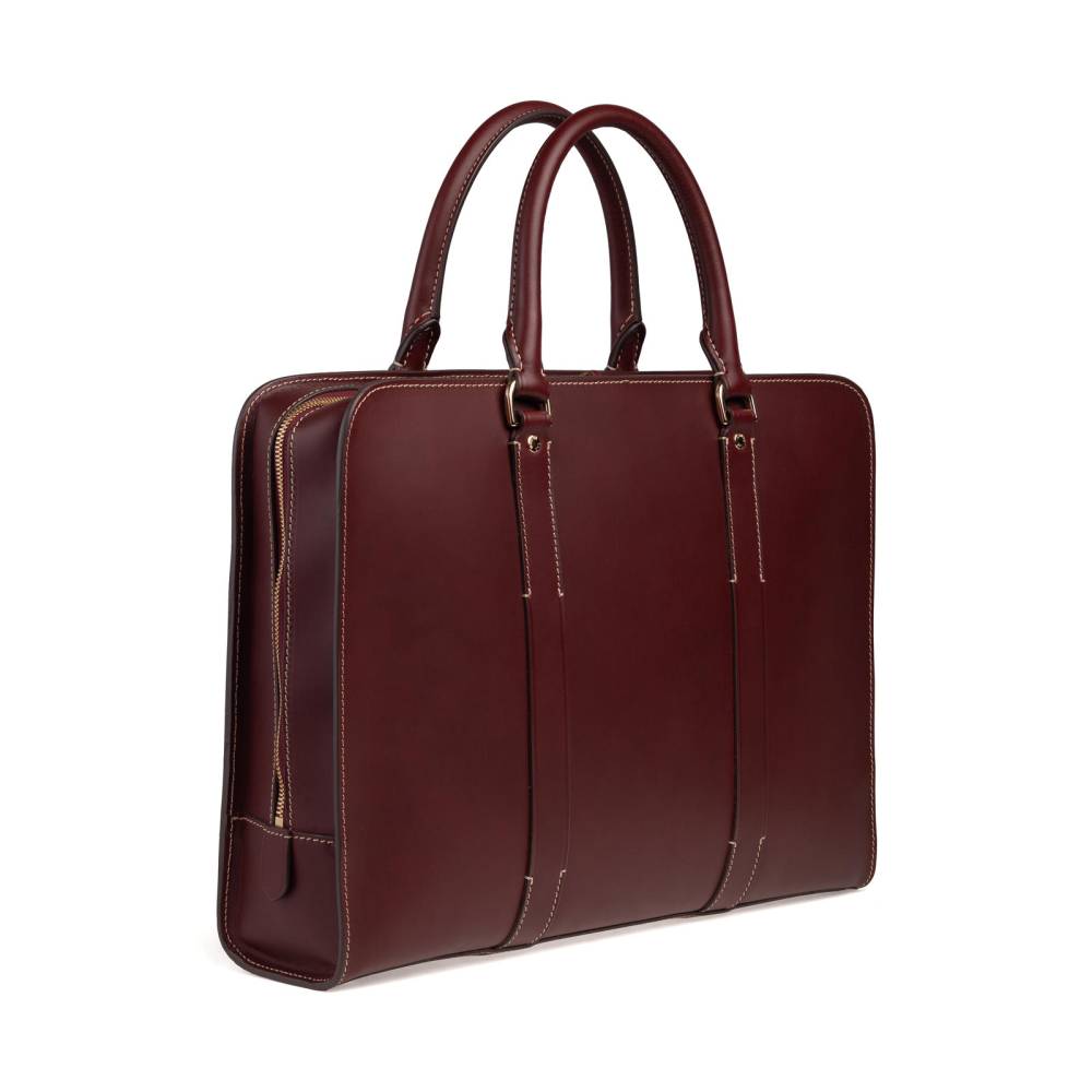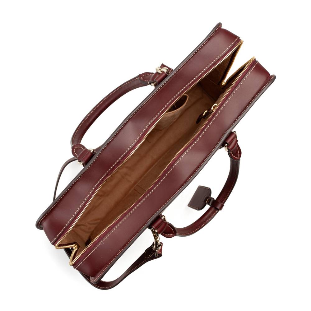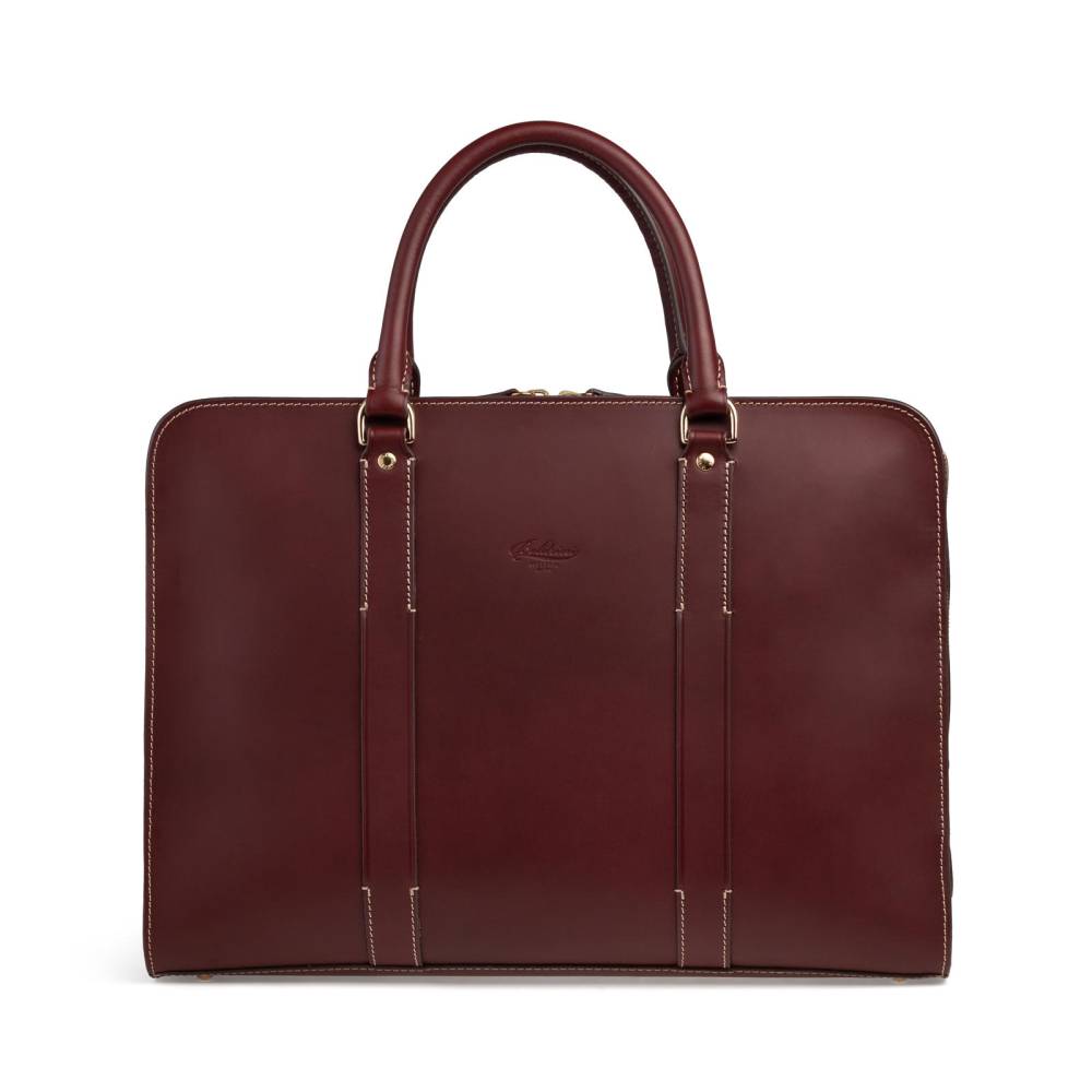 Вместительная сумка Boldrini Selleria на молнии. Выполнена из гладкой натуральной кожи бордового цвета с контрастной строчкой. Внутри одно отделение с карманами для ценных вещей, портмоне, телефона и визиток, а также секция для ноутбука с диагональю 15 дюймов. Подкладка выполнена из высококачественной бархатистой алькантары бежевого цвета. Модель украшена небольшим тиснением в виде логотипа бренда. К сумке прилагается плечевой ремень. Подойдёт как для мужчин, так и для женщин.