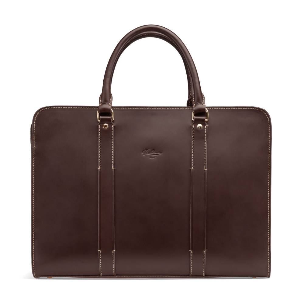 Деловая сумка (Briefcase) на молнии от итальянской мануфактуры Boldrini Selleria. Модель выполнена из аутентичной тосканской кожи растительного дубления Pelle Conciata al Vegetale в темно-коричневом цвете. Дизайн подчеркнут контрастной строчкой и лаконичным тиснением логотипа. Подкладка из бархатистой бежевой алькантары. Внутри отделение с секцией для 15-дюймового ноутбука и карманы для документов, телефона, портмоне и визиток. Благодаря универсальному дизайну и съемному плечевому ремню в комплекте, сумка подходит как мужчинам, так и женщинам.
