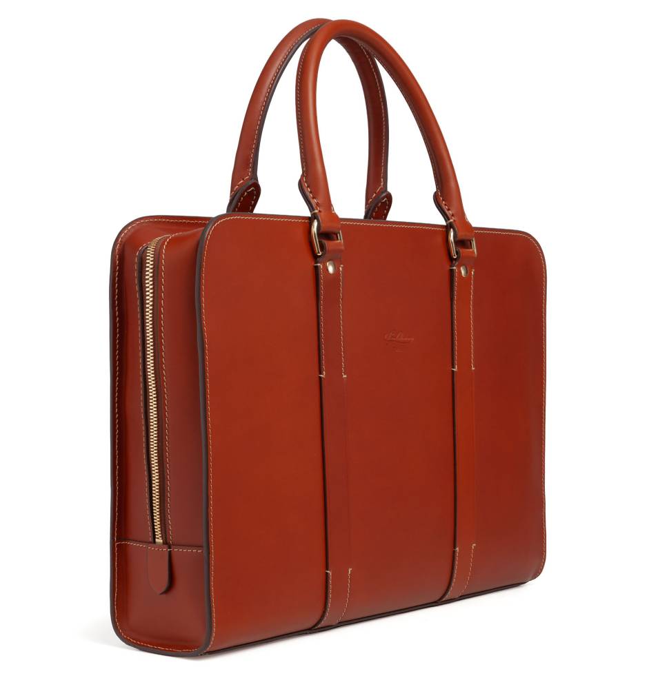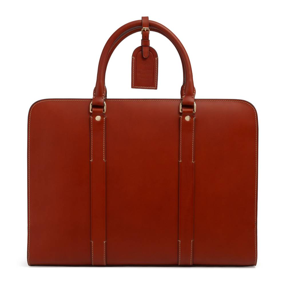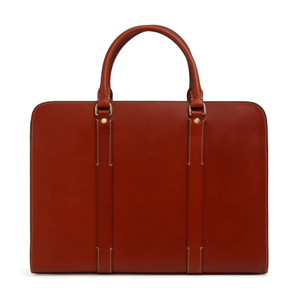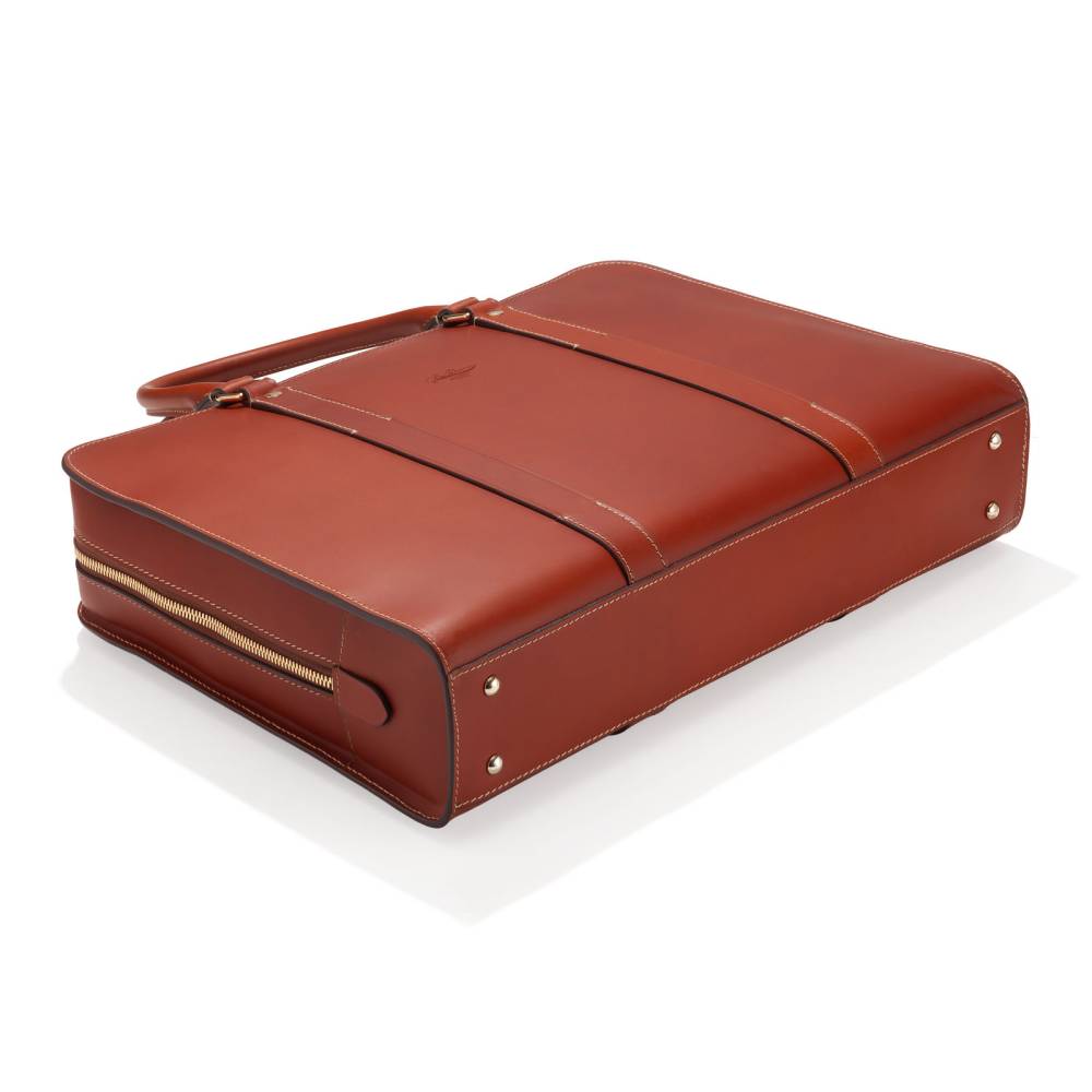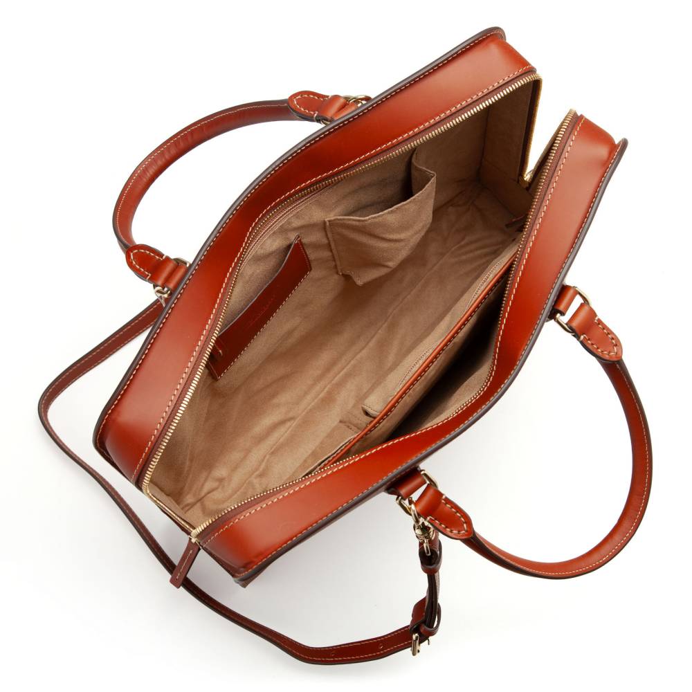 Портфель на круговой молнии итальянской мануфактуры Boldrini Selleria. Выполнен из аутентичной тосканской кожи растительного дубления Pelle Conciata al Vegetale в оранжевом цвете. Дизайн подчеркнут контрастной строчкой, фирменным тиснением мануфактуры и подкладкой из бархатистой бежевой алькантары. Внутри отделение с секцией для 15-дюймового ноутбука и карманами для документов и аксессуаров. Дно дополнено четырьмя металлическими ножками, защищающими кожу от износа. Комплектуется съемным плечевым ремнем, дополнит как мужской, так и женский гардероб.