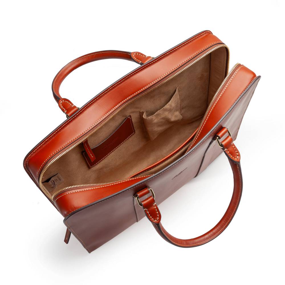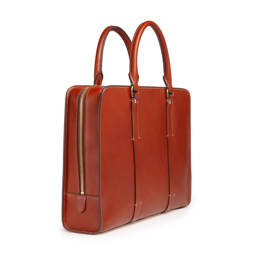 Деловая сумка (Briefcase) на молнии от итальянской мануфактуры Boldrini Selleria. Модель выполнена из аутентичной тосканской кожи растительного дубления Pelle Conciata al Vegetale в оранжевом цвете. Дизайн подчеркнут контрастной строчкой и лаконичным тиснением логотипа. Подкладка из бархатистой бежевой алькантары. Внутри отделение с секцией для 15-дюймового ноутбука и карманы для документов, телефона, портмоне и визиток. Благодаря универсальному дизайну и съемному плечевому ремню в комплекте, сумка подходит как мужчинам, так и женщинам.