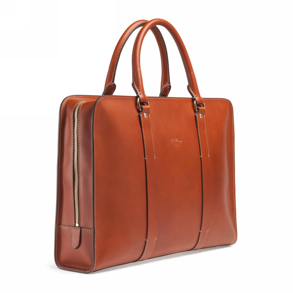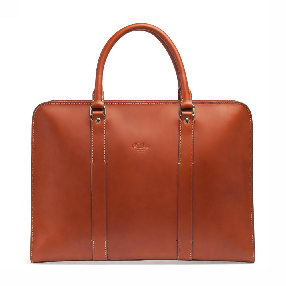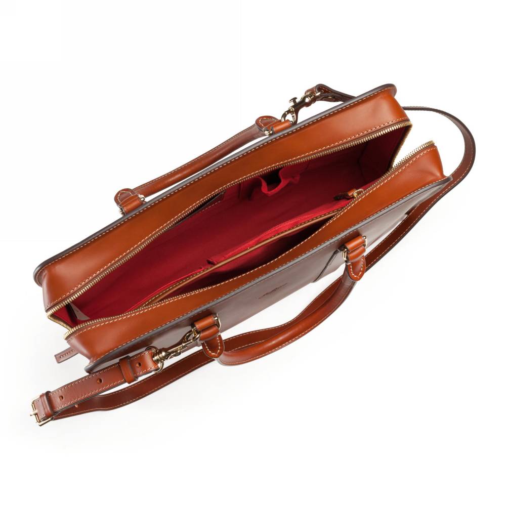 Вместительная сумка Boldrini Selleria на молнии. Выполнена из гладкой натуральной кожи коньячного цвета с контрастной строчкой. Внутри одно отделение с карманами для ценных вещей, портмоне, телефона и визиток, а также секция для ноутбука с диагональю 15 дюймов. Подкладка выполнена из высококачественного текстиля красного цвета. Модель украшена небольшим тиснением в виде логотипа бренда. К сумке прилагается плечевой ремень. Подойдёт как для мужчин, так и для женщин.