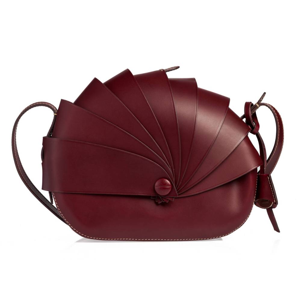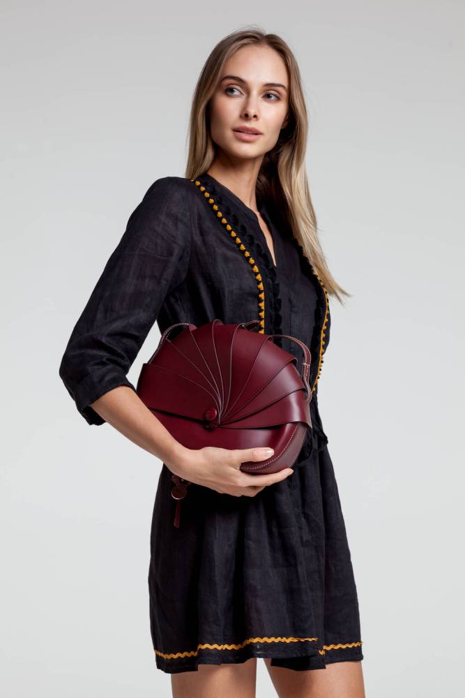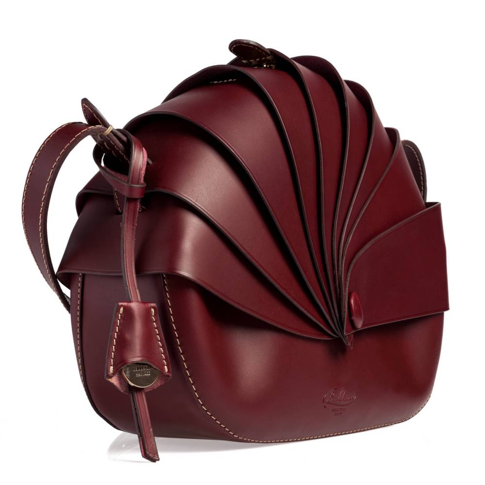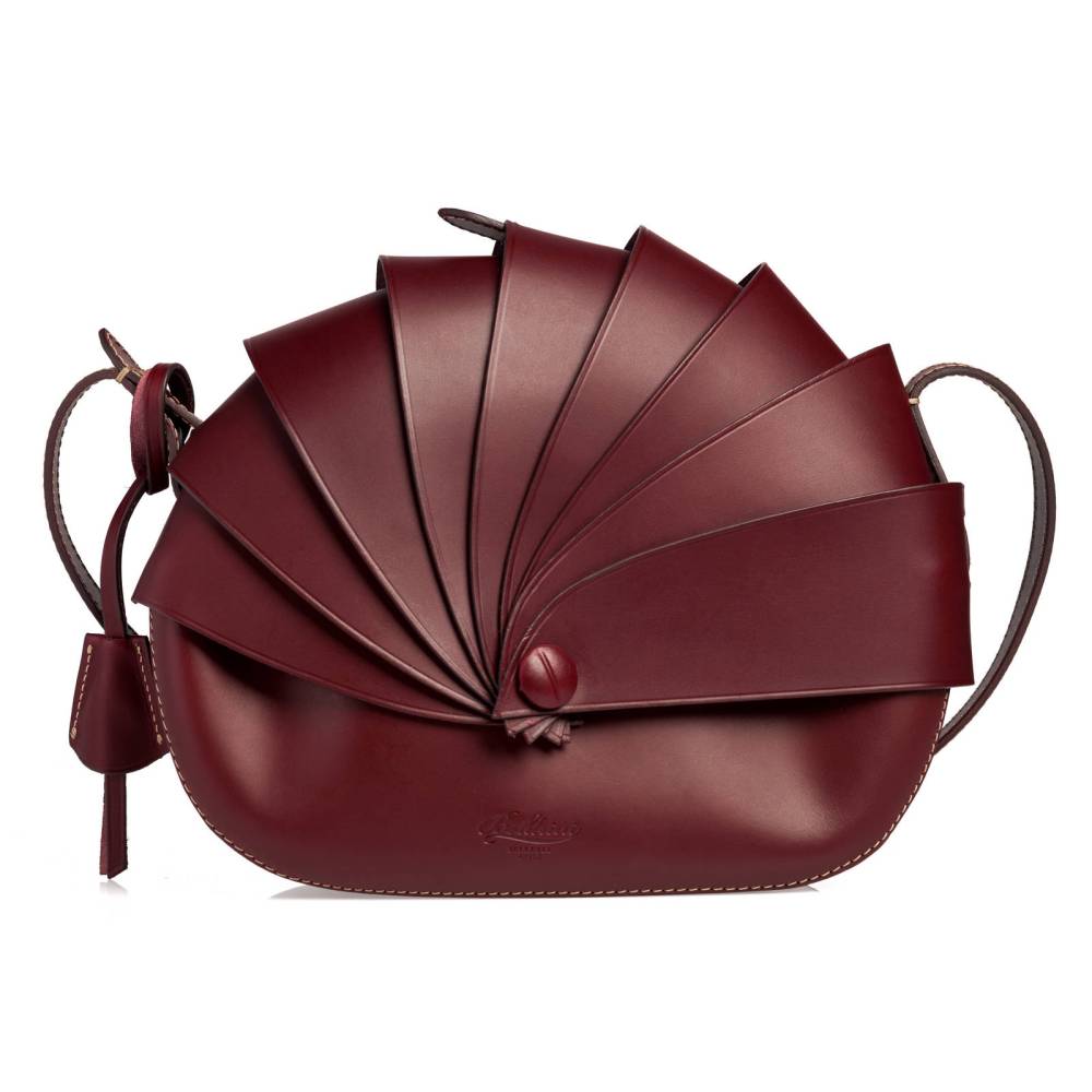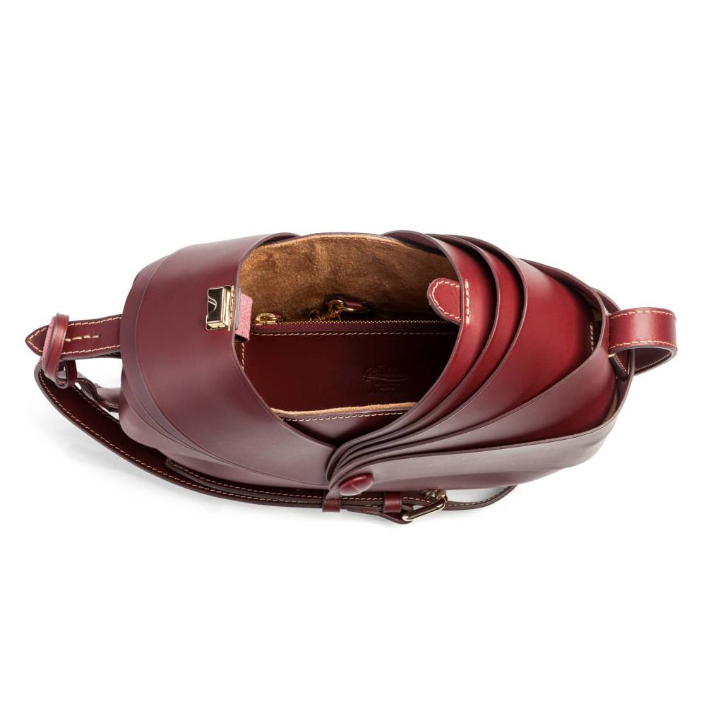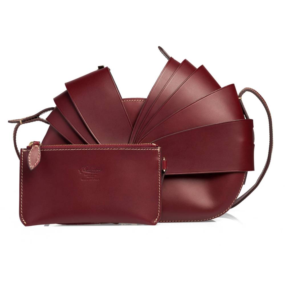 Компактная женская сумка Boldrini Selleria из коллекции Opera. Выполнена из плотной телячьей кожи бордового цвета с контрастной отстрочкой. Модели из этой коллекции отличаются оригинальным дизайном, напоминающим форму ракушку. Клапан состоит из отдельных, соеденённых между собой, отрезков кожи и закрывается на золотистую застежку. Внутренняя отделка сумки выполнена из бархатистой замши бежевого цвета. Модель дополнена небольшим кошельком с логотипом бренда, закреплённым на внутренней стенке при помощи кожаного ремешка, который можно отстегнуть. Ручка украшена металлической брендированной медалью.