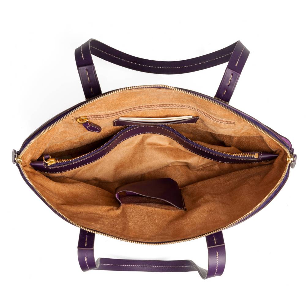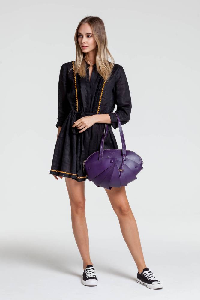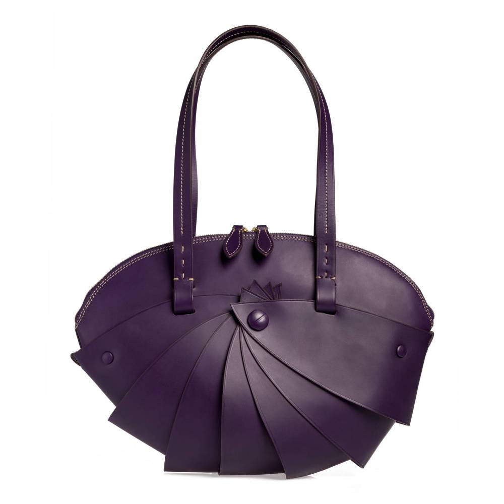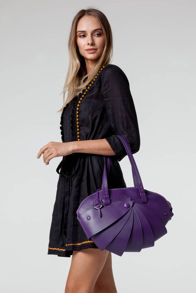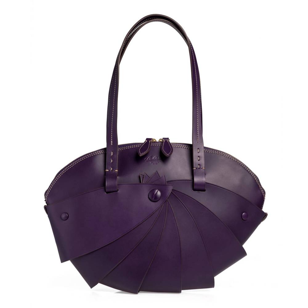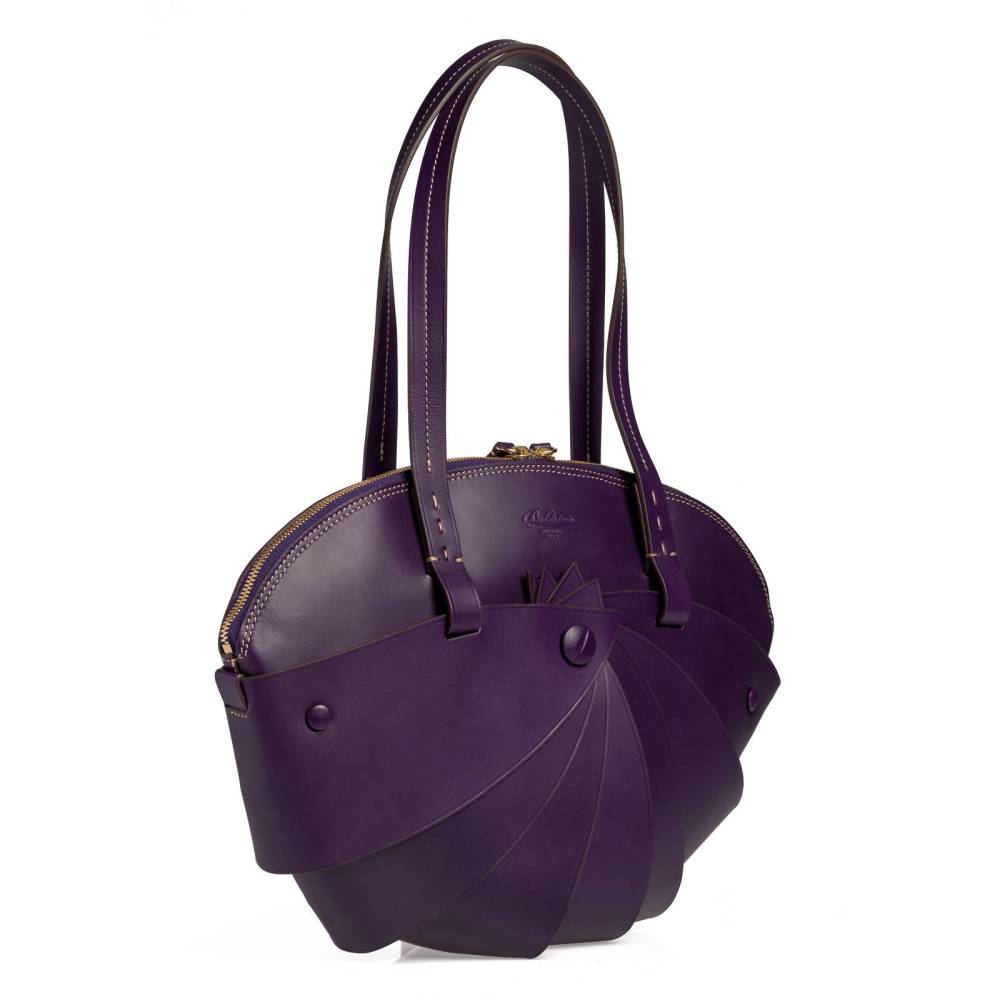 Женская сумка Boldrini Selleria среднего размера из коллекции Opera. Выполнена из плотной телячьей кожи фиолетового цвета с контрастной отстрочкой. Модели из этой коллекции отличаются оригинальным дизайном, напоминающим форму ракушку. Внутренняя отделка сумки выполнена из мягкой бархатистой замши бежевого цвета. Фурнитура из золотистого металла. Ручка украшена подвеской с металлической брендированной медалью. Внутри два отделения, перегородка на молнии, а также несколько небольших карманов для портмоне, телефона и визиток. Модель декорирована тиснением в виде логотипа бренда с внешней стороны.