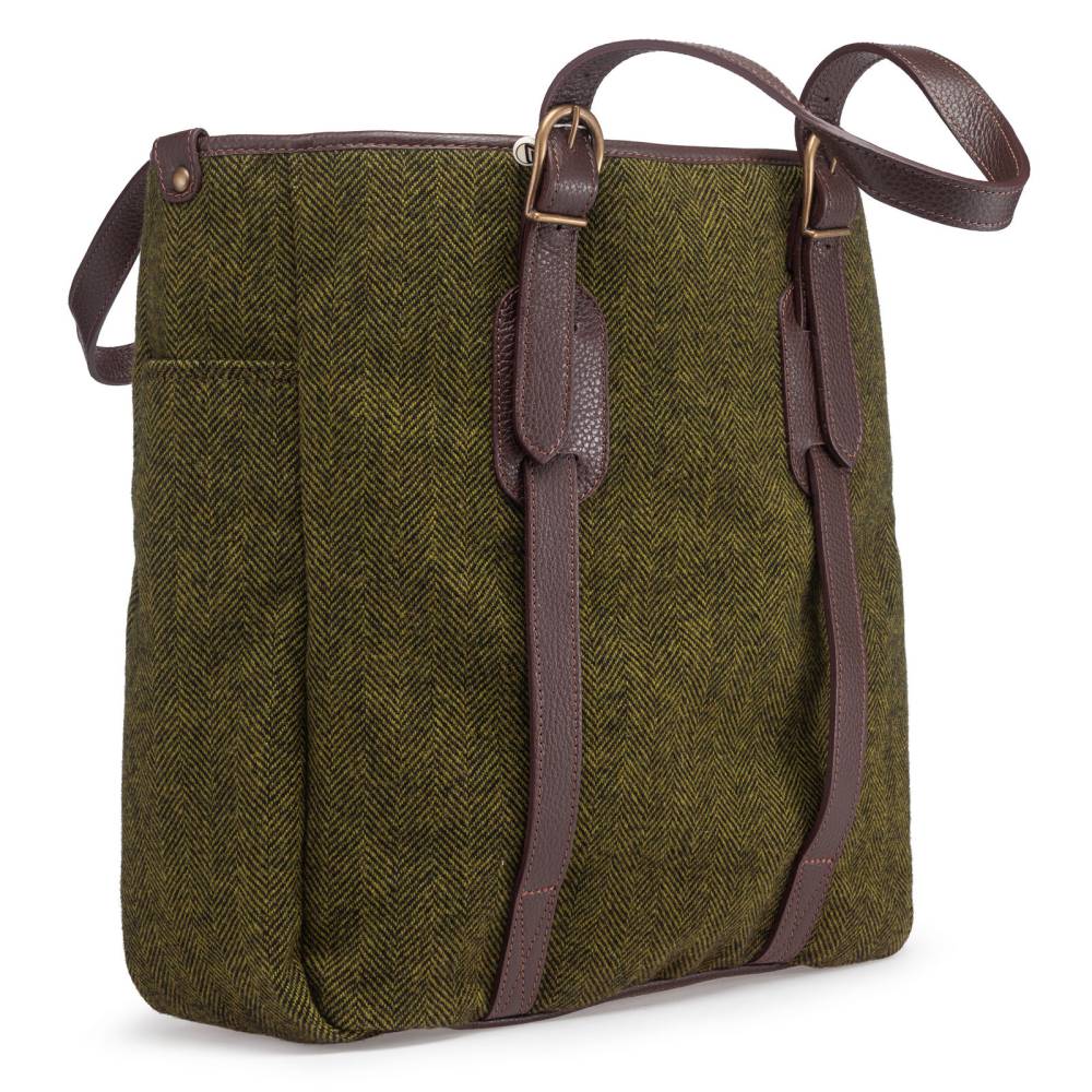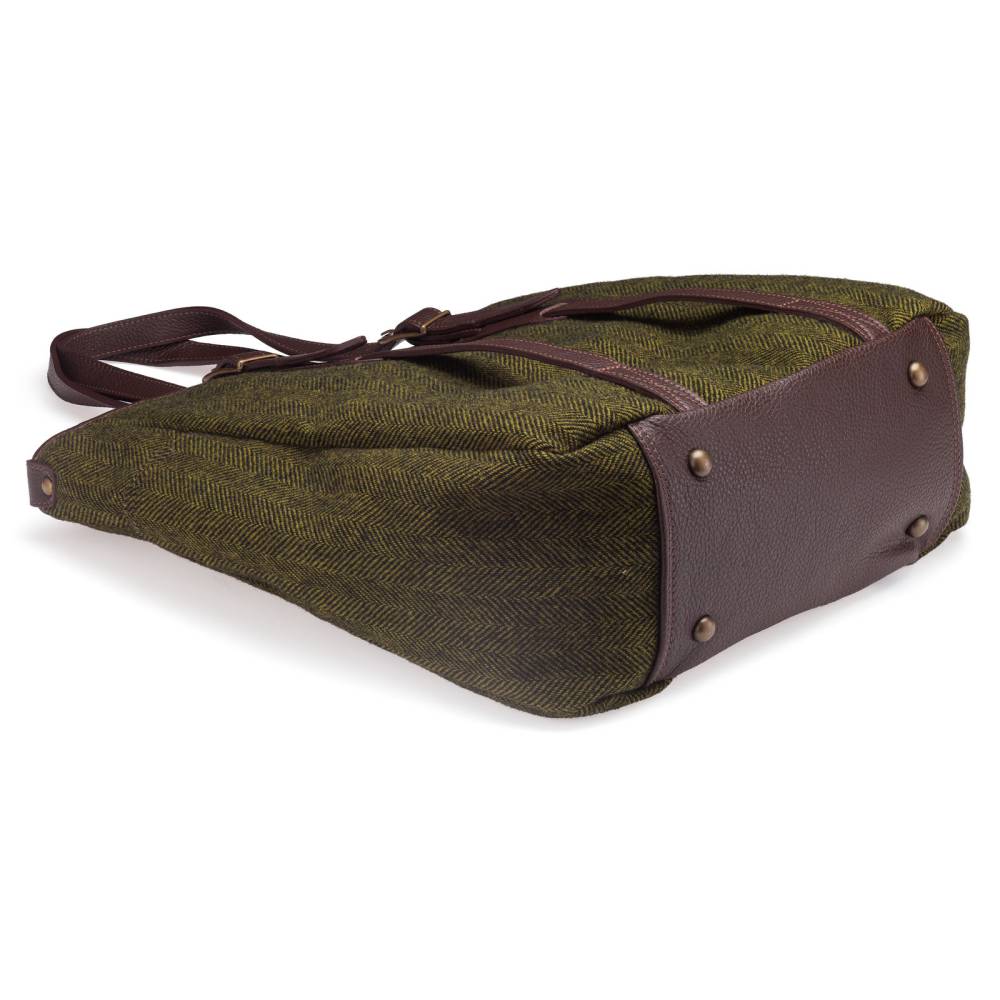 Стильная сумка-тоут итальянской марки Bonfanti, которая подходит как для мужчин, так и для женщин. Выполнена из фактурной шерстяной ткани глубокого зелёного цвета с традиционным твидовым узором «елочка». Ручки и детали отделки из натуральной с зернистой фактурой. Внутри карман на молнии для ценных вещей и документов. Снаружи два вместетльных отделения по бокам. Подкладка из приятной на ощупь хлопковой ткани. Модель украшена латунной эмблемой бренда. Для удобства сумка застёгивается на магнитную кнопку, а ручки регулируются по длине. Дно из натуральной кожи усилено элементами из латуни.