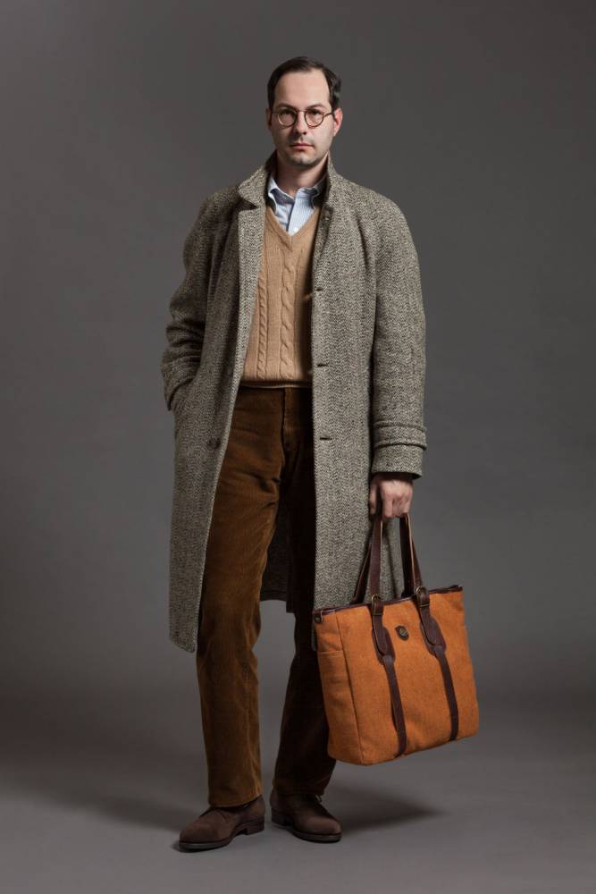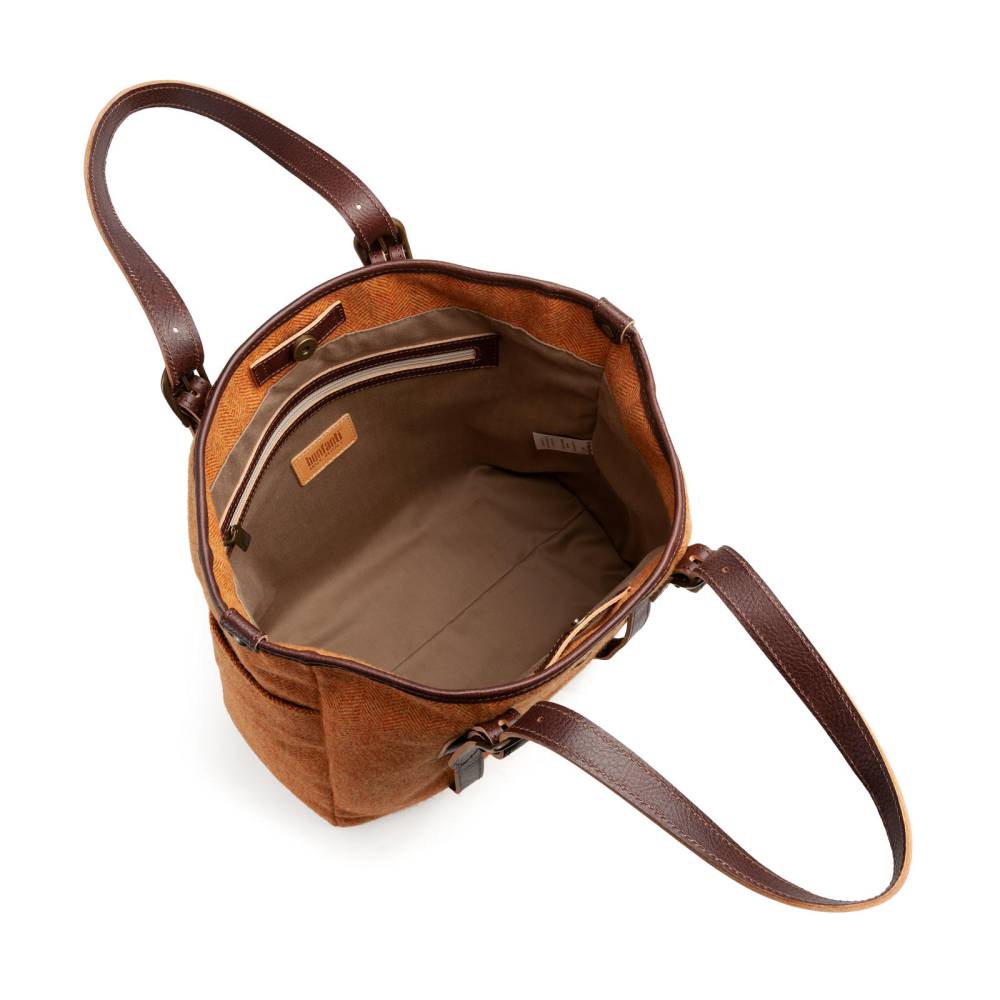 Стильная и практичная сумка-тоут итальянской марки Bonfanti. Выполнена из шерстяной ткани благородного оранжевого цвета, фактура которой напоминает твид, а ручки и детали отделки — из натуральной тёмно-коричневой кожи с зернистой фактурой. Внутри одно отделение и карман на молнии для ценных вещей и документов. Снаружи есть два кармашка для мелочей, которые всегда должны быть под рукой. Модель украшена латунной эмблемой бренда. Для удобства сумка застёгивается на магнитную кнопку, а ручки регулируются по длине. Подойдёт как для мужчин, так и для женщин.