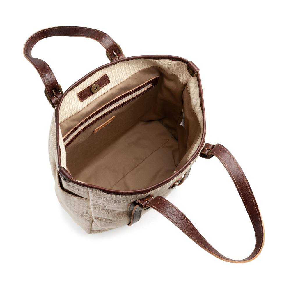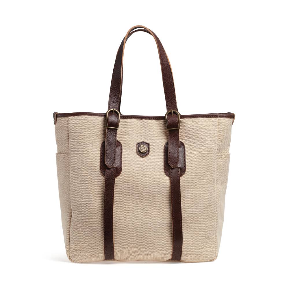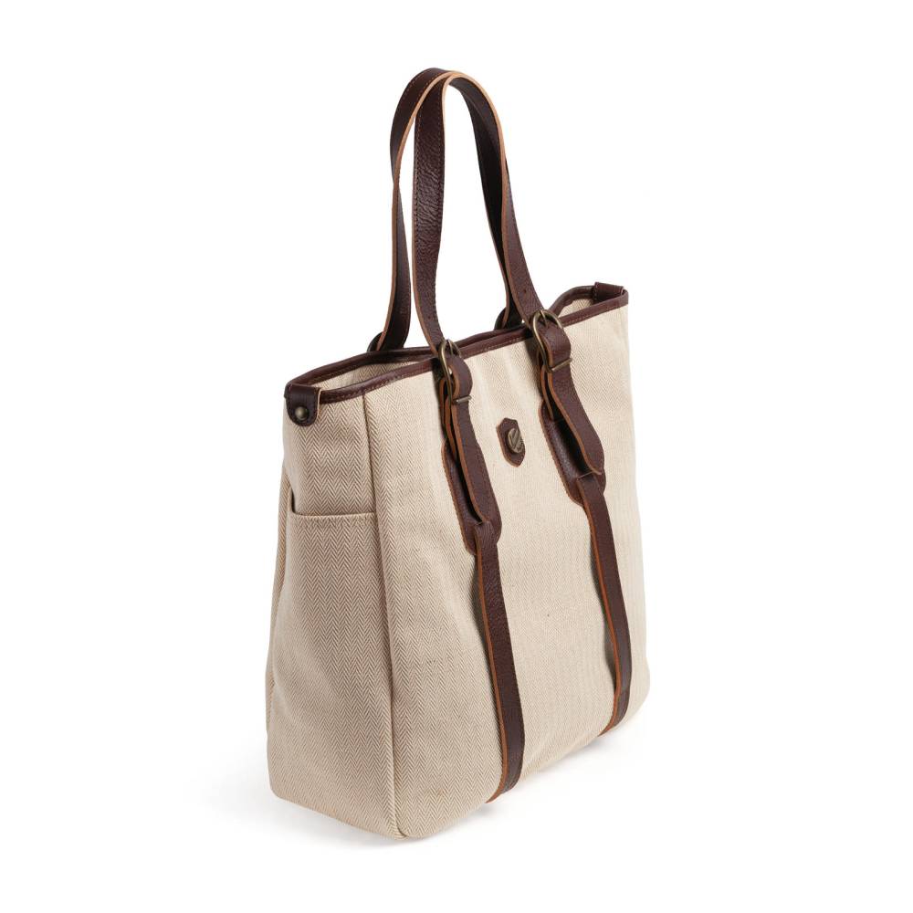 Стильная и практичная сумка-тоут итальянской марки Bonfanti. Выполнена из плотного бежевого канваса с фактурным узором "ёлочка", а ручки и детали отделки — из натуральной тёмно-коричневой кожи с зернистой фактурой. Внутри одно отделение и карман на молнии для ценных вещей и документов. Снаружи есть два кармашка для мелочей, которые всегда должны быть под рукой. Модель украшена латунной эмблемой бренда. Для удобства сумка застёгивается на магнитную кнопку, а ручки регулируются по длине. Подойдёт как для мужчин, так и для женщин.