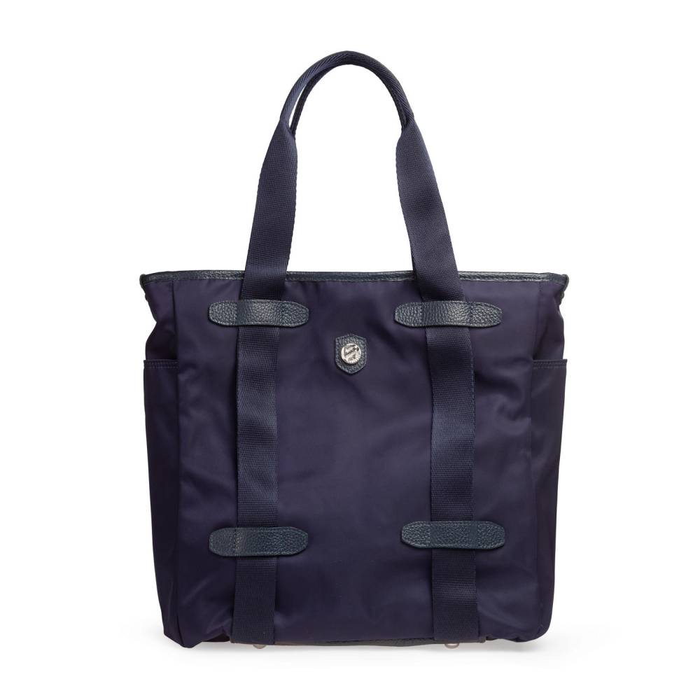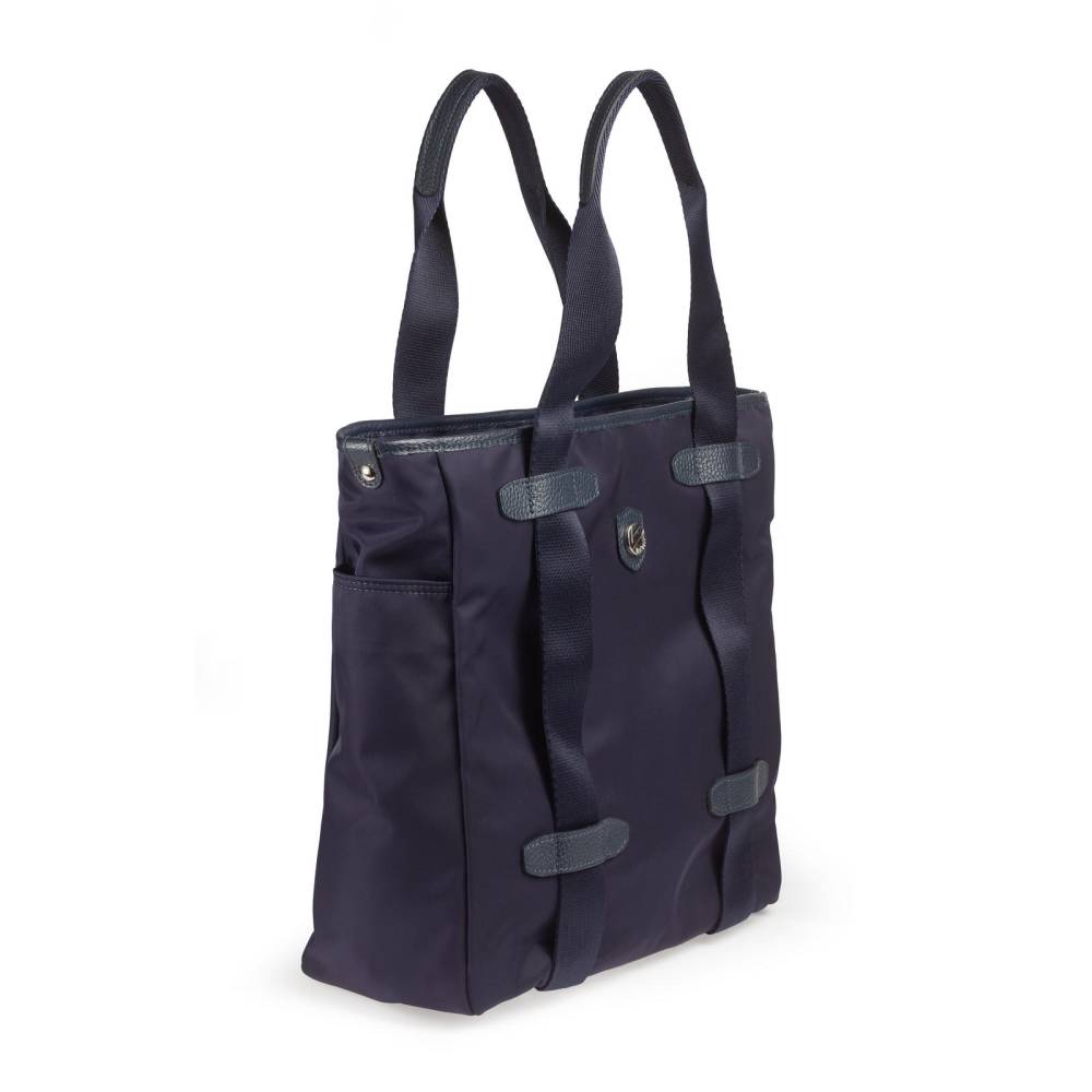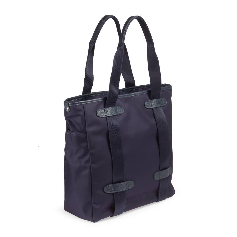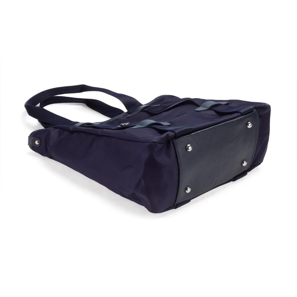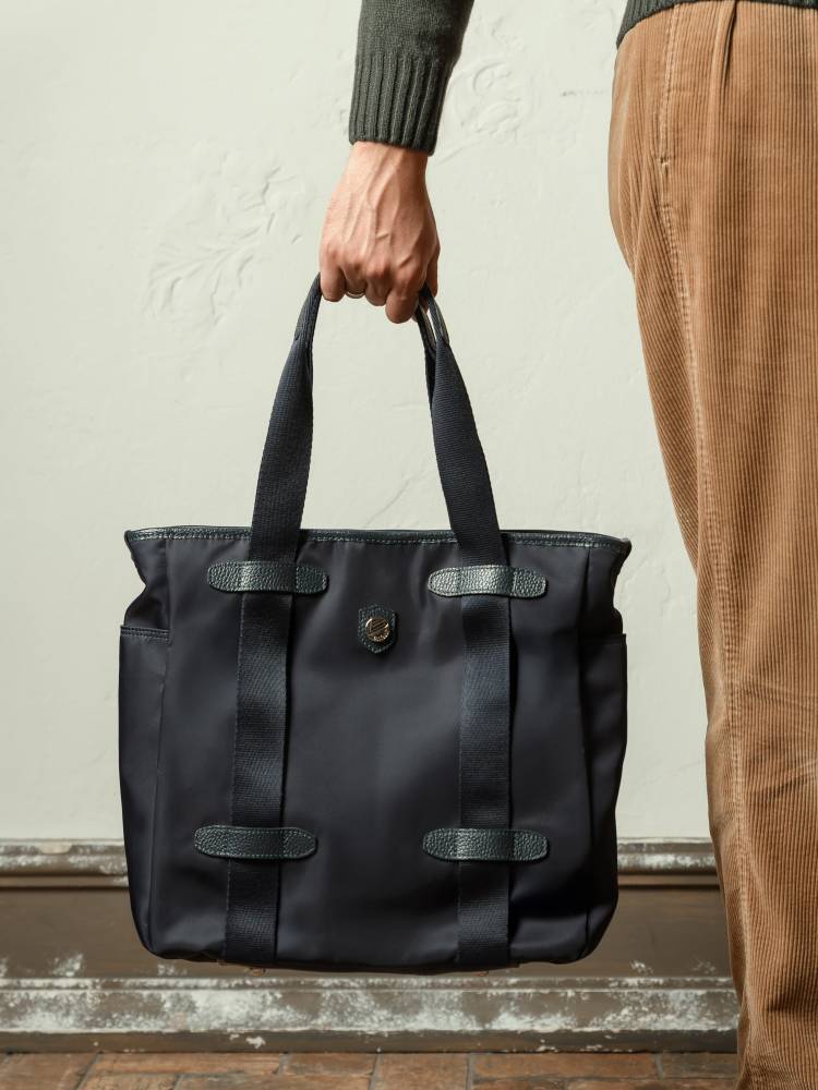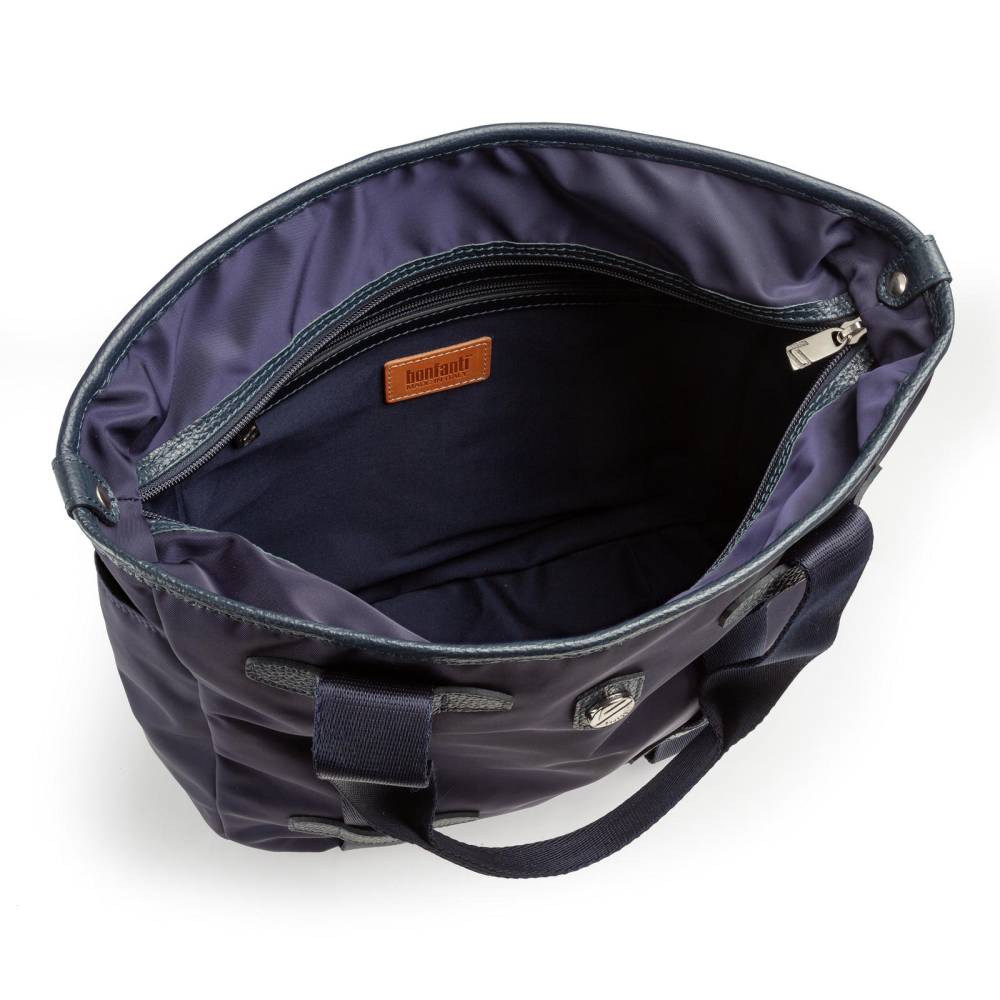 Практичная сумка-тоут итальянской марки Bonfanti для мужчин и женщин. С внешней стороны плотный гладкий нейлон тёмно-синего цвета и отделка из натуральной тёмно-синей кожи с зернистой фактурой. Широкие внешние ленты, переходящие в ручки выполнены из полиэстера. Подкладка также выполнена из полиэстера, имитирующего хлопок. Внутри один карман на молнии, а также небольшые карманы для карточек и других мелочей. С внешней стороны два дополнительных отделения по бокам. Основное отделение застёгивается на молнию. Дно выполнено из кожи и усилено металлическими элементами.
