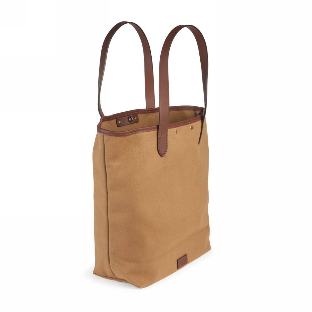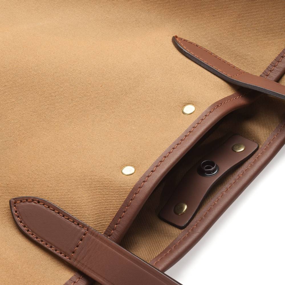 Сумка-тоут британского бренда Croots из износостойкого бежевого канваса. Особенностью конструкции является слой тонкой резины, заламинированный между верхом и подкладкой. Это обеспечивает материалу водонепроницаемость. Ручки и отделка — из натуральной кожи растительного дубления. Внутри несколько карманов и отделение на молнии для ценных вещей. Сумка застёгивается на кнопку. Дно и верхняя часть укреплены латунными клёпками. Подойдёт как для мужчин, так и для женщин.