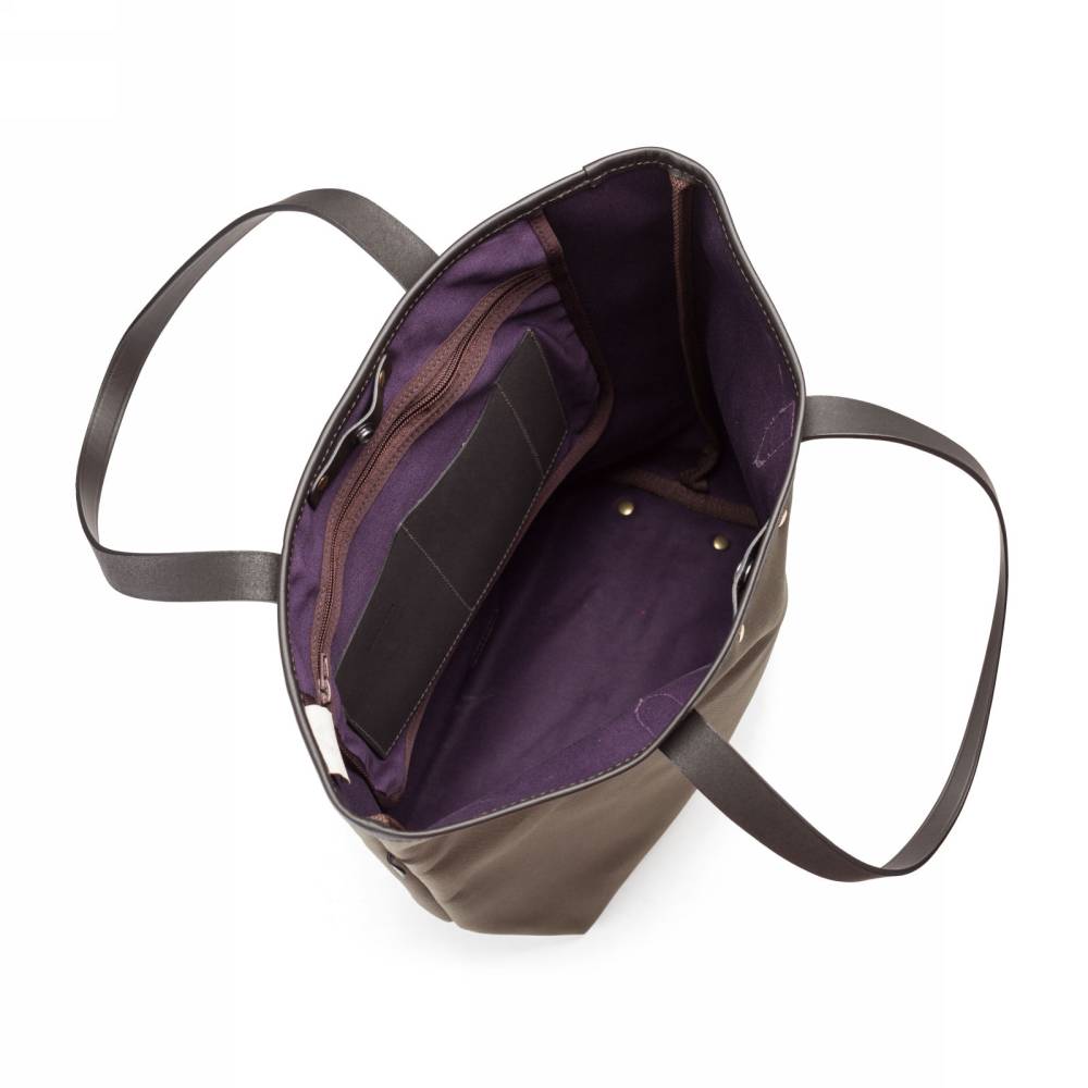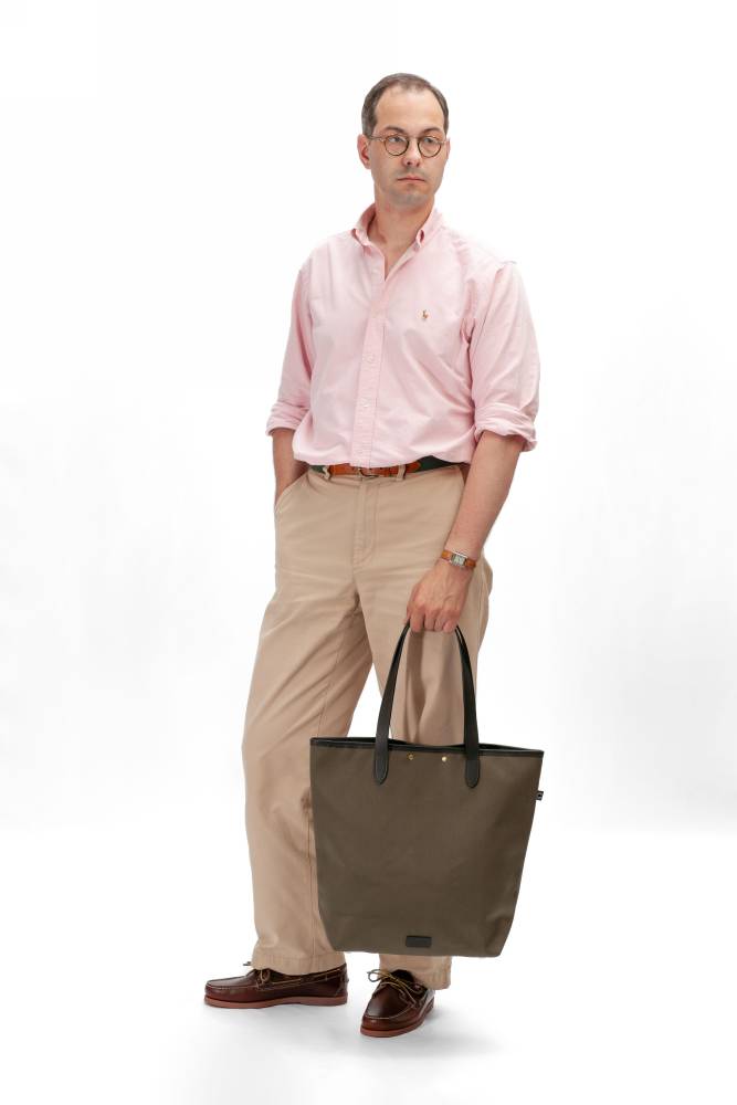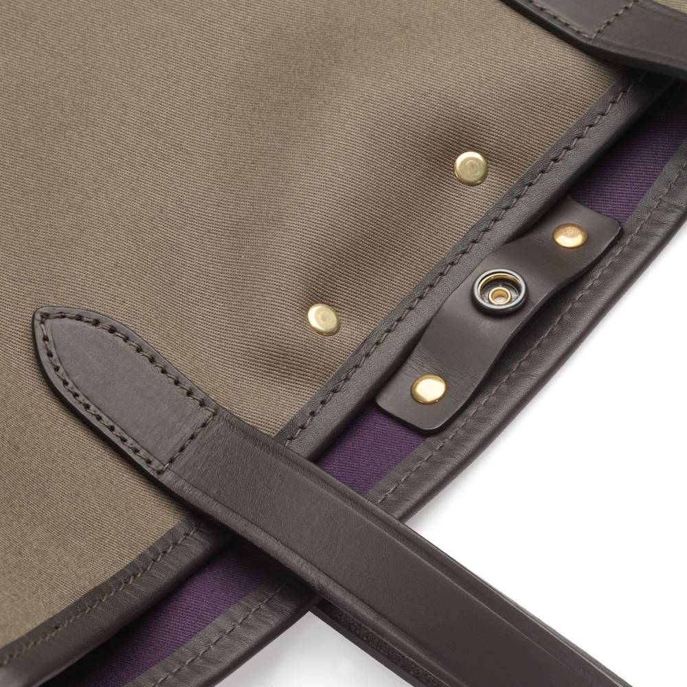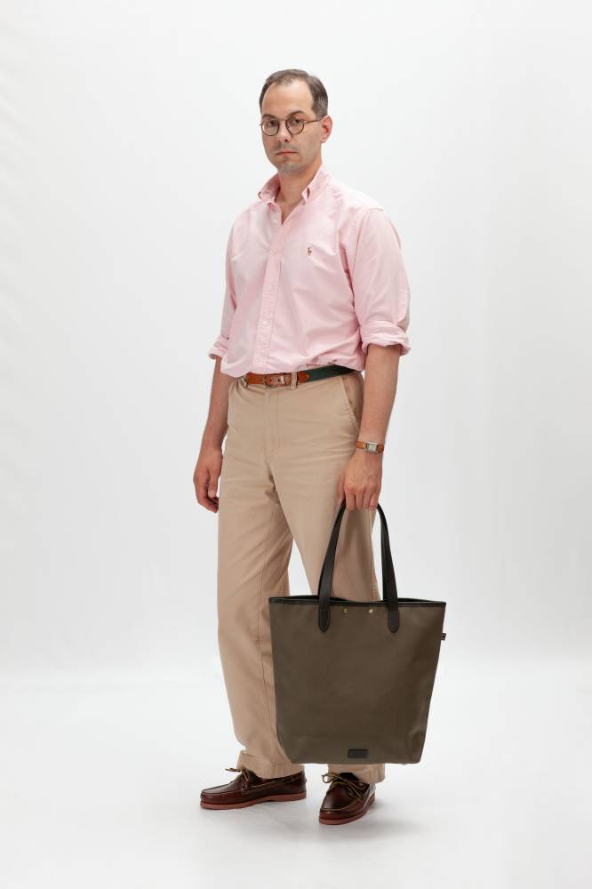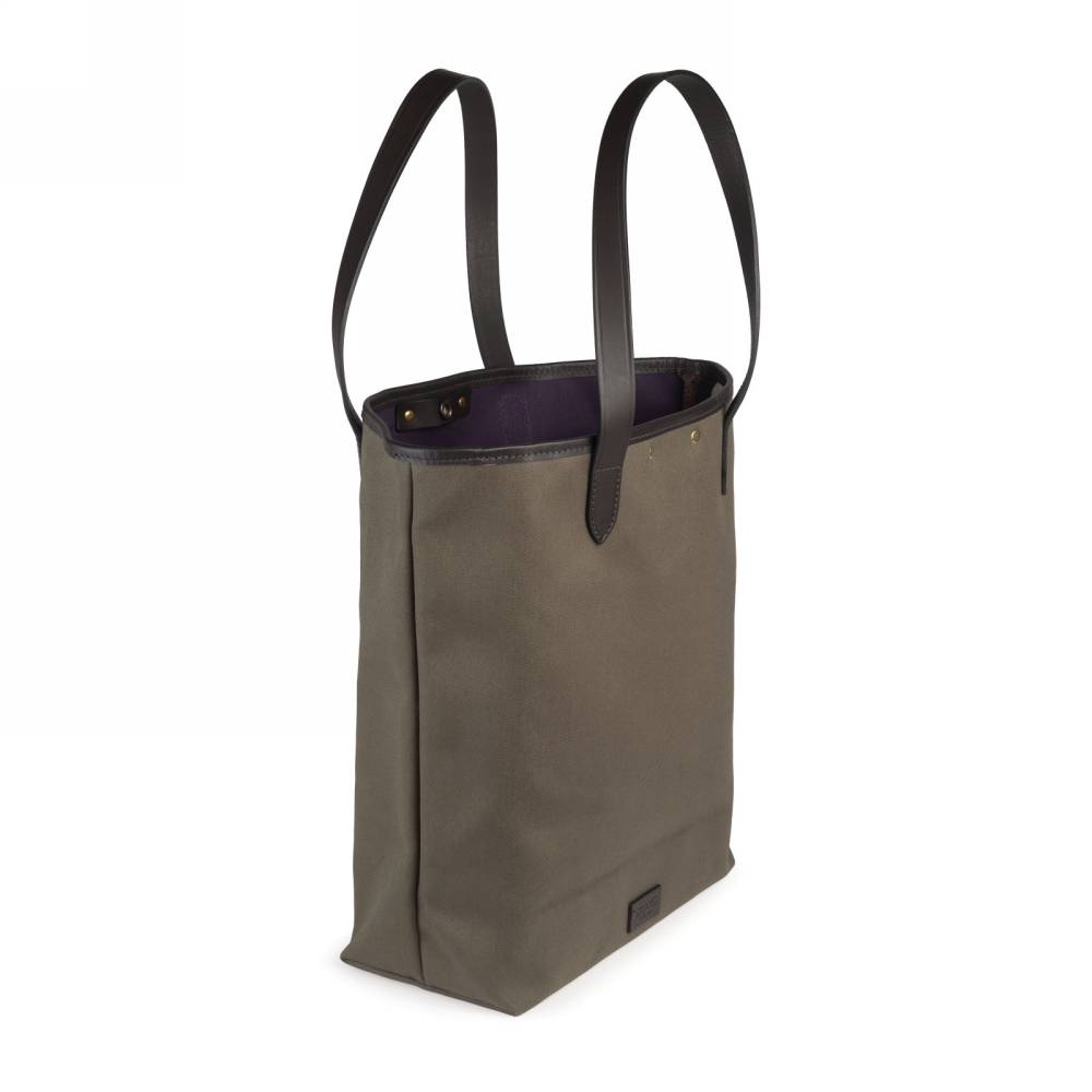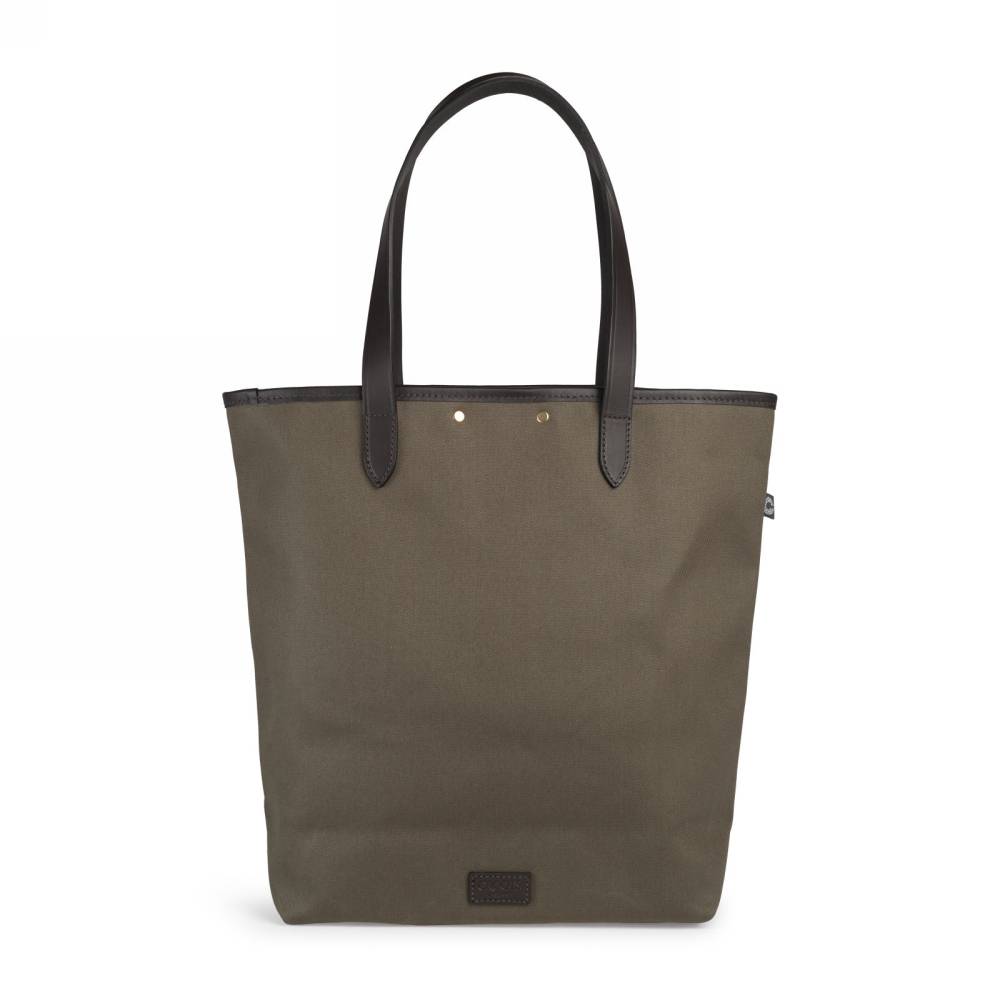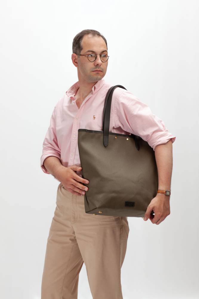 Сумка-тоут британского бренда Croots из износостойкого тёмно-зелёного канваса. Особенностью конструкции является слой тонкой резины, заламинированный между верхом и подкладкой. Это обеспечивает материалу водонепроницаемость. Ручки и отделка — из натуральной кожи растительного дубления. Внутри несколько карманов и отделение на молнии для ценных вещей. Сумка застёгивается на кнопку. Дно и верхняя часть укреплены латунными клёпками. Подойдёт как для мужчин, так и для женщин.