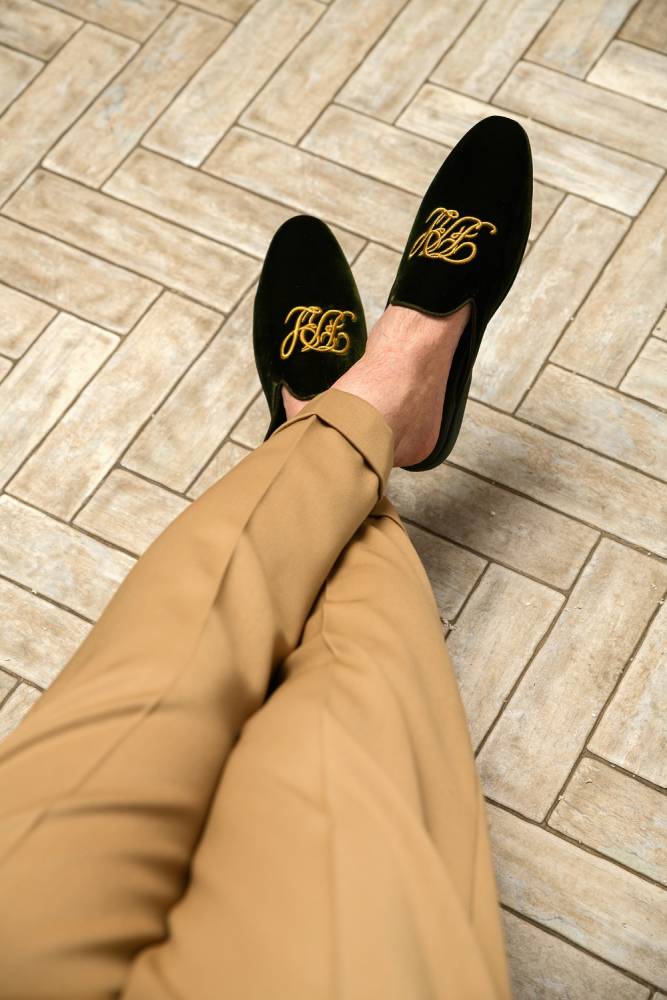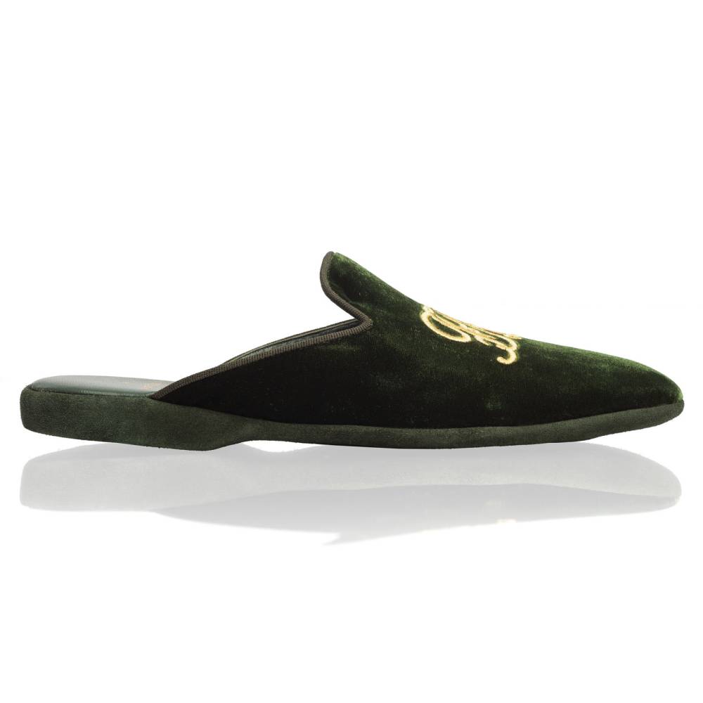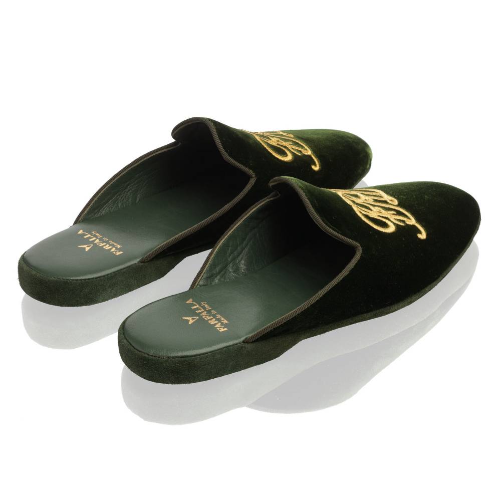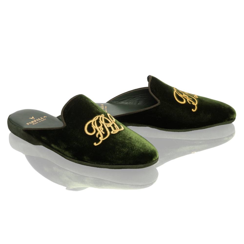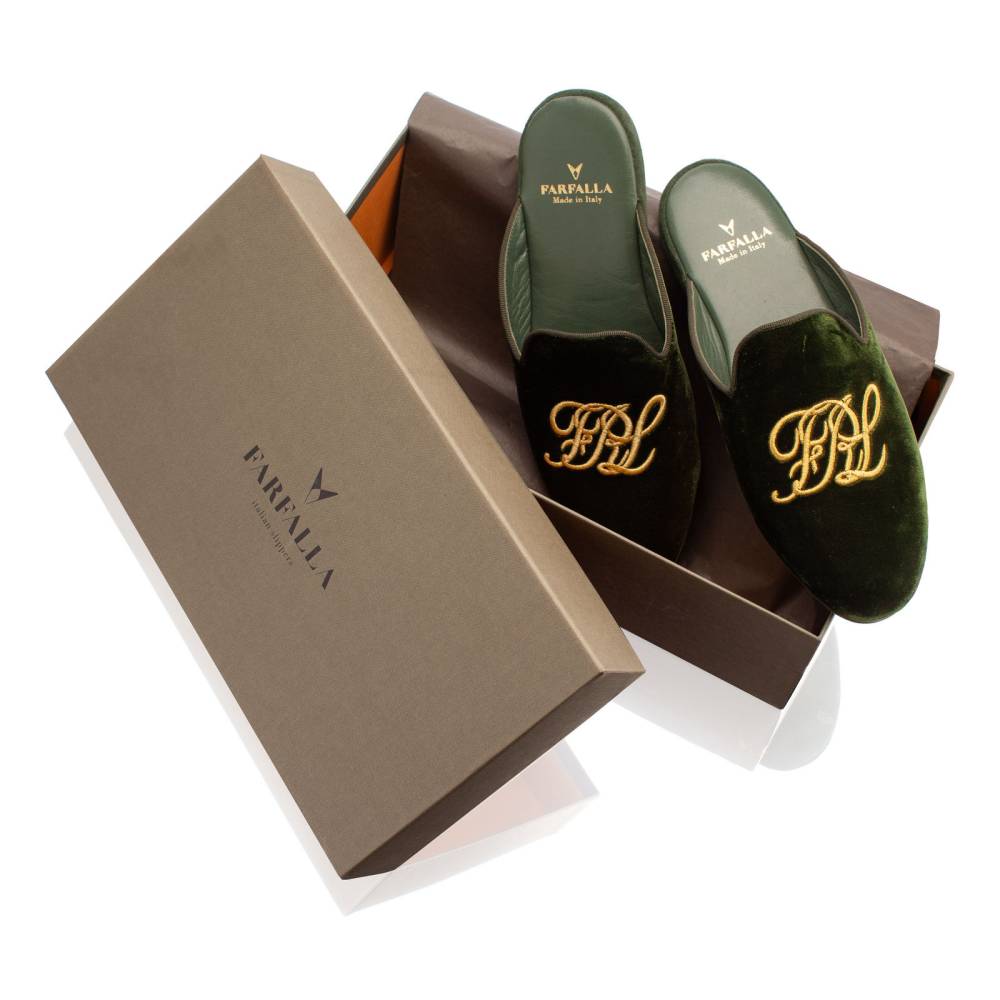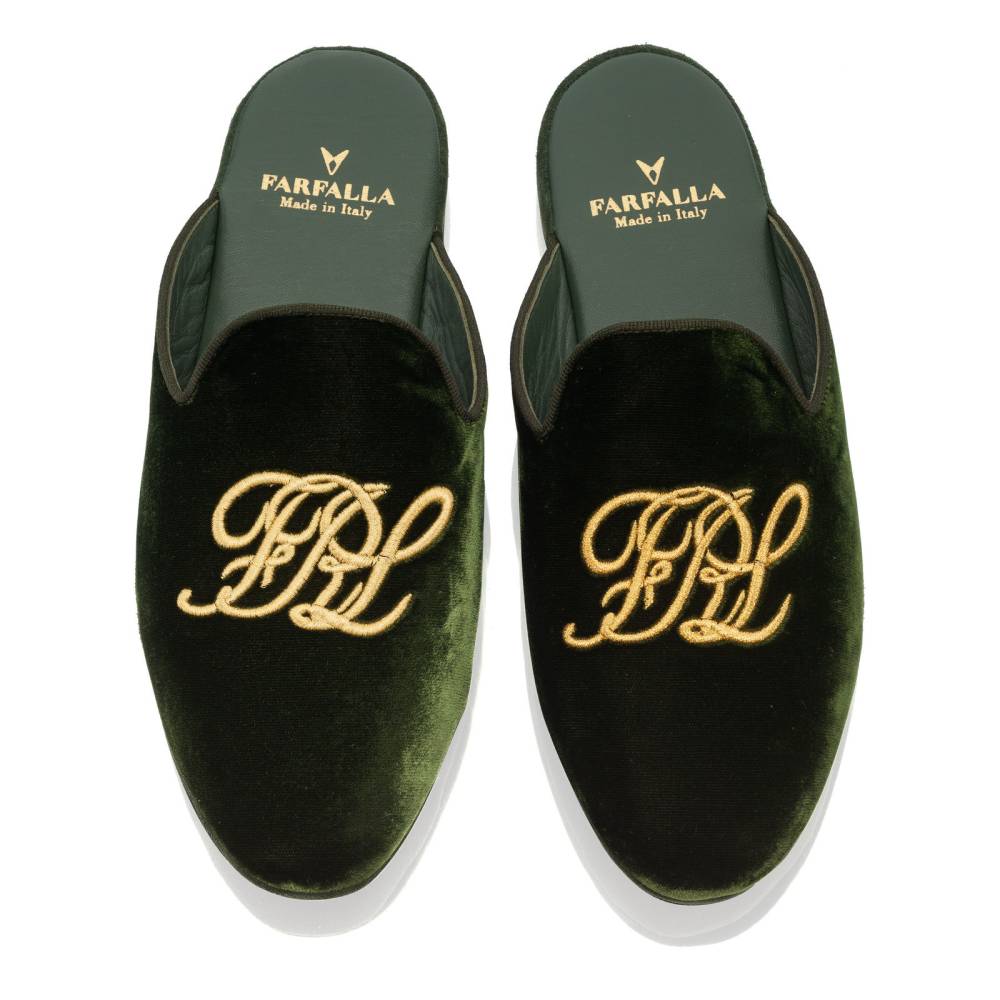Тапочки-мюли итальянского бренда Farfalla, изготовленные вручную. Выполнены в классическом силуэте Slip‑on, который легко носить и который неподвластен времени. Модель с мягкой подошвой, конструкция которой восходит к XIV веку. Эта многовековая техника заключается в сшивании двух кусков материала вместе и последующем искусном ручном выворачивании наизнанку. Такой метод позволяет скрыть линию шва внутри, что является свидетельством непреходящего мастерства и уникальности конструкции. Верх изготовлен из мягкого бархатистого велюра зелёного цвета с вышитой золотистыми нитями монограммой бренда «FRL». Внутренняя подкладка из тонкой козьей кожи обеспечивает мягкость и воздухопроницаемость. Замшевая подошва гарантирует естественную гибкость и комфортный шаг. Жёсткая невысокая танкетка в сочетании с мягким наполнителем гарантирует правильную поддержку стопы.