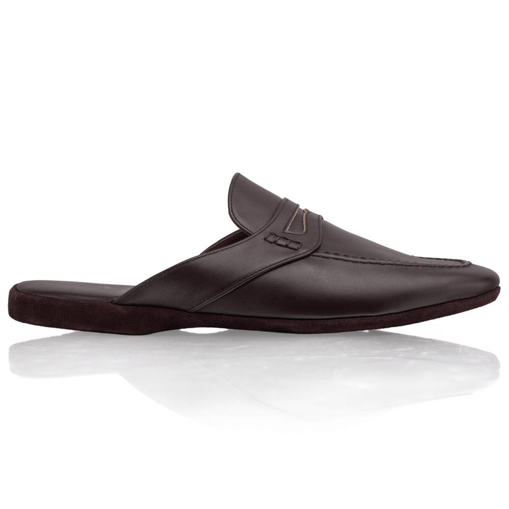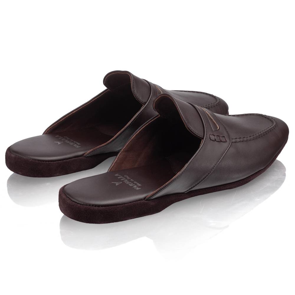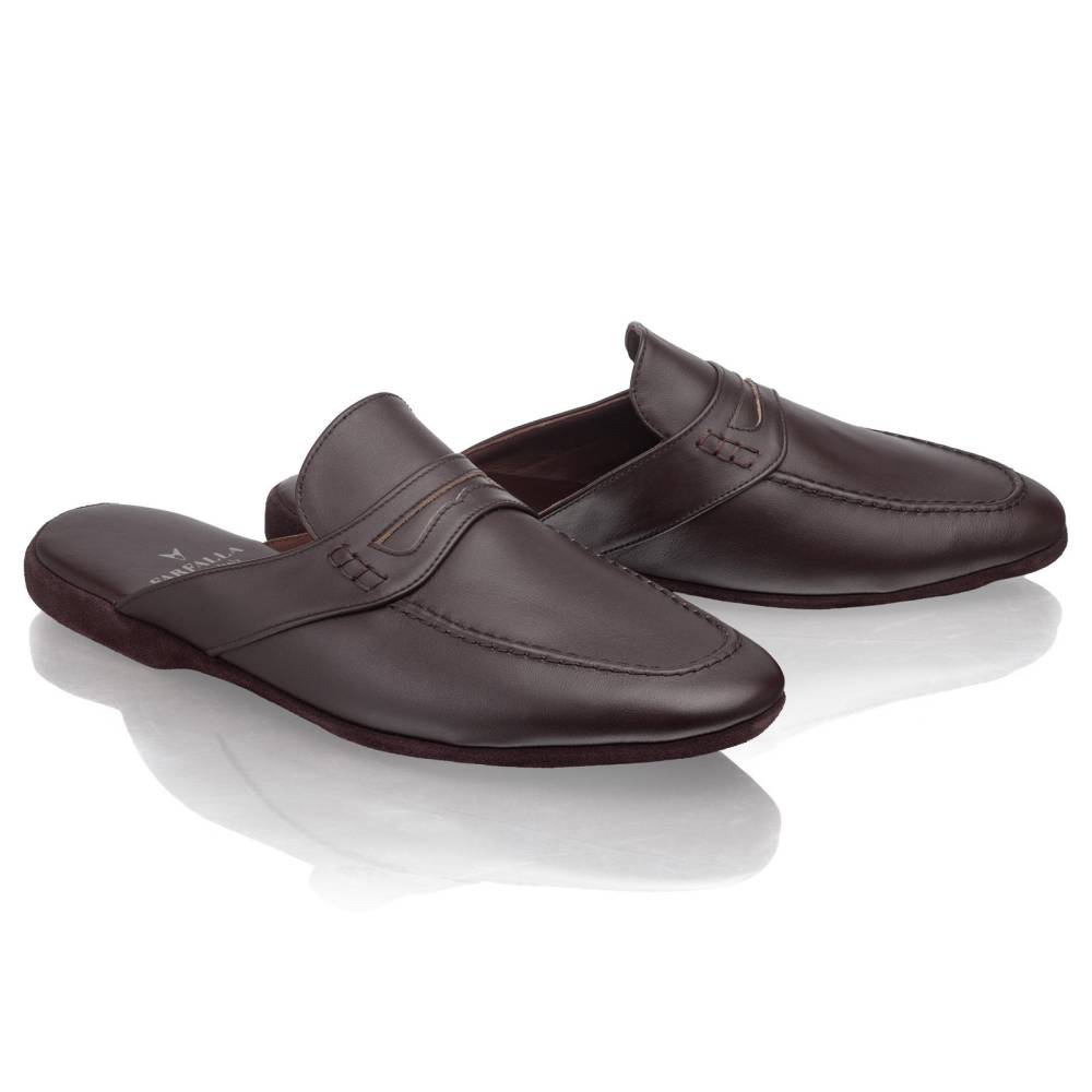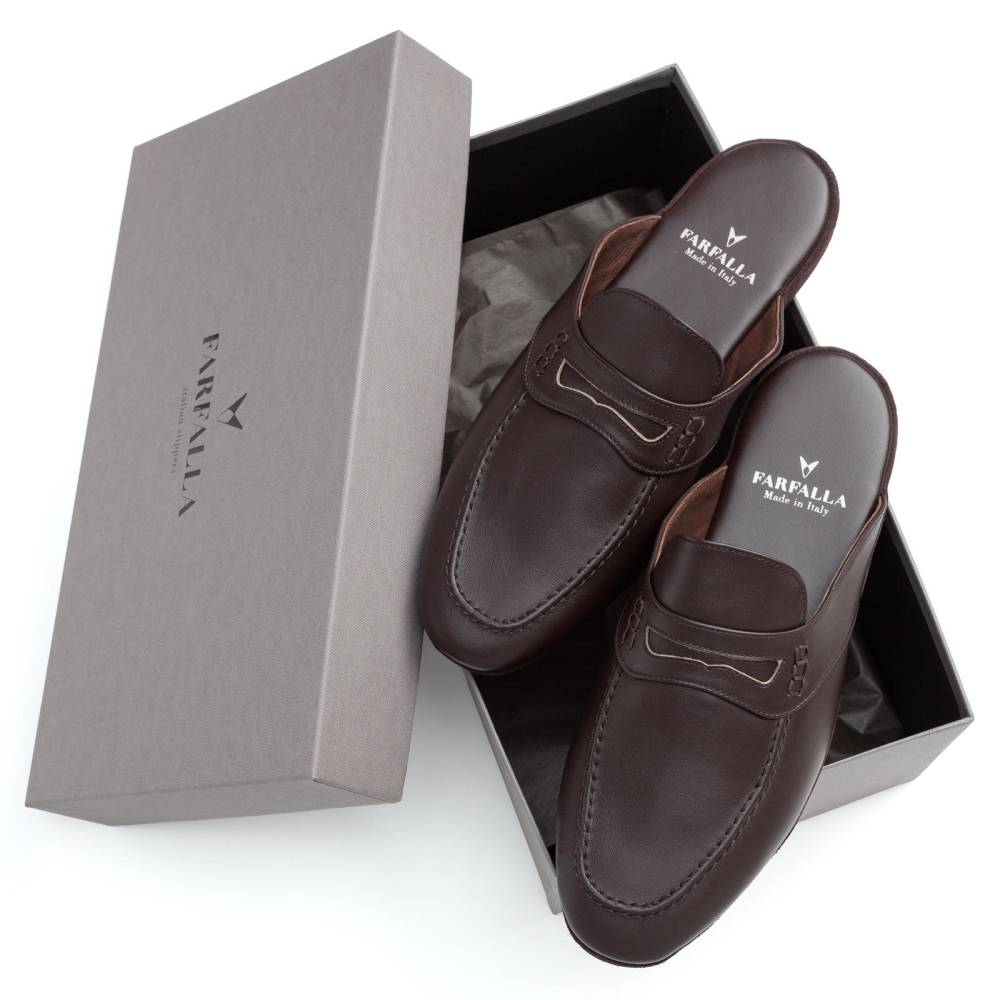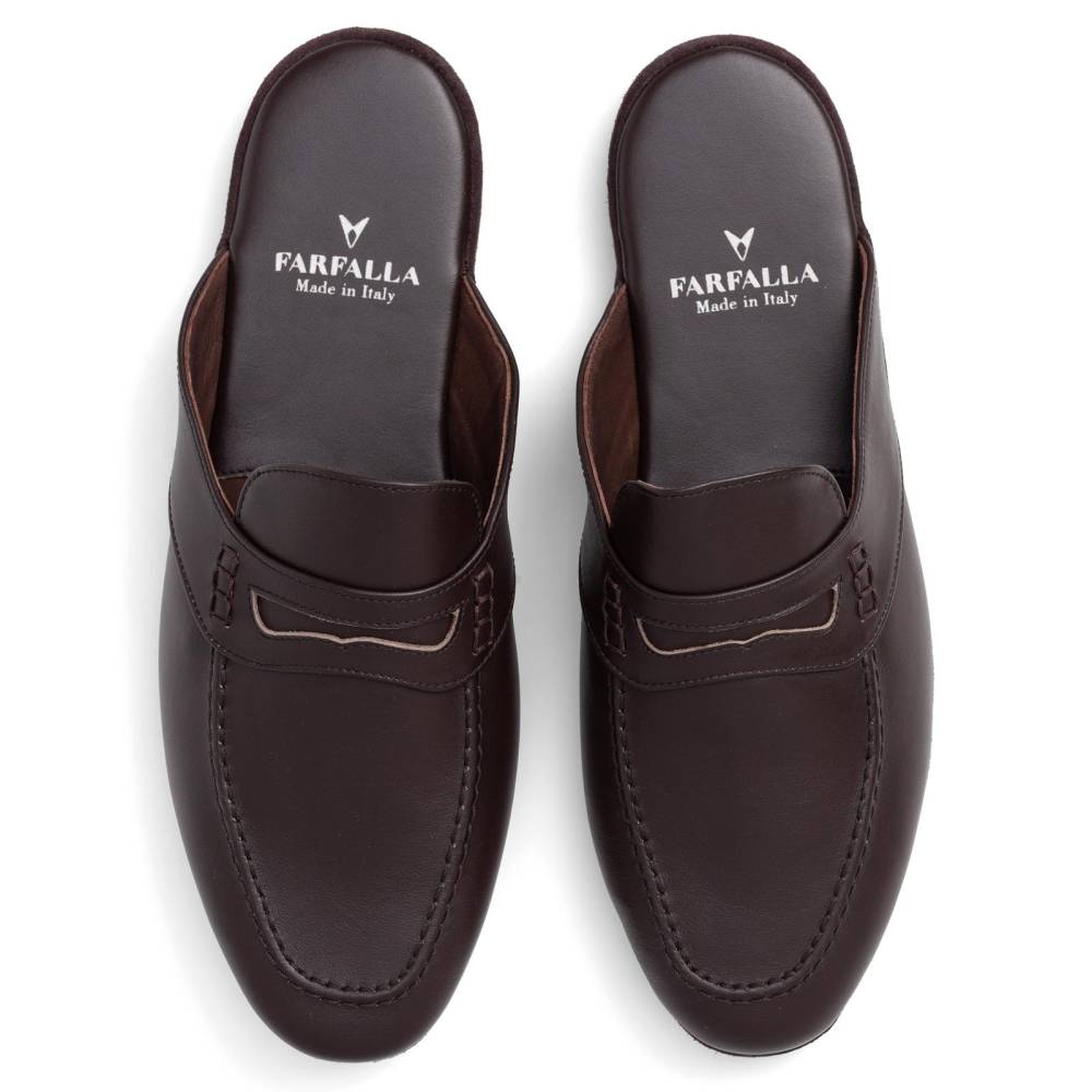 Тапочки-мюли итальянского бренда Farfalla, изготовленные вручную. Классический силуэт Slip‑on, который легко носить и который неподвластен времени. Модель с мягкой подошвой, конструкция которой восходит к XIV веку. Многовековая техника заключается в сшивании двух кусков материала и последующем ручном выворачивании наизнанку. Это позволяет скрыть шов внутри, что является свидетельством высочайшего мастерства и уникальности конструкции. Верх из гладкой телячьей кожи тёмно-коричневого цвета. Благодаря мягкости материала, тапки прекрасно облегают стопу, обеспечивая абсолютный комфорт. Особенность модели заключается в удобной конструкции пяточной области: жёсткая невысокая танкетка и мягкий наполнитель непосредственно под пяткой. Мягкая и гибкая подошва из замши. Внутри отделка также из тонкой натуральной замши, чтобы стопа не скользила.