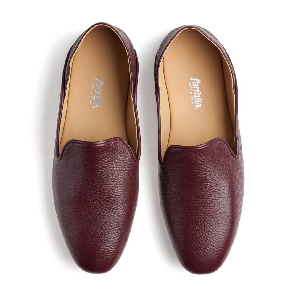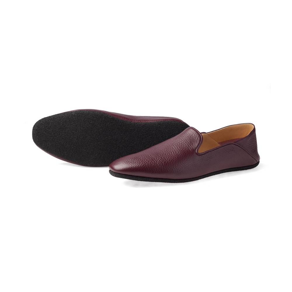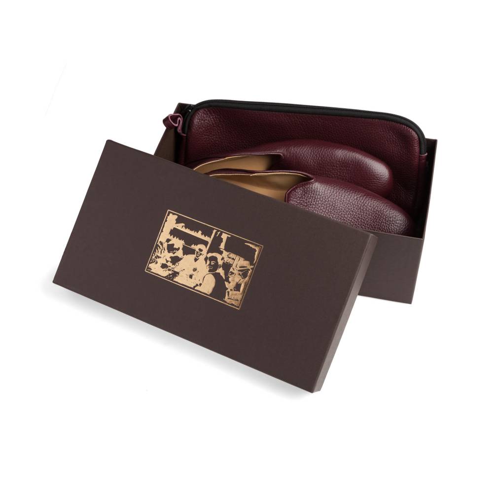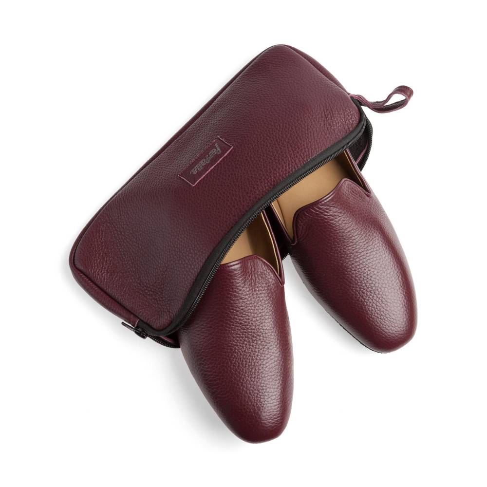 Тапки ручной работы из натуральной зернистой кожи бордового цвета от итальянского бренда Farfalla. Благодаря мягкости материала, тапки прекрасно облегают стопу, обеспечивая абсолютный комфорт. Особенность модели заключается в удобной конструкции пятки: ее можно опустить или поднять. Внутренняя отделка из замши бежевого цвета. Плотная влагоустойчивая подошва из телячьей кожи с полиуретановой крошкой. К тапкам прилагается кожаная сумка на молнии, которую удобно брать в командировки или путешествия.