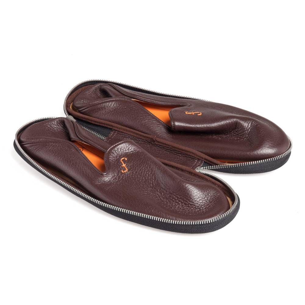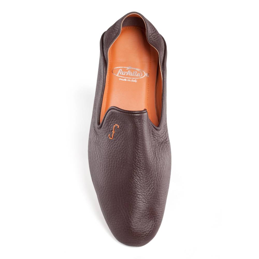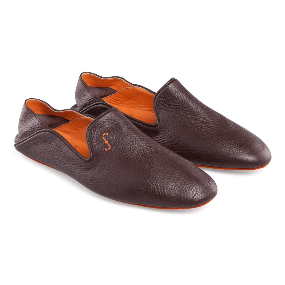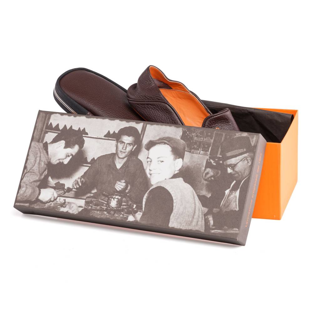 Тапки ручной работы из натуральной зернистой кожи тёмно-коричневого цвета от итальянского бренда Farfalla. Благодаря мягкости материала, тапки прекрасно облегают стопу, обеспечивая абсолютный комфорт. Особенность модели заключается в удобной конструкции пятки: ее можно опустить или поднять. Внутренняя отделка из замши ярко-оранжевого цвета. Подошва из бархатистой замши. К тапкам прилагается кожаный футляр на молнии, который удобно брать в командировки или путешествия.
