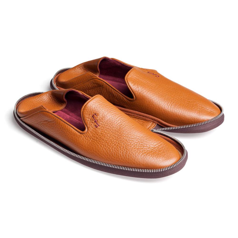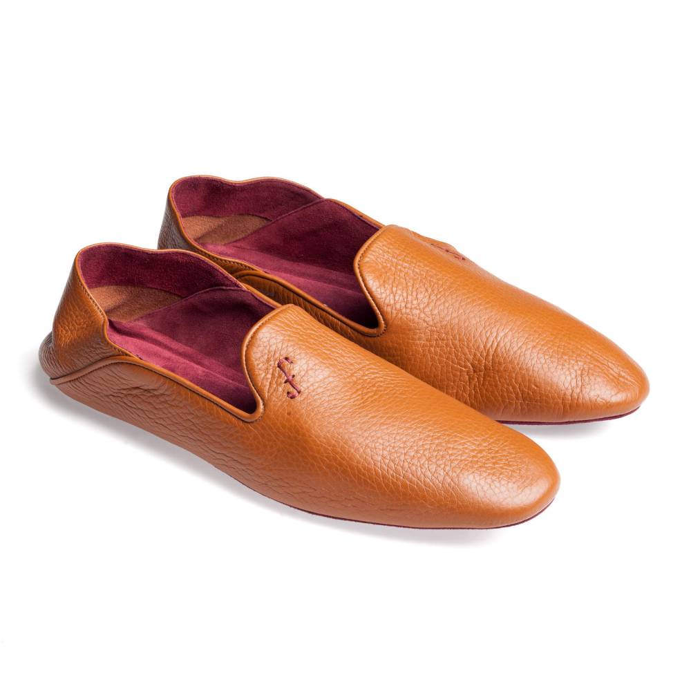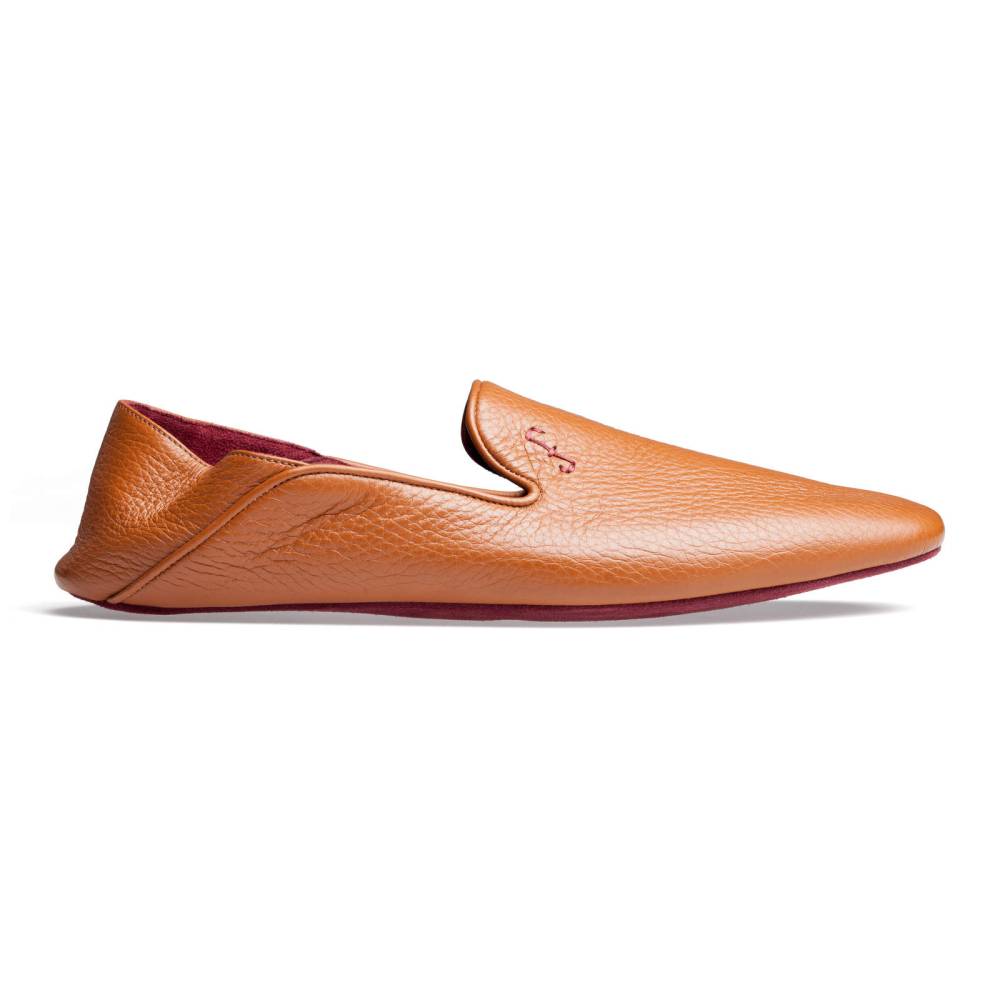 Тапочки ручной работы от итальянского бренда Farfalla, выполненные в классическом венецианском стиле (Venetian Loafer). Модель сочетает неподвластный времени силуэт с уникальной мягкой конструкцией подошвы, технология которой восходит к XIV веку. Многовековая техника заключается в сшивании двух кусков материала и последующем ручном выворачивании наизнанку. Это позволяет скрыть шов внутри, что является свидетельством высочайшего мастерства и уникальности исполнения. Продуманная конструкция пятки позволяет носить модель как классические тапочки или как расслабленные мюли. Верх выполнен из эластичной зернистой кожи оленя светло-коричневого цвета с изящной вышитой монограммой «F». Внутренняя отделка и подошва из бархатистой бордовой замши дарят исключительное удобство. В комплекте прилагается кожаный футляр на молнии, который удобно брать в командировки или путешествия.