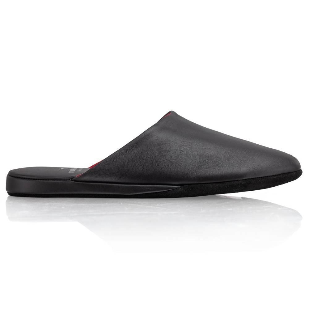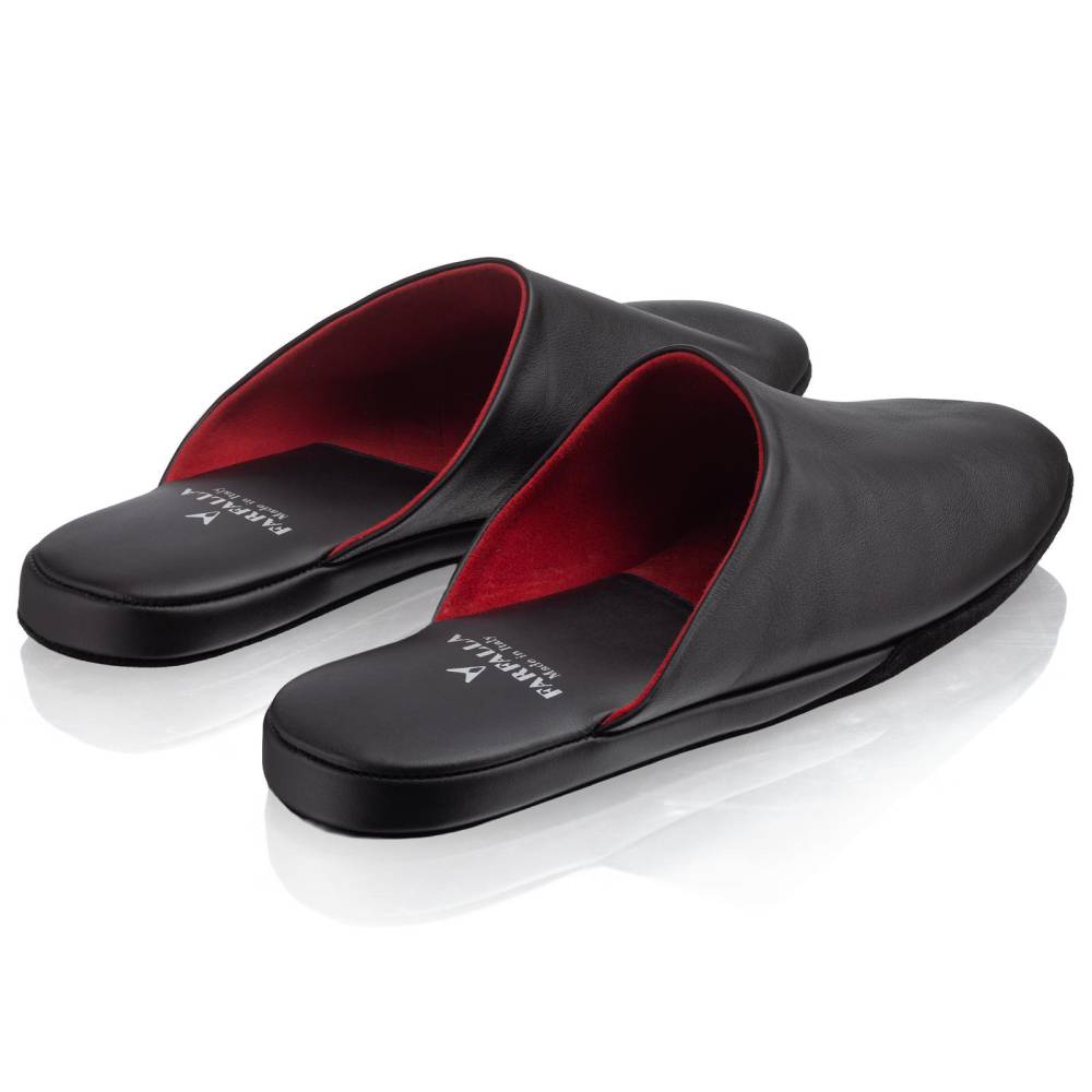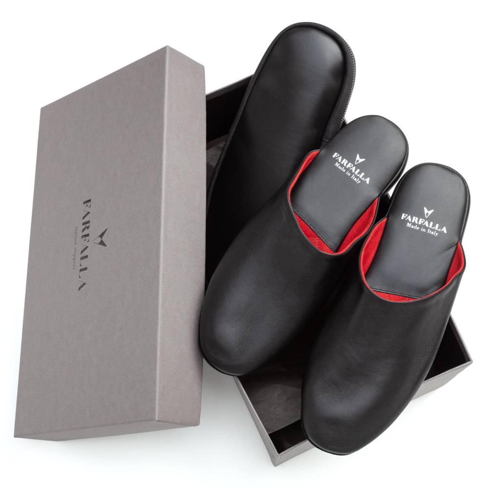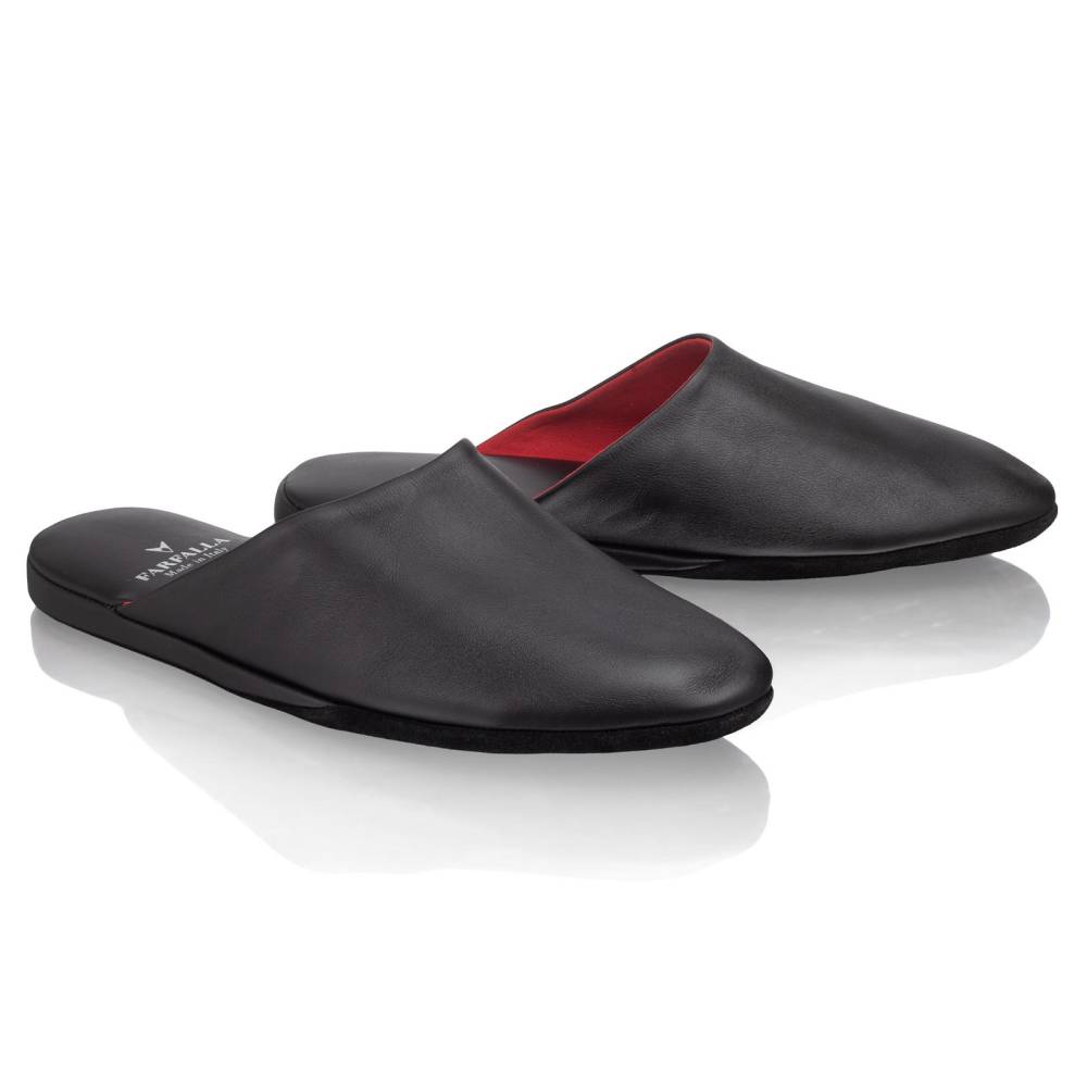 Тапочки-мюли итальянского бренда Farfalla, изготовленные вручную по специальному заказу (Made to Order) эксклюзивно для бутика Checkroom. Классический силуэт Slip‑on, который легко носить и который неподвластен времени. Модель с мягкой подошвой, конструкция которой восходит к XIV веку. Многовековая техника заключается в сшивании двух кусков материала и последующем ручном выворачивании наизнанку. Это позволяет скрыть шов внутри, что является свидетельством высочайшего мастерства и уникальности конструкции. Мягкая натуральная телячья кожа чёрного цвета снаружи и подкладка из натуральной замши красного цвета. Гибкая замшевая подошва с простёганной стелькой обеспечивает естественную гибкость и комфорт. Жёсткая невысокая танкетка с мягким наполнителем, гарантирует поддержку стопы. Благодаря кожаному дорожному чехлу на молнии, удобно брать с собой в путешествия.