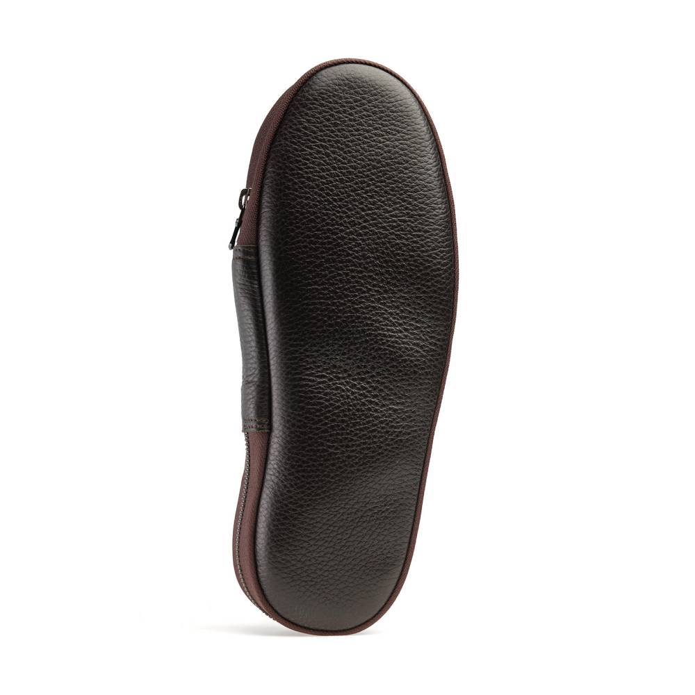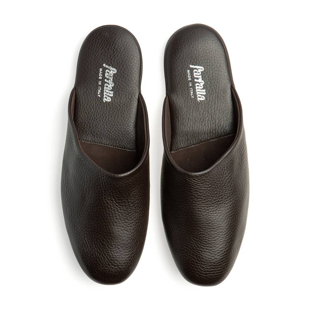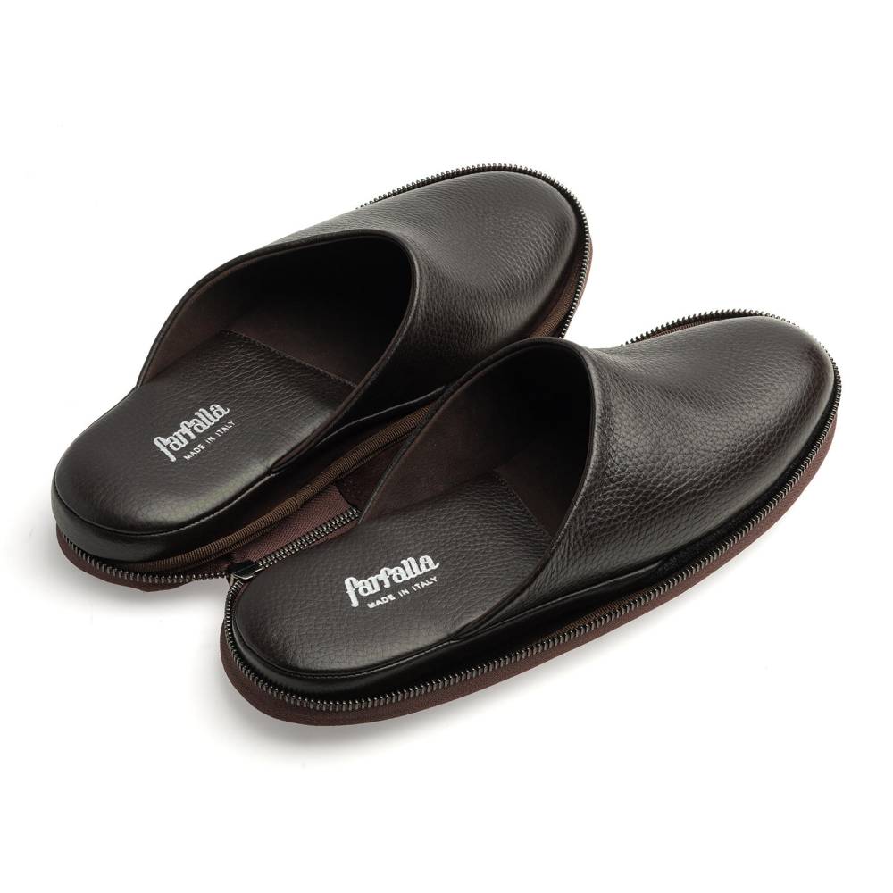 Тапки ручной работы Farfalla из зернистой кожи тёмно-коричневого цвета. Благодаря мягкости материала, тапки прекрасно облегают стопу, обеспечивая абсолютный комфорт. Особенность модели заключается в удобной конструкции пяточной области: жёсткая невысокая танкетка и мягкий наполнитель непосредственно под пяткой. Плотная влагоустойчивая подошва из телячьей кожи с полиуретановой крошкой. Внутри отделка из натуральной замши. К тапкам прилагается кожаная сумка на молнии, которую удобно брать в путешествия.