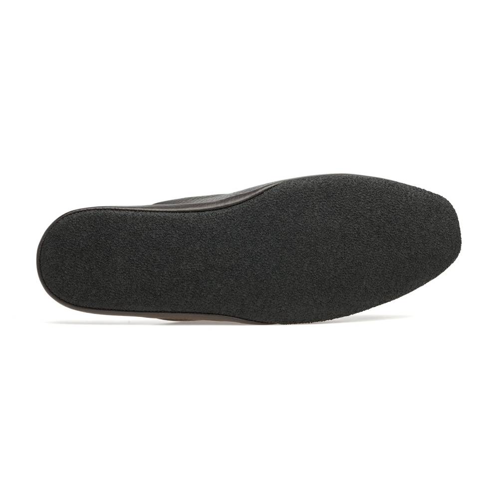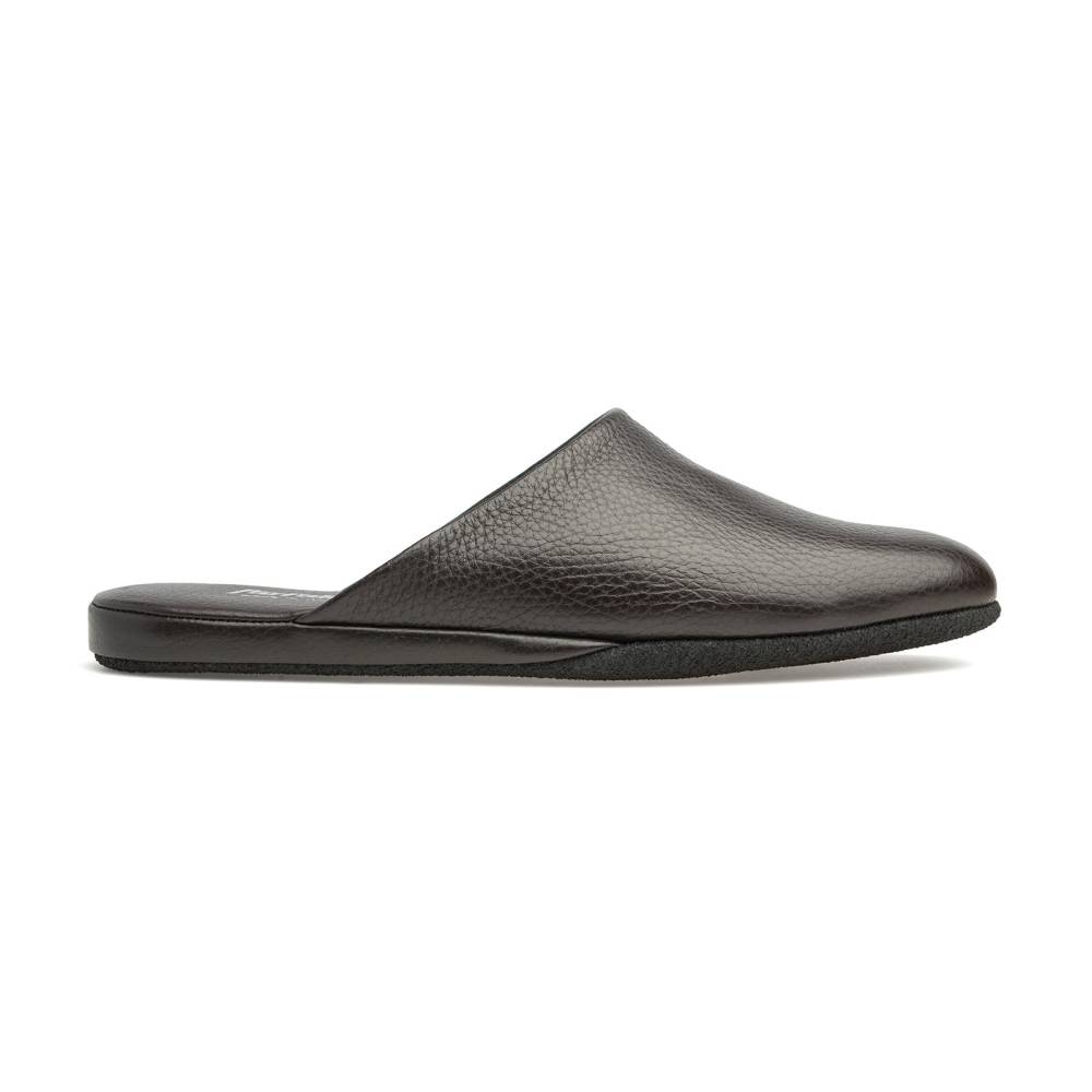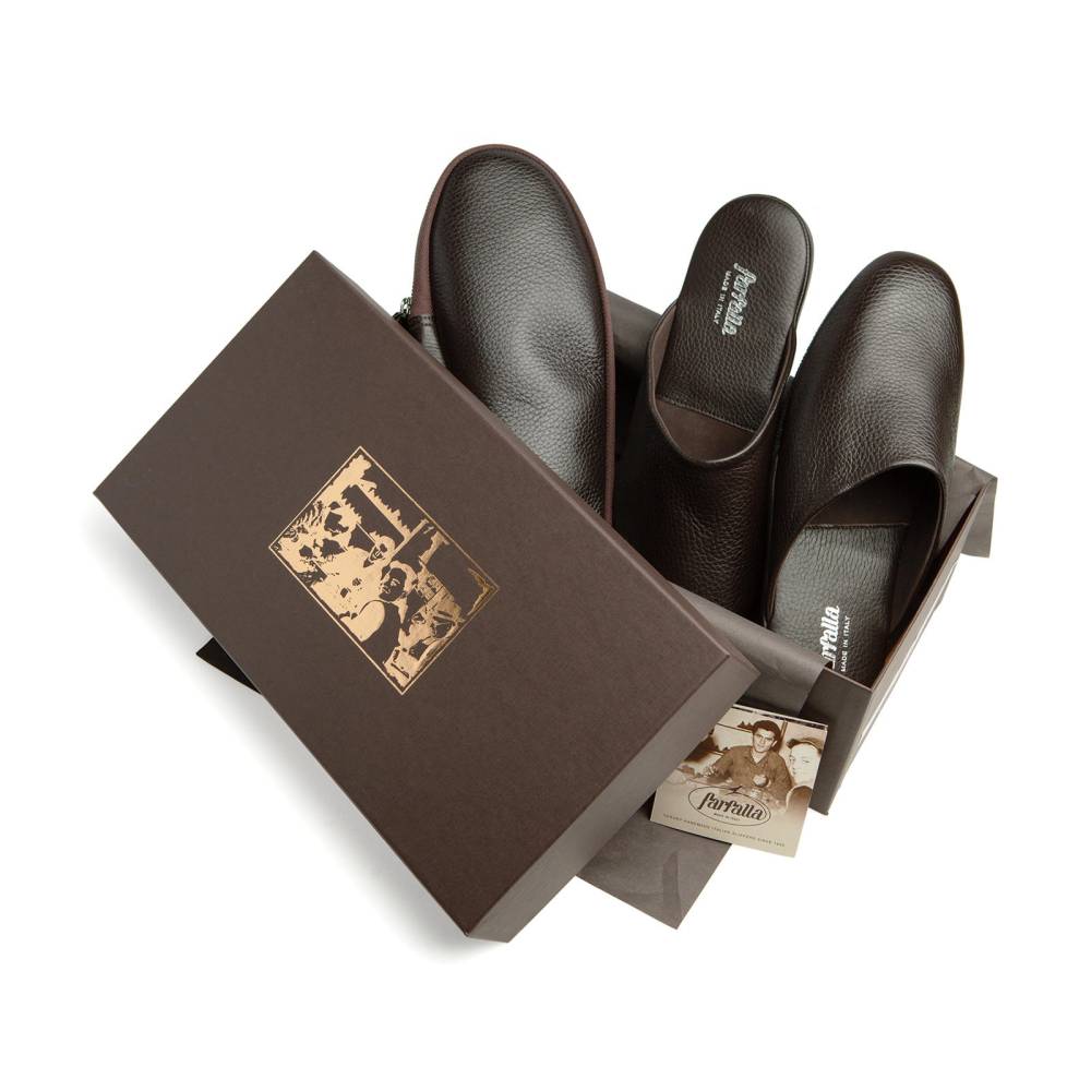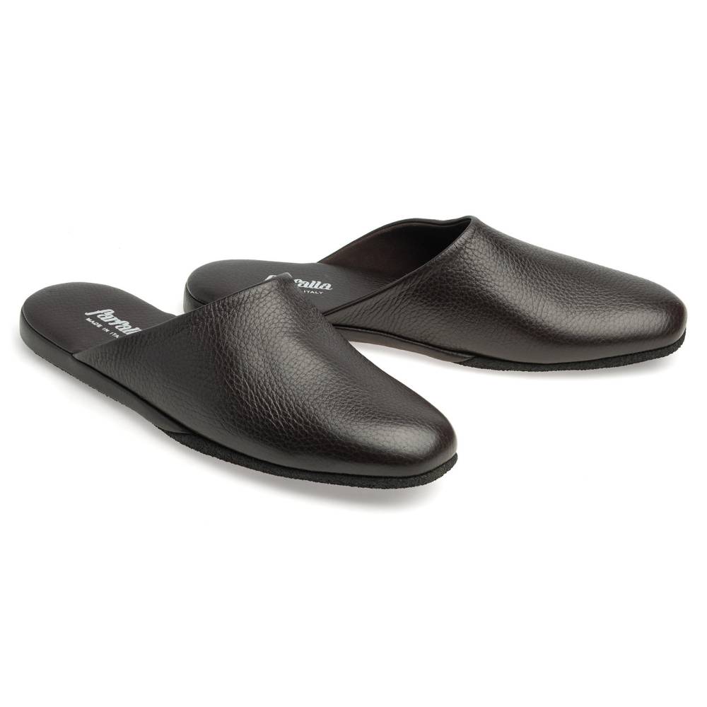 Тапки ручной работы Farfalla из зернистой кожи тёмно-коричневого цвета. Благодаря мягкости материала, тапки прекрасно облегают стопу, обеспечивая абсолютный комфорт. Особенность модели заключается в удобной конструкции пяточной области: жёсткая невысокая танкетка и мягкий наполнитель непосредственно под пяткой. Плотная влагоустойчивая подошва из телячьей кожи с полиуретановой крошкой. Внутри отделка из натуральной замши. К тапкам прилагается кожаная сумка на молнии, которую удобно брать в путешествия.