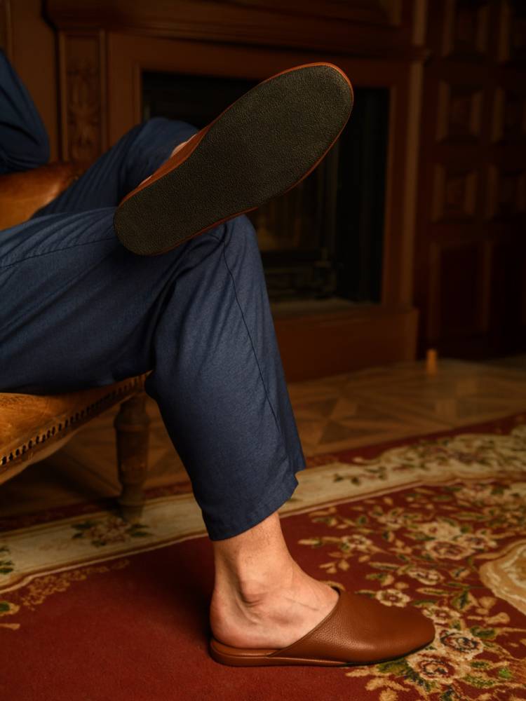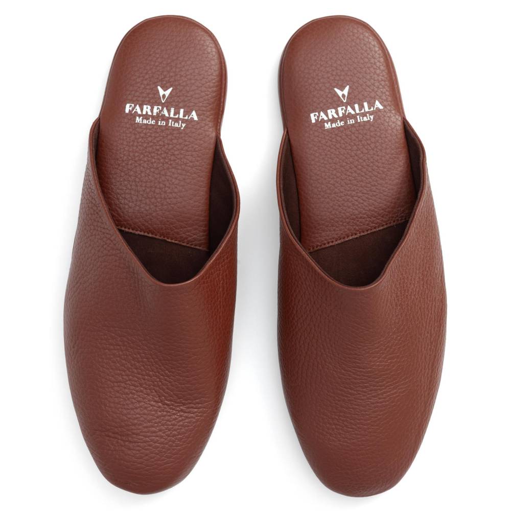 Тапочки-мюли итальянского бренда Farfalla, изготовленные вручную. Классический силуэт Slip‑on, который легко носить и который неподвластен времени. Модель с мягкой подошвой, конструкция которой восходит к XIV веку. Многовековая техника заключается в сшивании двух кусков материала и последующем ручном выворачивании наизнанку. Это позволяет скрыть шов внутри, что является свидетельством высочайшего мастерства и уникальности конструкции. Верх из мягкой натуральной кожи оленя коричневого цвета с зернистой фактурой. Внутри подкладка из натуральной замши. Гибкая подошва из телячьей кожи с полиуретановой крошкой. Жёсткая танкетка с мягким наполнителем, гарантирует поддержку стопы. В комплекте прилагается кожаная сумка на молнии, которую удобно брать в командировки или путешествия.