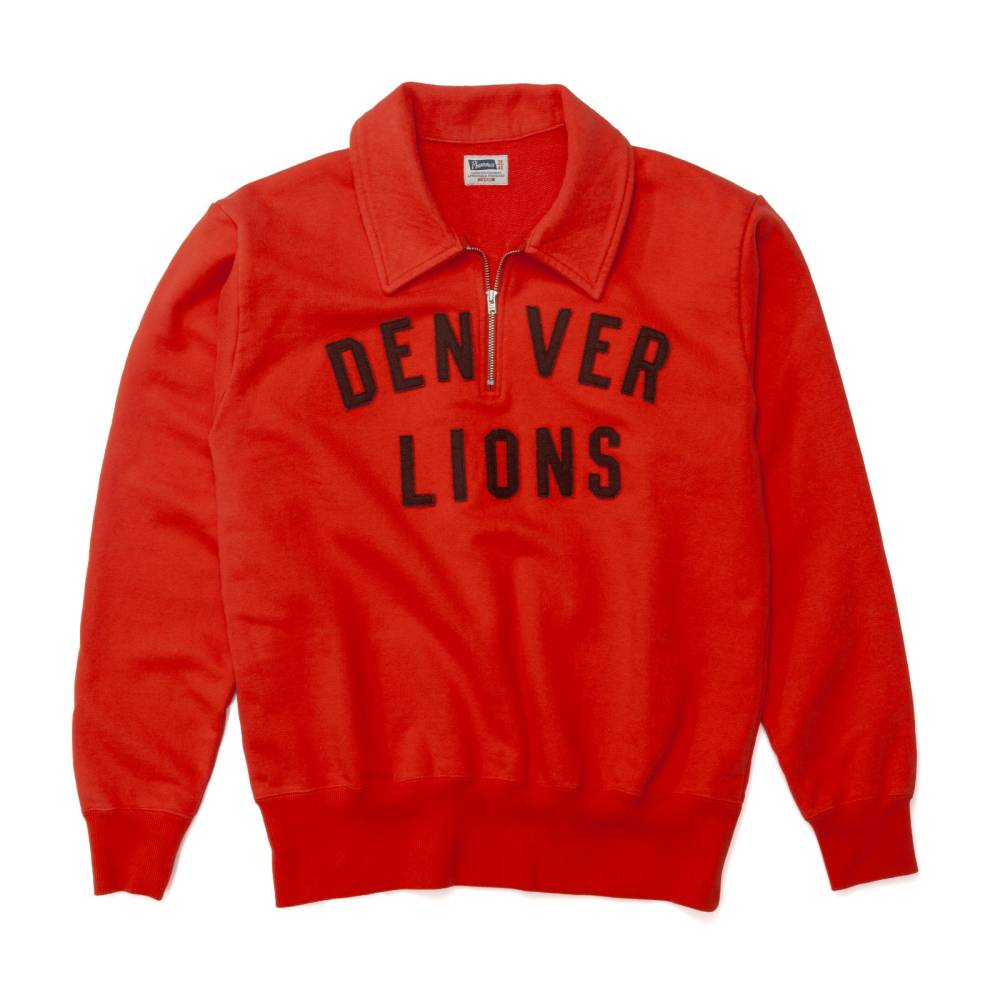Грудь украшена объемной аппликацией несуществующего в реальности спортивного клуба «DENVER LIONS», выполненной в традиционном стиле американских колледжей. Застежка-молния позволяет варьировать образ: от строгого закрытого воротника до расслабленного стиля с открытой футболкой или рубашкой под низом. Это идеальный средний слой для многослойных образов в стиле casual или heritage.