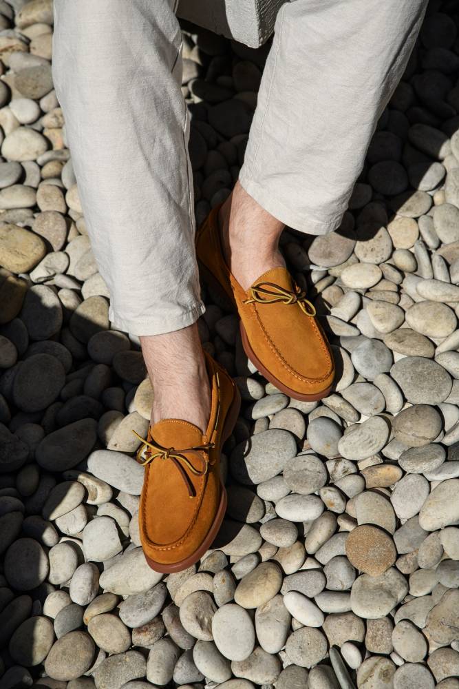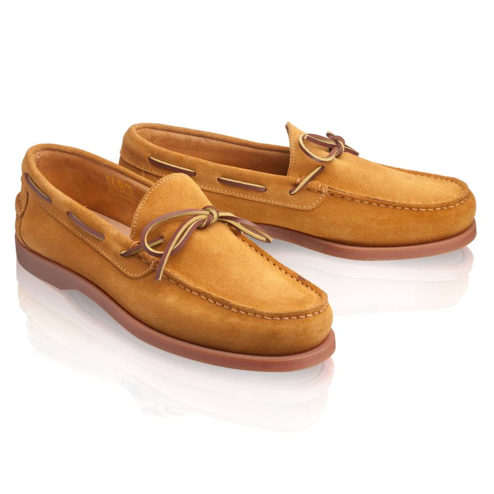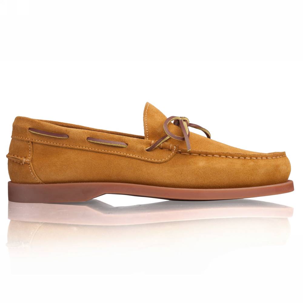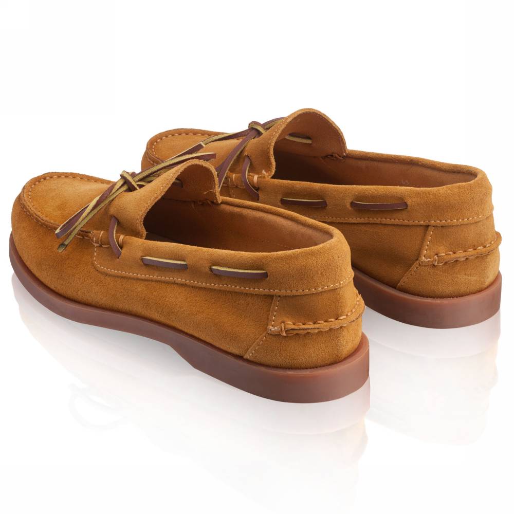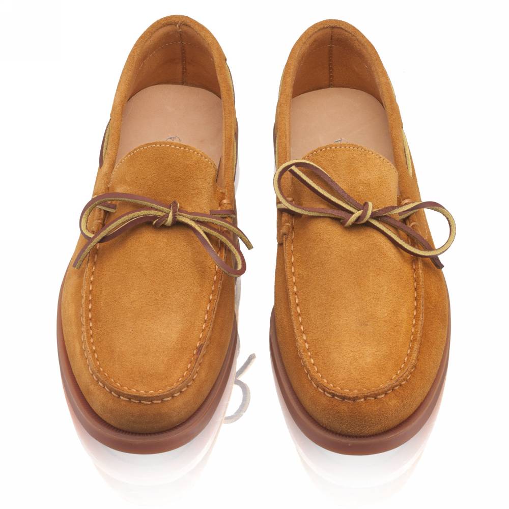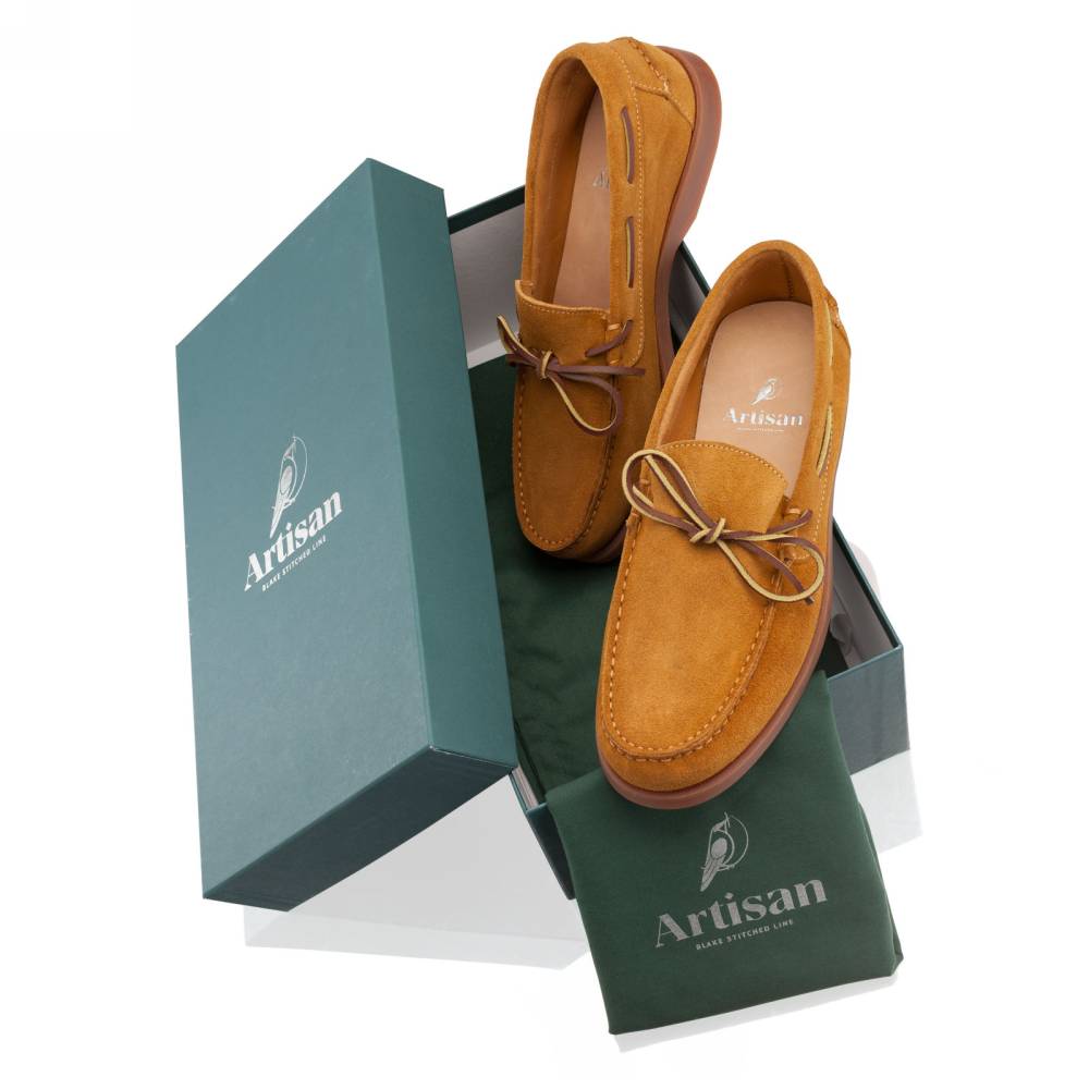 Удобные топсайдеры Knot бренда Artisan из мягкой замши светло-коричневого цвета. Модель представляет собой традиционный вариант комфортной и практичной обуви для прогулок под парусом. Прочные ассоциации с морем не отменяют того, что топсайдеры уместны и в городских условиях. Они уже давно обосновалась в базовом мужском гардеробе и полюбились поклонникам стиля casual. Пара снабжена гибкой резиновой подошвой. Верх дополнен кожаным шнурком, завязывающимся на подъёме. Конструкция Blake.