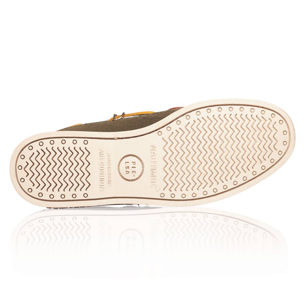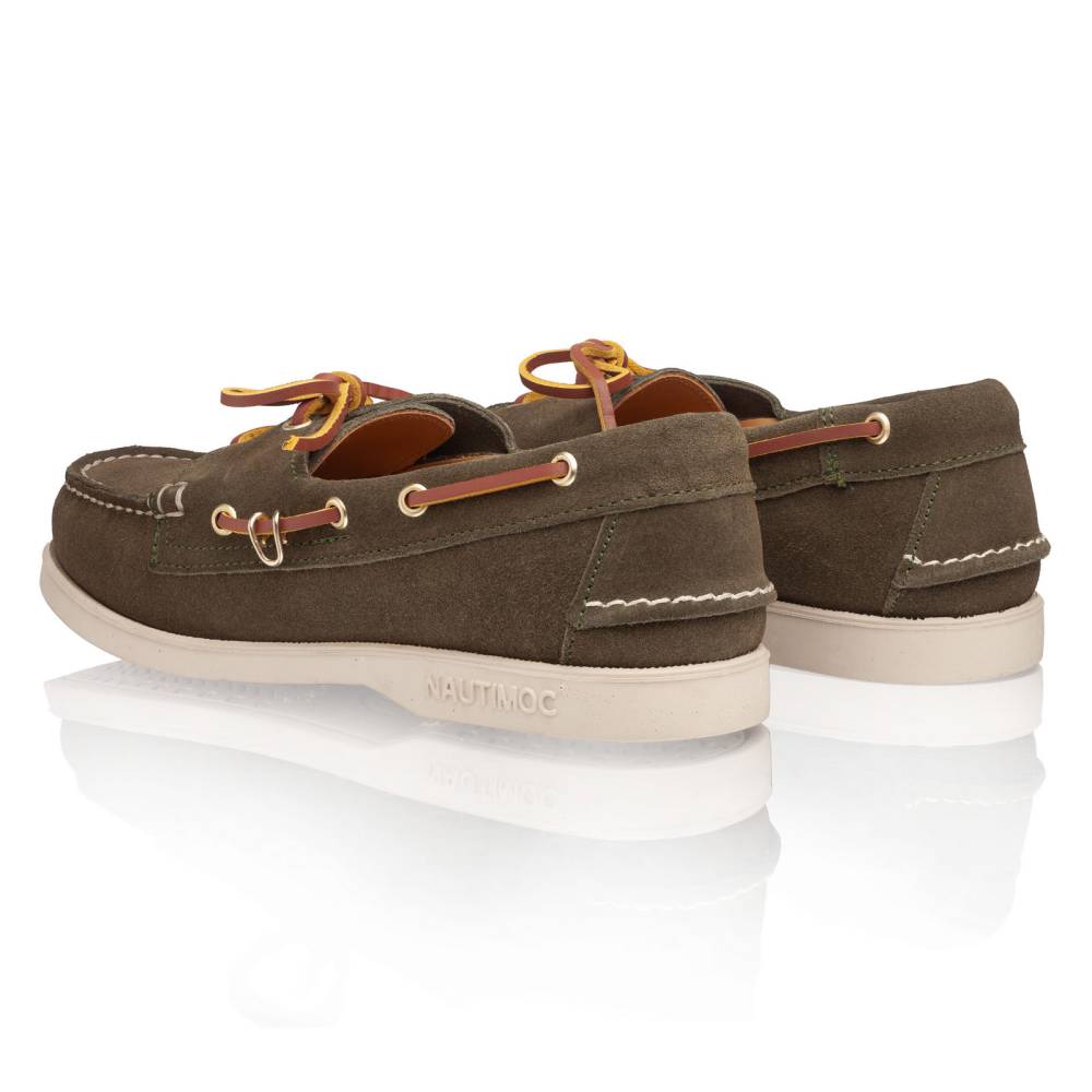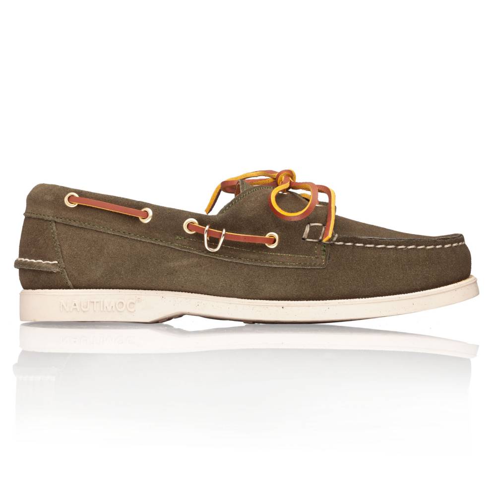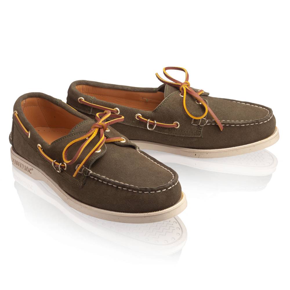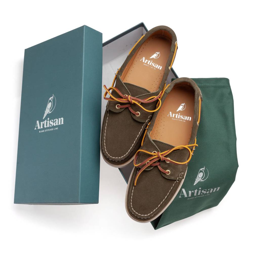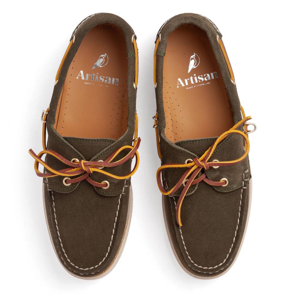 Классические топсайдеры Regata бренда Artisan из коллекции Blake stitched line. Выполнены из приятной на ощупь замши зелёного цвета. Подкладка из кожи растительного дубления. Модель представляет собой традиционный вариант удобной и практичной обуви для прогулок под парусом. Прочные ассоциации с морем не отменяют того, что топсайдеры практичны и уместны в городских условиях. Они уже давно обосновалась в базовом мужском гардеробе и полюбились поклонникам стиля casual. Пара снабжена гибкой резиновой подошвой. Верх дополнен кожаным шнурком, завязывающимся на подъёме. Мокасинный шов выполнен вручную.