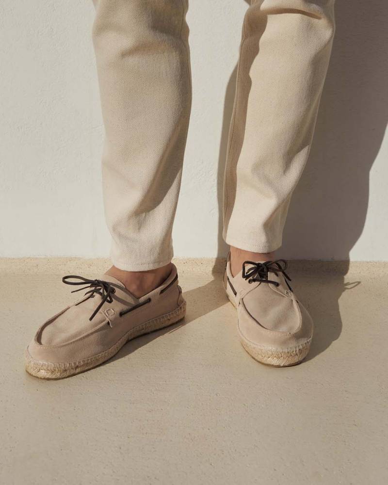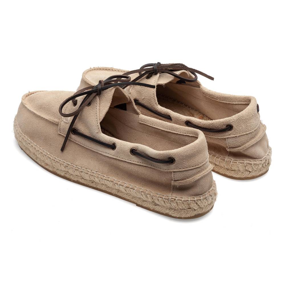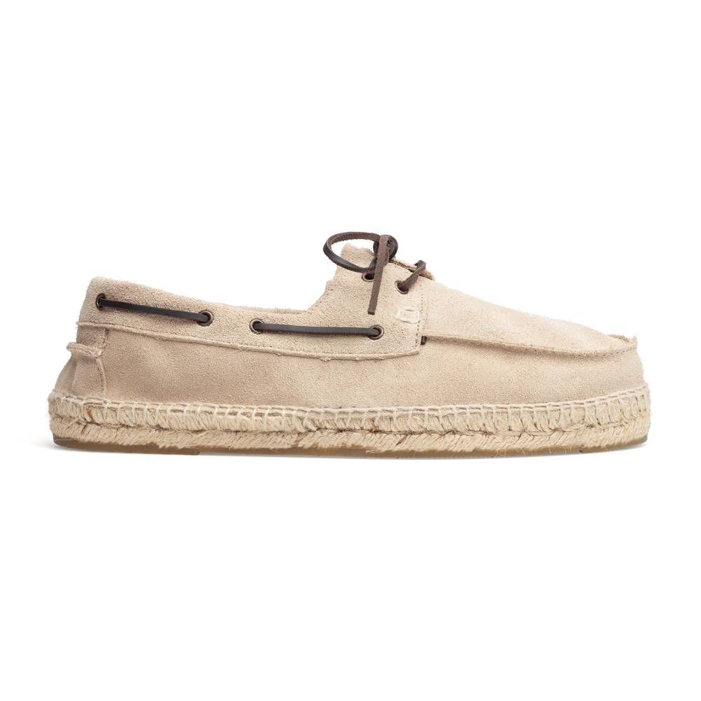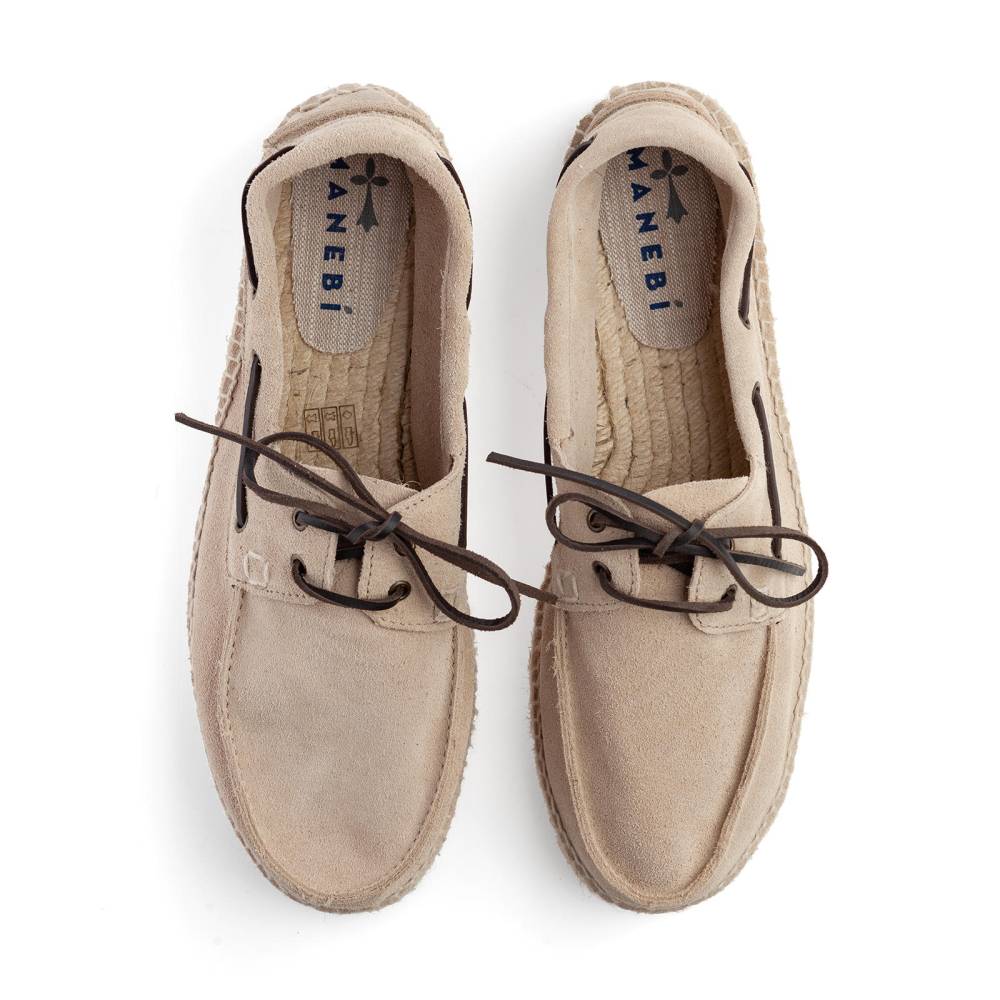 Мужские топсайдеры Manebi созданы из качественных натуральных материалов. Верх выполнен из мягкой бежевой замши. Подошва состоит из нескольких слоёв джута - натурального волокнистого материала, используемого для производства мешков и канатов. Благодаря джуту обувь имеет высокую воздухопроницаемость и идеально подходит даже для самой жаркой погоды. От влаги и изнашивания джутовую подошву защищает тонкий слой натурального каучука.