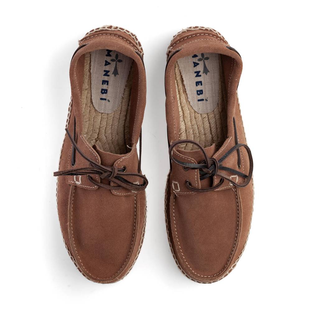 Мужские топсайдеры Manebi созданы из качественных натуральных материалов. Верх выполнен из мягкой коричневой замши. Подошва состоит из нескольких слоёв джута - натурального волокнистого материала, используемого для производства мешков и канатов. Благодаря джуту обувь имеет высокую воздухопроницаемость и идеально подходит даже для самой жаркой погоды. От влаги и изнашивания джутовую подошву защищает тонкий слой натурального каучука.