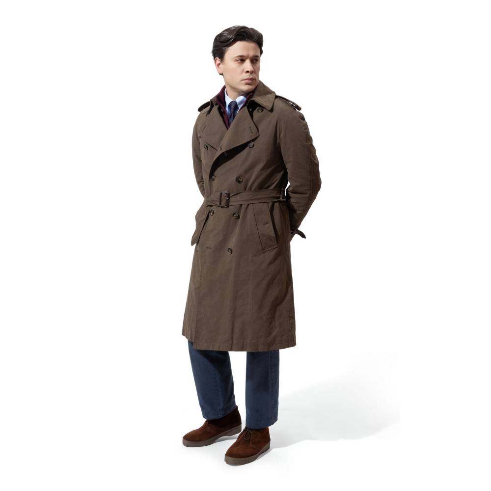 Мужской тренч итальянского бренда L`impermeabile коричневого цвета с оливковым оттенком. Модель сшита из комбинированной водоотталкиващей ткани, в состав которой входят хлопок, полиэстер и нейлон. Универсальная и практичная модель комфортного кроя не стеснит движений и удачно впишется практически в любой образ (особенно в сочетании с классическим костюмом). Рукава реглан. Карманы застёгиваются на пуговицы, выполненные из качественного полимера, имитирующего рог. Подкладка из хлопка и полиэстера с фирменным клетчатым узором. Модель представляет собой классический стилизованный военный тренч с двубортной конструкцией, эполетами, ремешками на манжетах, поясом и накладкой на правом плече.