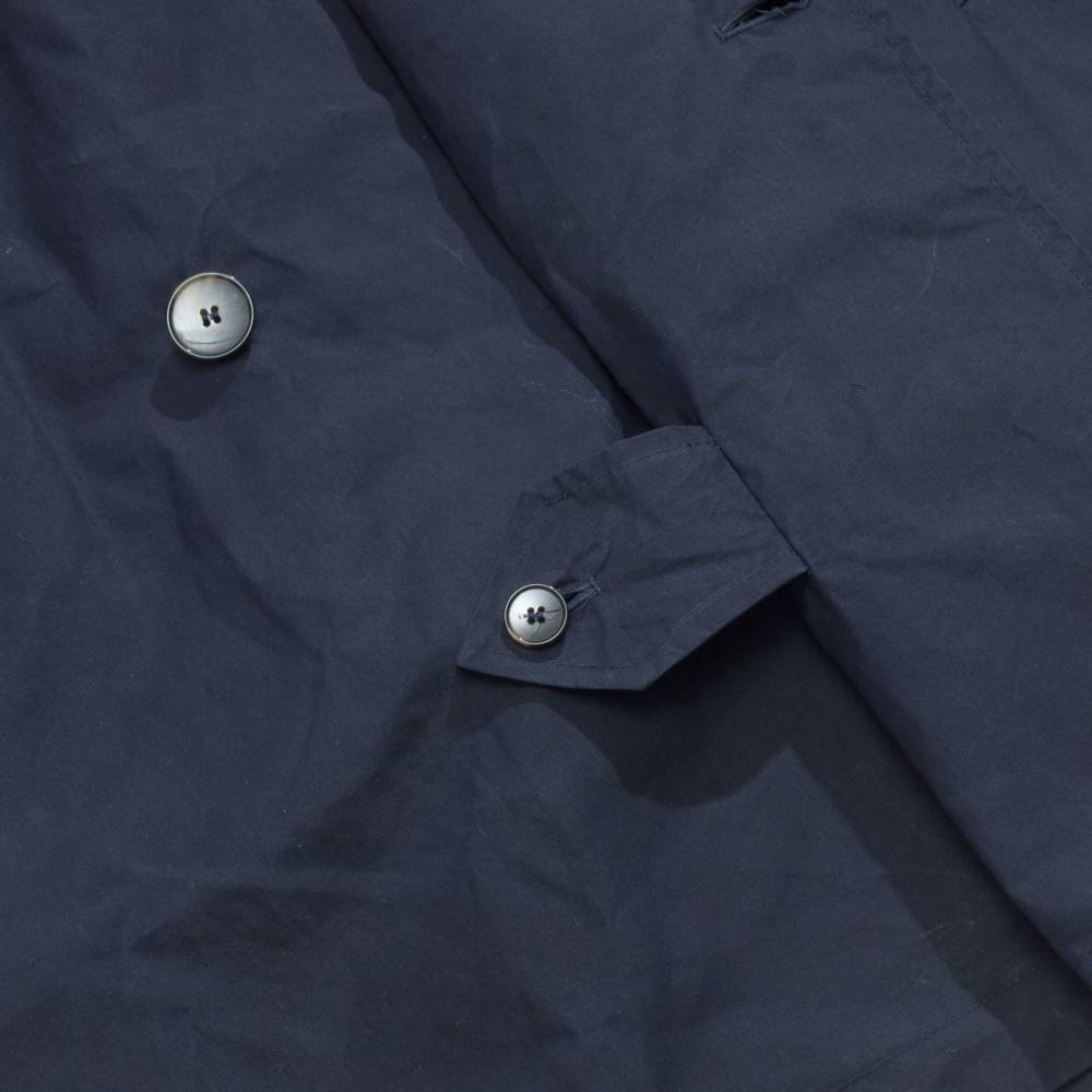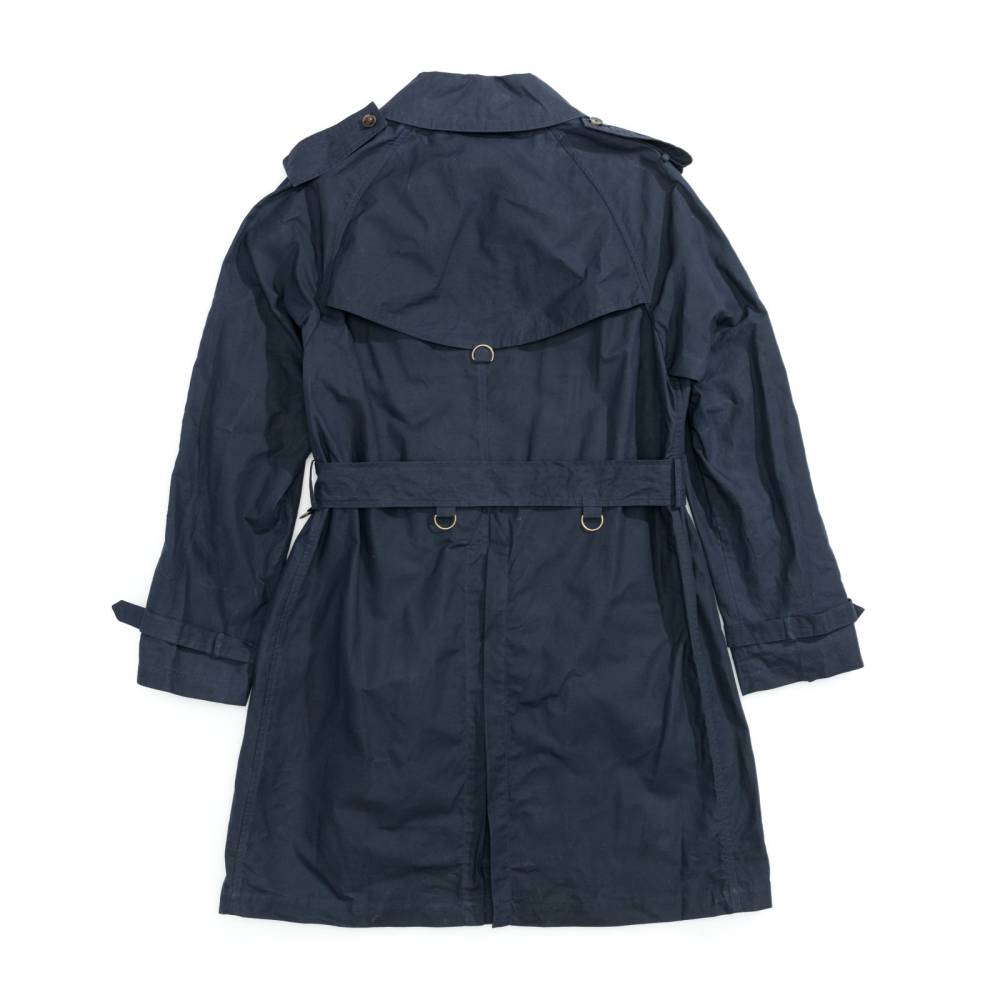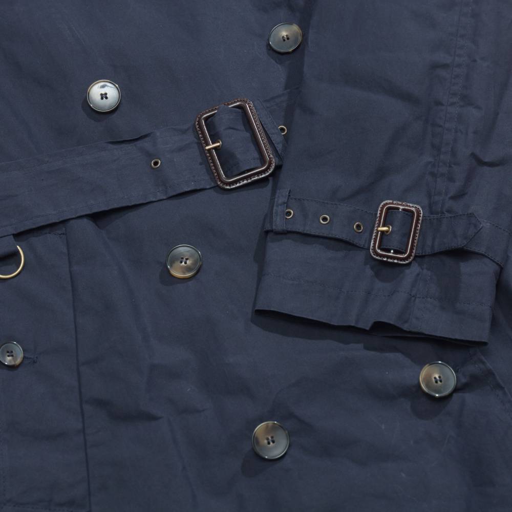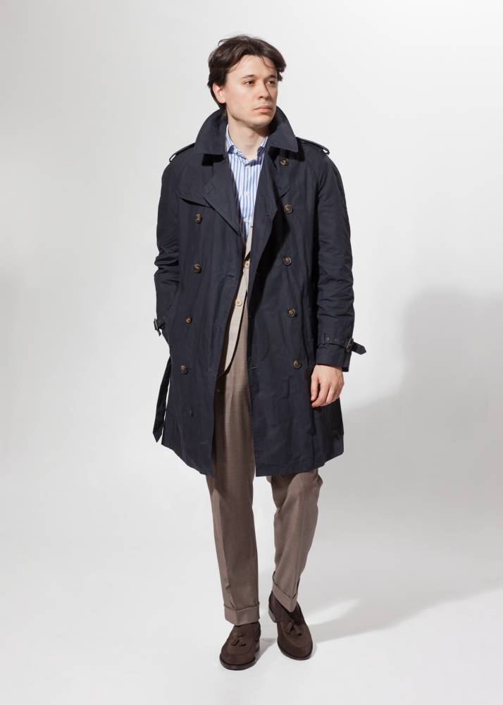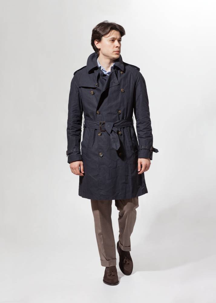 Лёгкий тёмно-синий мужской тренч итальянского бренда L`Impermeabile без подкладки. Модель сшита из 100 % хлопковой ткани, обработанной воском для большей влагостойкости. Универсальная и практичная модель комфортного кроя не стеснит движений и удачно впишется практически в любой образ (но фактура больше располагает к стилю casual). Рукава реглан. Карманы застёгиваются на пуговицы, выполненные из качественного полимера, имитирующего рог. Модель представляет собой классический стилизованный военный тренч с двубортной конструкцией, погонами, ремешками на манжетах, поясом и накладкой на правом плече.