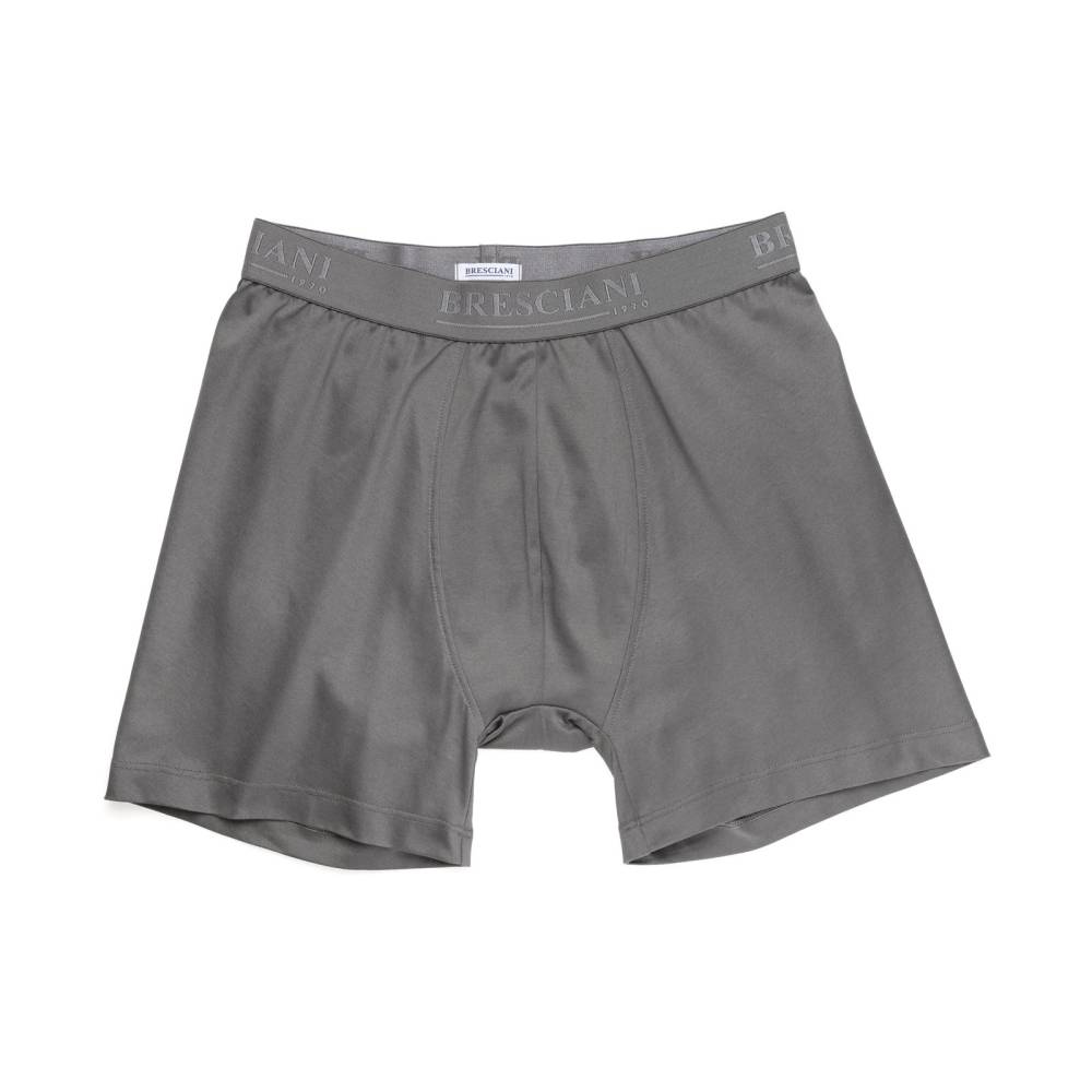 Мужские боксеры-брифы премиум-класса итальянского бренда Bresciani. Модель серого цвета изготовлена из санфоризованного экстрадлинноволокнистого египетского хлопка (санфоризованные изделия не садятся после стирки). В процессе мерсеризации с пряжи удаляются все свободные волокна, благодаря чему она становится гладкой и блестящей и дольше сохраняет первозданный вид. Швы на модели плоские и не доставляют дискомфорта. Резинка украшена вытканным названием бренда.