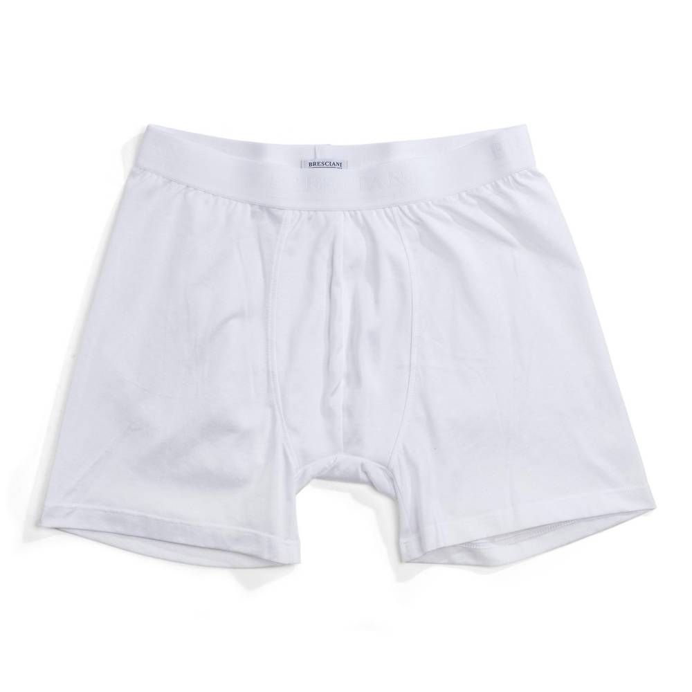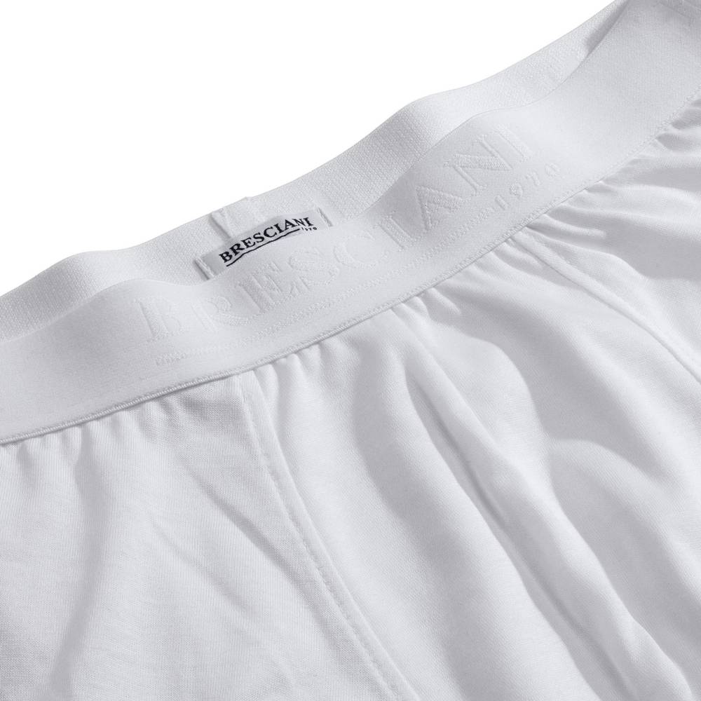 Мужские боксеры-брифы премиум-класса итальянского бренда Bresciani. Модель белого цвета изготовлена из санфоризованного экстрадлинноволокнистого египетского хлопка (санфоризованные изделия не садятся после стирки). В процессе мерсеризации с пряжи удаляются все свободные волокна, благодаря чему она становится гладкой и блестящей и дольше сохраняет первозданный вид. Швы на модели плоские и не доставляют дискомфорта. Резинка украшена вытканным названием бренда.
