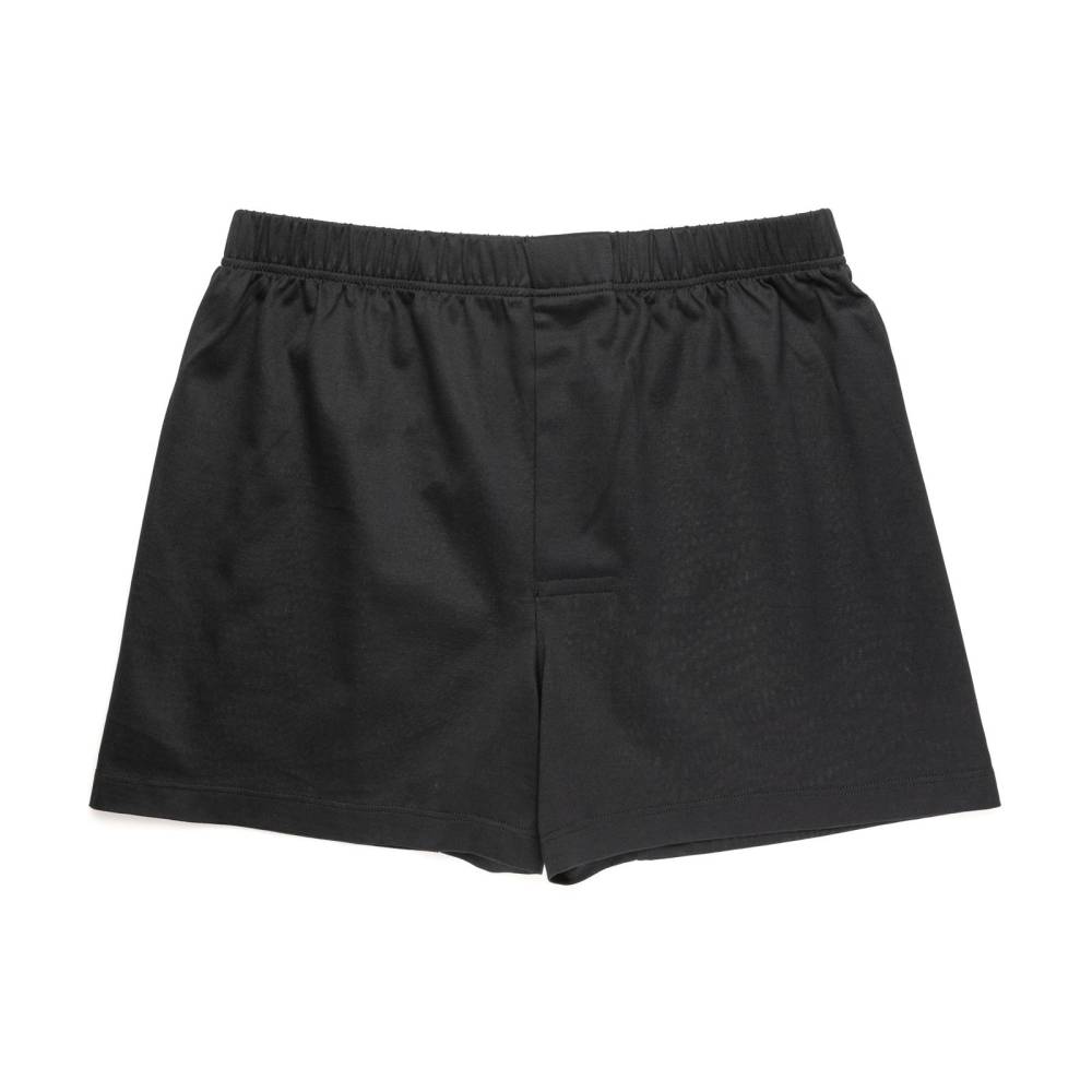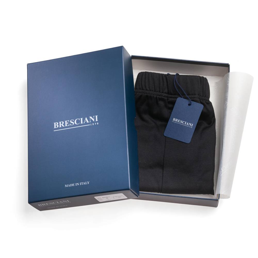Чёрные классические мужские трусы-боксеры премиум-класса итальянского бренда Bresciani. Модель изготовлена из санфоризованного экстрадлинноволокнистого египетского хлопка (санфоризованные изделия не садятся после стирки). В процессе мерсеризации с пряжи удаляются все свободные волокна, благодаря чему она становится гладкой и блестящей и дольше сохраняет первозданный вид. Швы на модели плоские и не доставляют дискомфорта. Резинка украшена вытканным названием бренда.