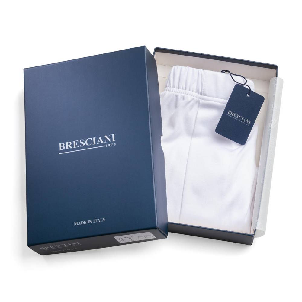 Белые классические мужские трусы-боксеры премиум-класса итальянского бренда Bresciani. Модель изготовлена из санфоризованного экстрадлинноволокнистого египетского хлопка (санфоризованные изделия не садятся после стирки). В процессе мерсеризации с пряжи удаляются все свободные волокна, благодаря чему она становится гладкой и блестящей и дольше сохраняет первозданный вид. Швы на модели плоские и не доставляют дискомфорта. Резинка украшена вытканным названием бренда.