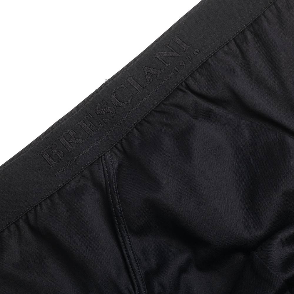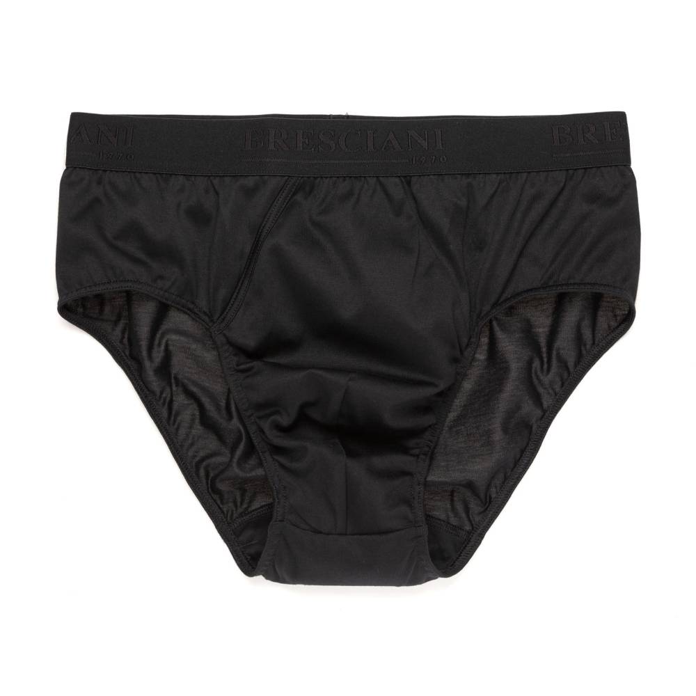 Чёрные мужские трусы-брифы премиум-класса итальянской марки Bresciani с удобным гульфиком. Модель изготовлена из санфоризованного экстрадлинноволокнистого египетского хлопка (санфоризованные изделия не садятся после стирки). В процессе мерсеризации с пряжи удаляются все свободные волокна, благодаря чему она становится гладкой и блестящей и дольше сохраняет первозданный вид. Швы на модели плоские и не доставляют дискомфорта. Резинка украшена вытканным названием бренда.
