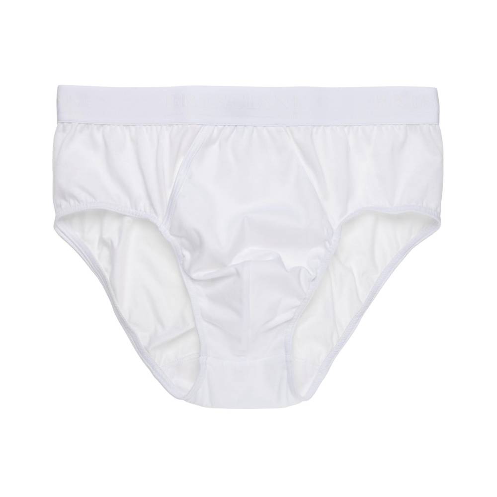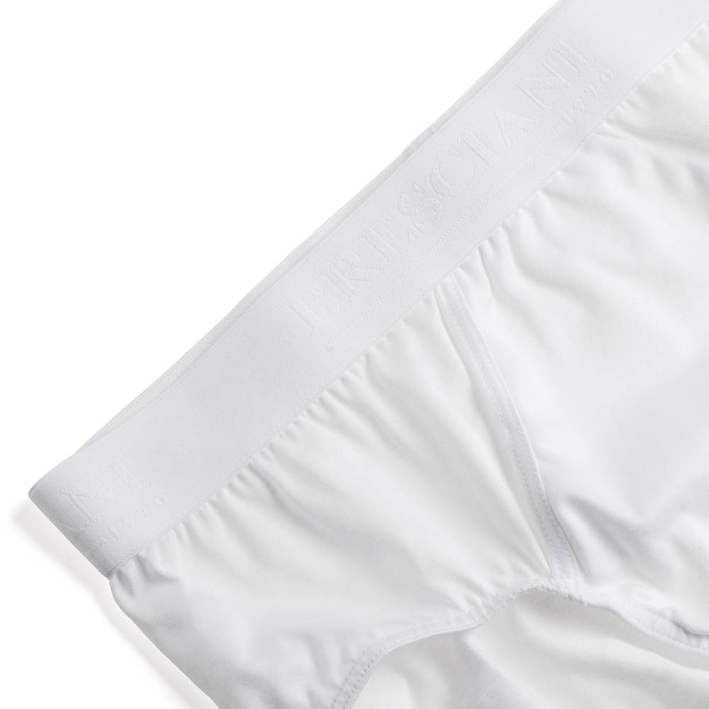 Белые мужские трусы-брифы премиум-класса итальянской марки Bresciani с удобным гульфиком. Модель изготовлена из санфоризованного экстрадлинноволокнистого египетского хлопка (санфоризованные изделия не садятся после стирки). В процессе мерсеризации с пряжи удаляются все свободные волокна, благодаря чему она становится гладкой и блестящей и дольше сохраняет первозданный вид. Швы на модели плоские и не доставляют дискомфорта. Резинка украшена вытканным названием бренда.