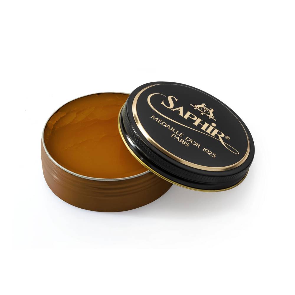 Светло-коричневая вакса High Gloss из премиальной линии Saphir Medaille d'Or 1925. Разработана специально для глянцевой полировки кожи обуви и глассажа. Представляет собой комплекс смесей на основе натурального соснового масла (терпентина), орехового масла и восьми видов восков, среди которых натуральный пчелиный воск и карнаубский воск, получаемый из экстракта бразильской пальмы. Вакса глубоко пропитывает и смягчает кожу, а также придаёт водоотталкивающие свойства.
