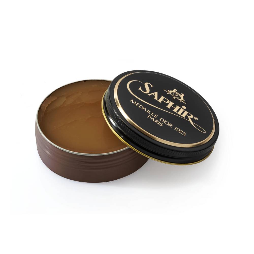 Коричневая вакса High Gloss из премиальной линии Saphir Medaille d'Or 1925. Разработана специально для глянцевой полировки кожи обуви и глассажа. Представляет собой комплекс смесей на основе натурального соснового масла (терпентина), орехового масла и восьми видов восков, среди которых натуральный пчелиный воск и карнаубский воск, получаемый из экстракта бразильской пальмы. Вакса глубоко пропитывает и смягчает кожу, а также придаёт водоотталкивающие свойства.