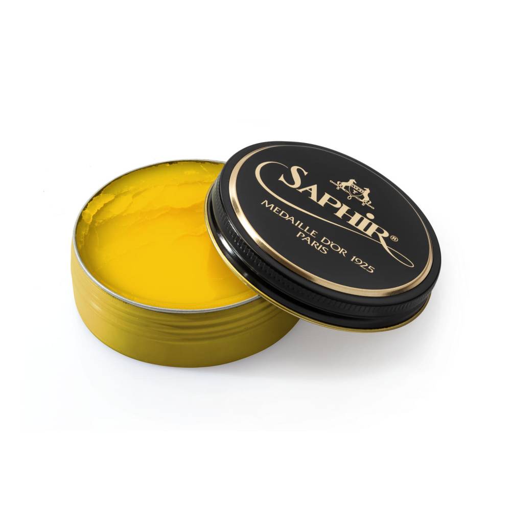 Жёлтая вакса High Gloss из премиальной линии Saphir Medaille d'Or 1925. Разработана специально для глянцевой полировки кожи обуви и глассажа. Представляет собой комплекс смесей на основе натурального соснового масла (терпентина), орехового масла и восьми видов восков, среди которых натуральный пчелиный воск и карнаубский воск, получаемый из экстракта бразильской пальмы. Вакса глубоко пропитывает и смягчает кожу, а также придаёт водоотталкивающие свойства.
