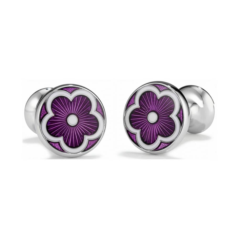 Эксклюзивные запонки от британской мануфактуры Codis Maya. Основание запонок выточено на токарном станке из меди и покрыто износостойким родием. Изготовлены полностью вручную: от выточки формы до кропотливого нанесения рисунка и финальной полировки. Глубокий фиолетовый фон и зеркальный блеск достигаются благодаря технике горячей эмали (Vitreous Enamel) — процессу обжига стекловидного порошка при сверхвысоких температурах.