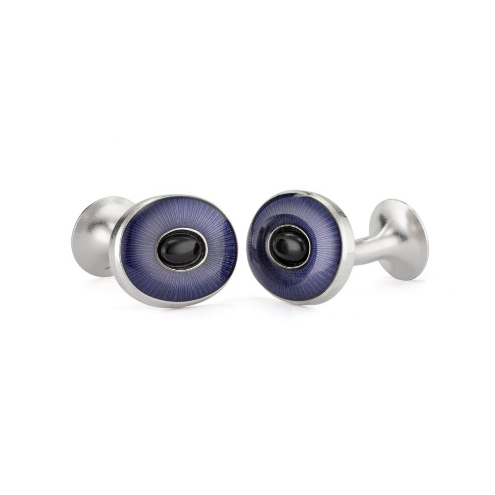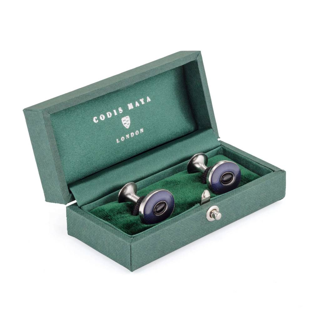 Овальные запонки лондонского бренда Codis Maya выполнены из меди, покрытой родием. Модель украшена ониксом и ювелирной эмалью синего цвета. Запонки с камнями прекрасно подойдут для торжественного мероприятия. Их рекомендуется сочетать с галстуками, сорочками или пиджаками в похожей цветовой гамме. Аксессуар представлен в фирменной коробке с внутренней отделкой из бархата и атласа.