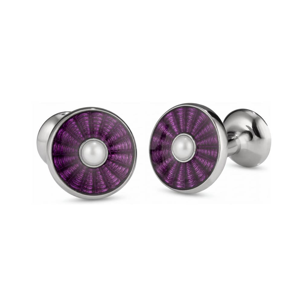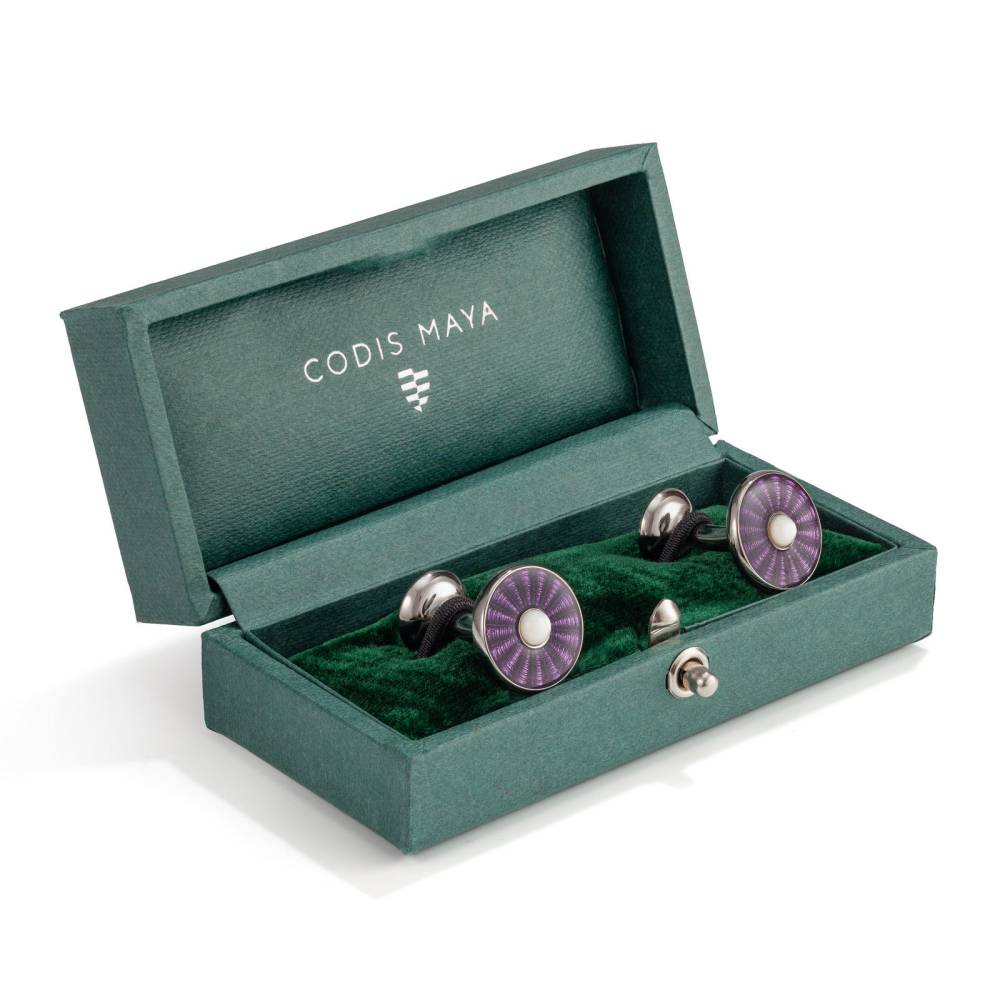 Эксклюзивные запонки от британской мануфактуры Codis Maya. Основание запонок выточено на токарном станке из меди и покрыто износостойким родием. Изготовлены полностью вручную: от выточки формы до кропотливого нанесения рисунка и финальной полировки. Глубокий фиолетовый фон и зеркальный блеск достигаются благодаря технике горячей эмали (Vitreous Enamel) — процессу обжига стекловидного порошка при сверхвысоких температурах.
