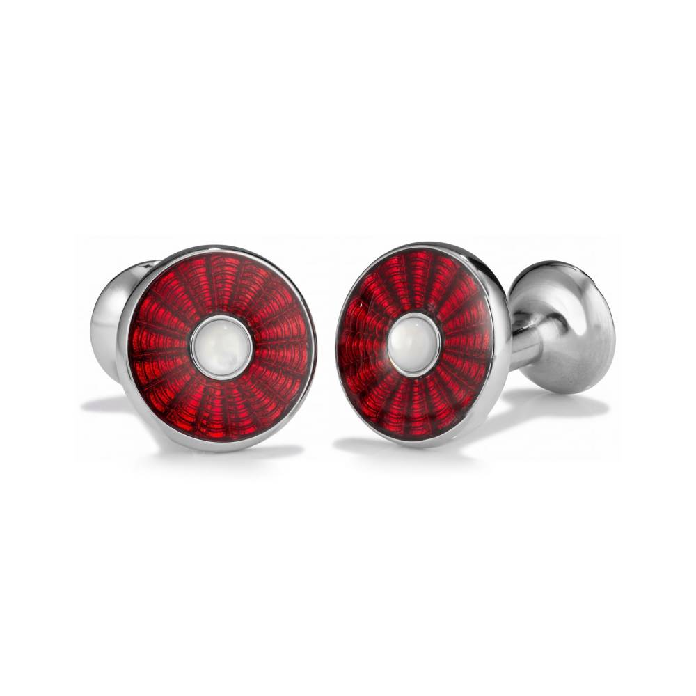 Эксклюзивные запонки от британской мануфактуры Codis Maya. Основание запонок выточено на токарном станке из меди и покрыто износостойким родием. Изготовлены полностью вручную: от выточки формы до кропотливого нанесения рисунка и финальной полировки. Глубокий бордвый фон и зеркальный блеск достигаются благодаря технике горячей эмали (Vitreous Enamel) — процессу обжига стекловидного порошка при сверхвысоких температурах.