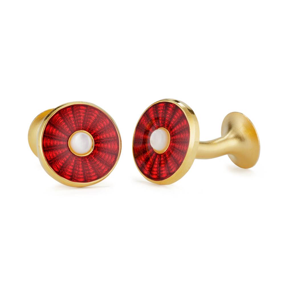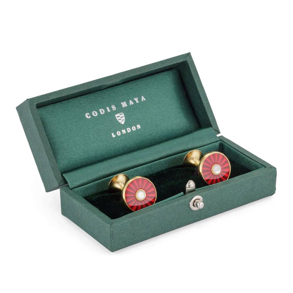 Круглые запонки английского бренда Codis Maya выполнены из позолоченной меди с характерным блеском. Модель украшена эмалевой вставкой красного цвета и перламутром. Гальваническое золочение защищает медь от потемнения и окисления. К аксессуару прилагается фирменная коробка с внутренней отделкой из бархата и атласа.