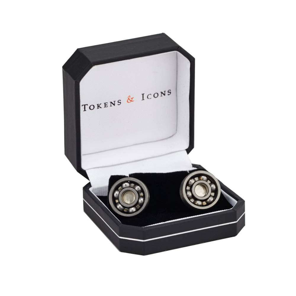 Для создания этих запонок Tokens & Icons были использованы настоящие вращающиеся шарикоподшипники. Ножка и шарнир выполнены из стерлингового серебра. К запонкам прилагаются фирменная коробка и сертификат подлинности.