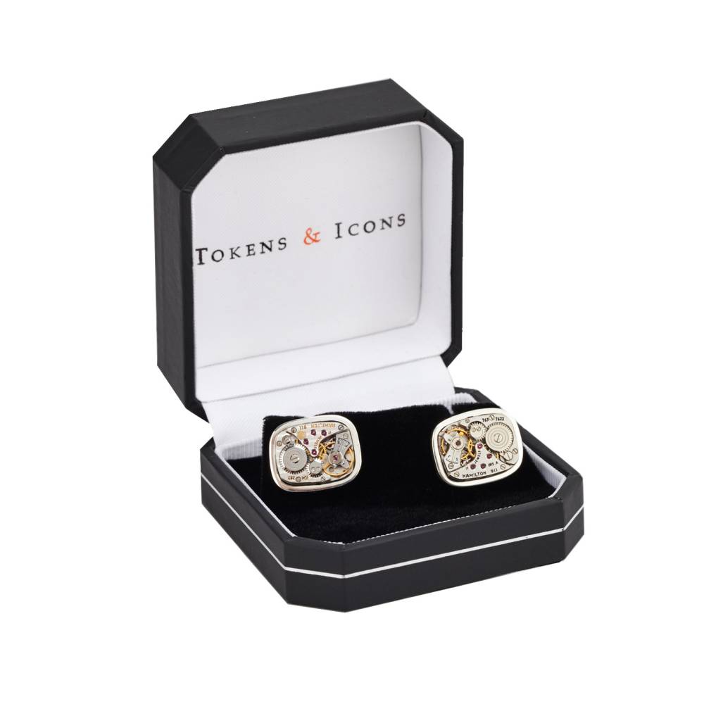 В этих великолепных запонках Tokens & Icons используются аутентичные механизмы от швейцарских часов, созданных в начале 20-го века. Перед тем как механизмы были использованы для запонок, они верно работали в течение нескольких поколений и точно показывали время. Ножка и шарнир выполнены из стерлингового серебра. К каждой паре прилагаются фирменный футляр и сертификат подлинности механизма. Запонки сделаны в США.