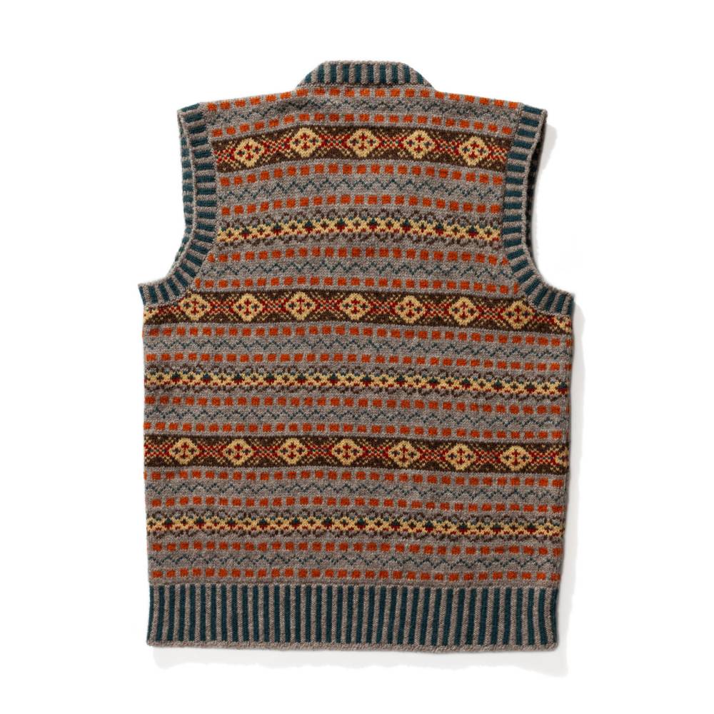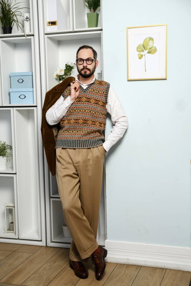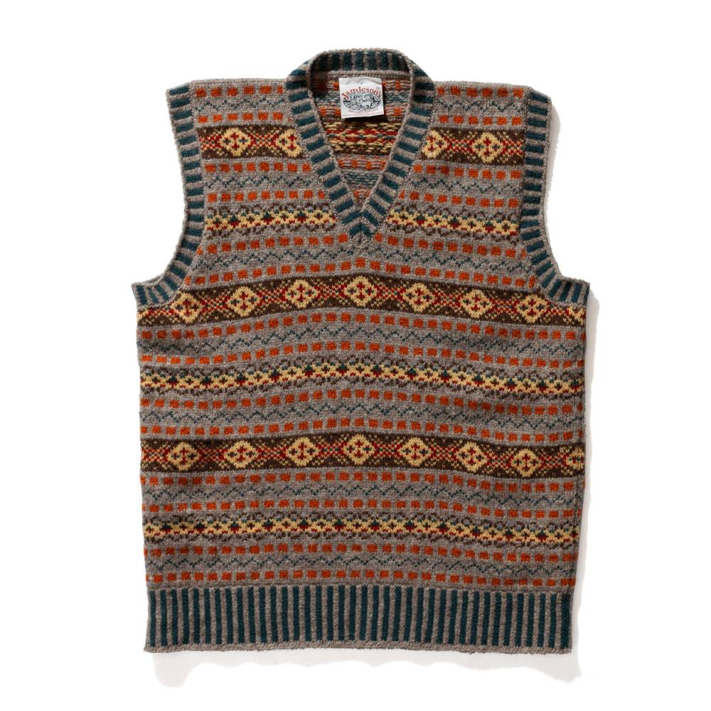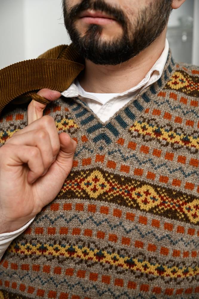 Шерстяной жилет с узором fair isle — элемент расслабленного гардероба, пришедший из английского загородного стиля. Fair isle — это народный узор с одноимённого острова у берегов Шотландии, где зародилась традиция вязать цветные свитера, шапки, шарфы и многое другое с детализированными узорами. Такой жилет одинаково хорошо сочетается и с джинсами и вощёной курткой, и с фактурными брюками, твидовыми пиджаками и пальто.