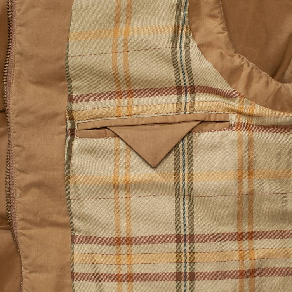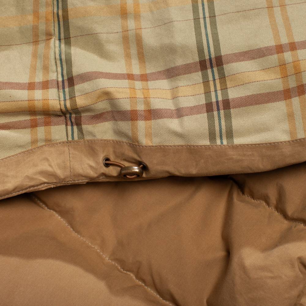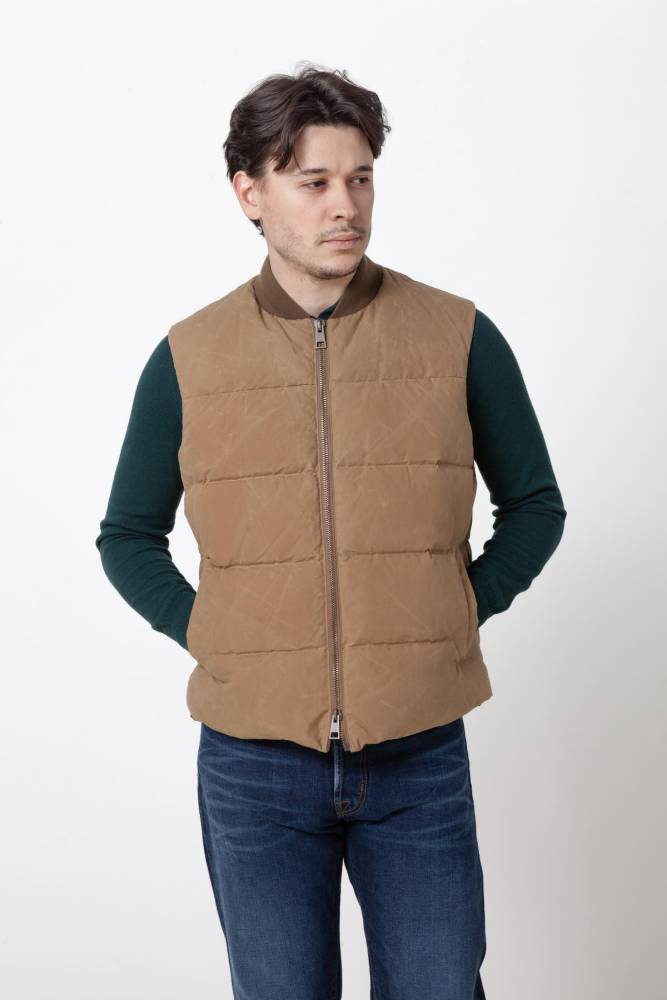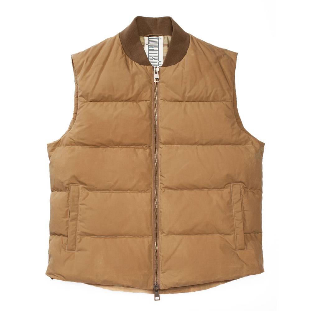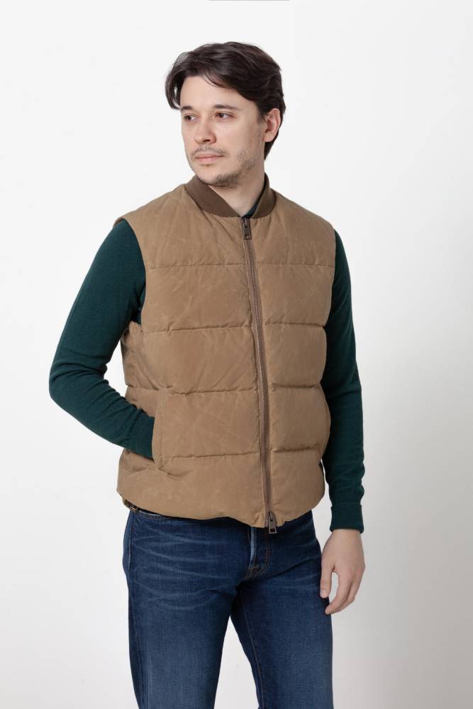 Объёмный тёплый мужской жилет Joan итальянского бренда L`Impermeabile. С внешней стороны модель выполнена из водоотталкивающей хлопковой ткани бежевого цвета, пропитанной воском. Подкладка с фирменным клетчатым принтом из тонкой ткани, в состав которой входят хлопок и полиэстер. Наполнитель: натуральный пух. Модель имеет два внешних кармана на кнопках и два внутренних кармана (на молнии и на пуговице). Низ жилета затягивается при помощи двух кулисок по бокам. Жилет прекрасно дополнит повседневный образ. Его можно удачно сочетать с джинсами, тёплыми свитерами из флиса и фланелевыми рубашками.